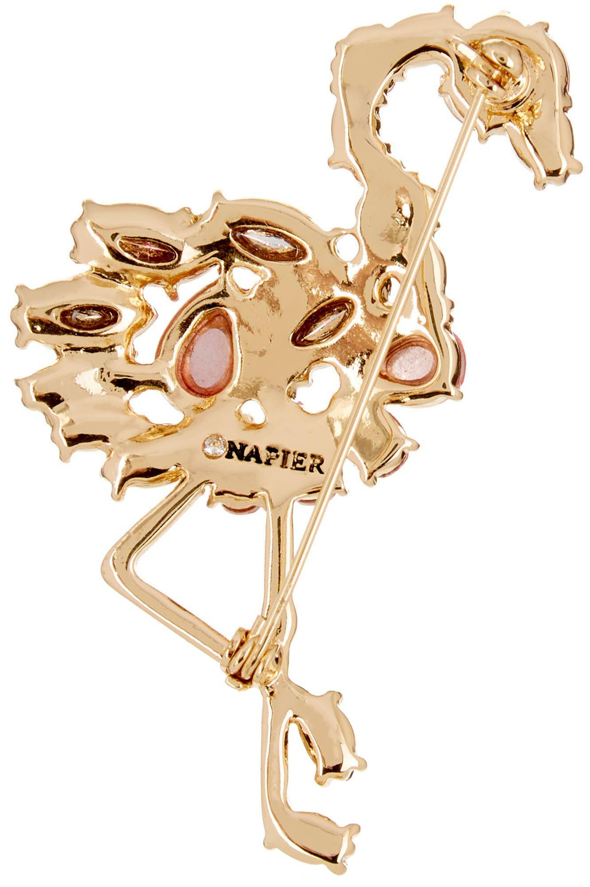 The Napier Crystal Pave Flamingo Pin is a dazzling and eye-catching brooch featuring a graceful flamingo design adorned with sparkling crystal pave accents. The intricate detailing of the flamingo, combined with the shimmering crystals, creates a vibrant and elegant piece that adds a touch of fun and sophistication to any outfit.