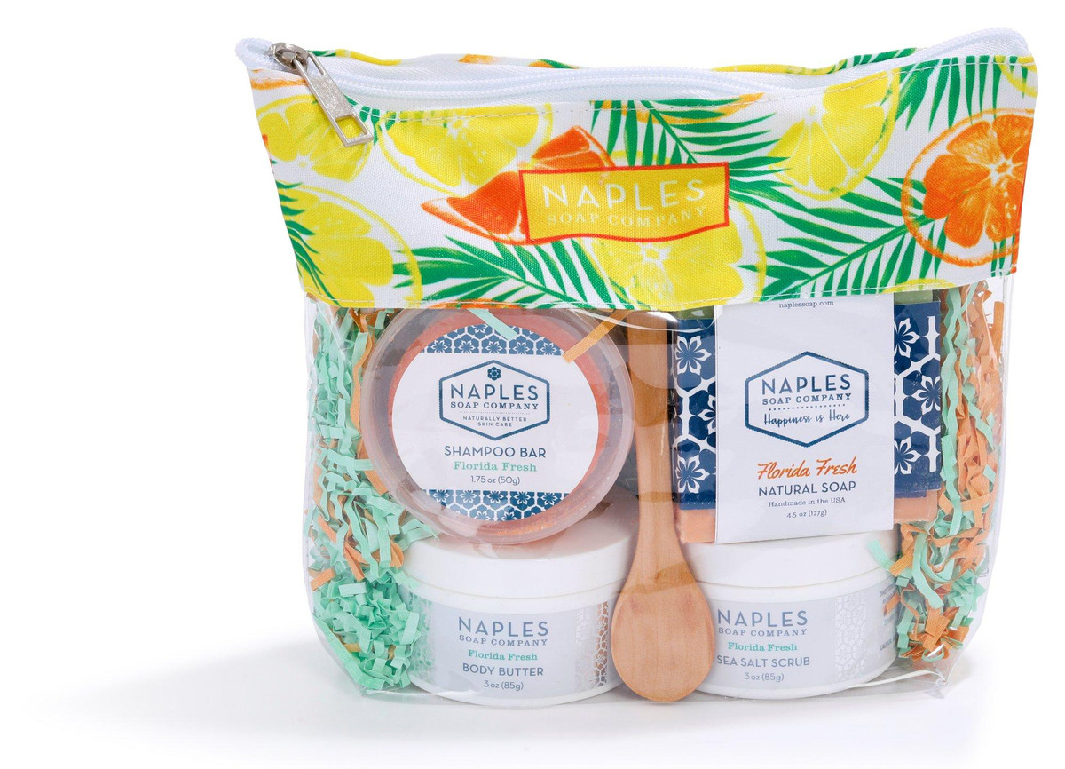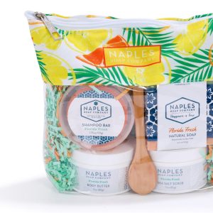 Indulge in luxurious self-care with our 4 Pc Body Care Collection. This set includes a nourishing shampoo bar, rich body butter, exfoliating sea salt scrub, and a refreshing natural soap bar, all neatly packed in a vibrant citrus print zip pouch. Perfect for pampering yourself or gifting to a loved one, this collection offers a complete spa-like experience at home. Treat your skin to the best with our all-natural, rejuvenating body care essentials.