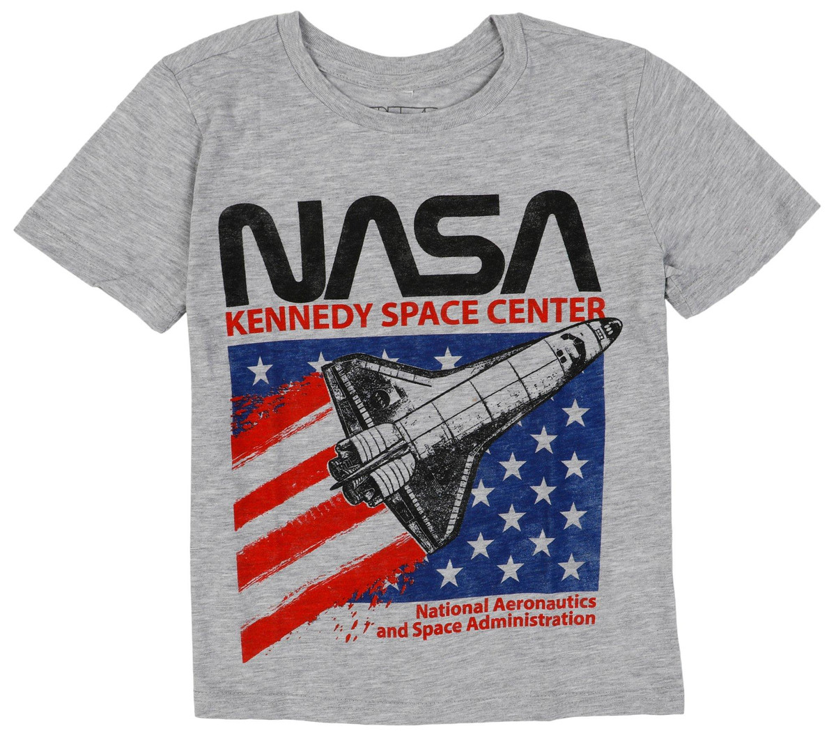 The Little Boys Americana Space Ship Graphic T-Shirt brings patriotic flair to out-of-this-world style. Made from 100% cotton, it features bold NASA script and an Americana-inspired space ship graphic for a look that’s both cool and cosmic.