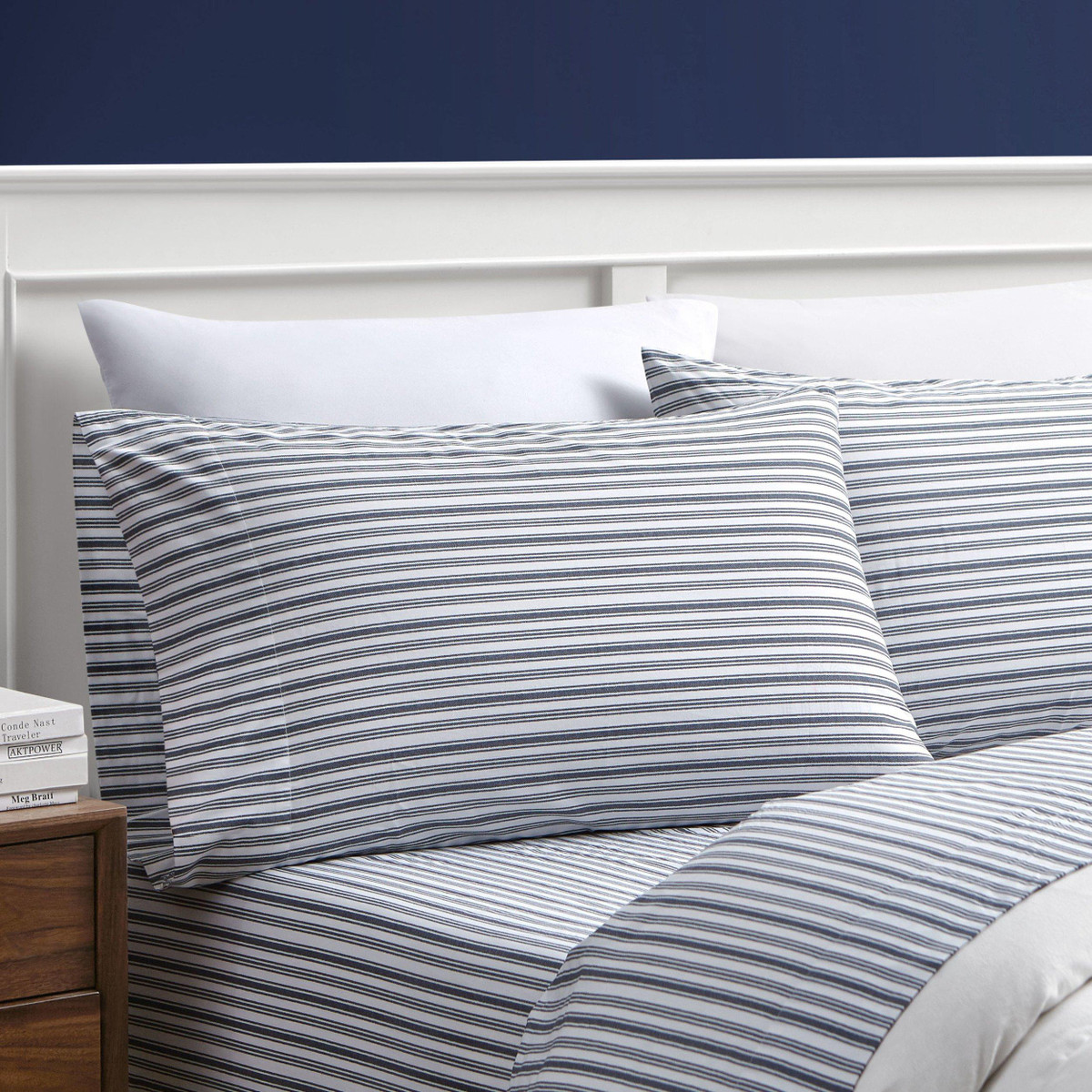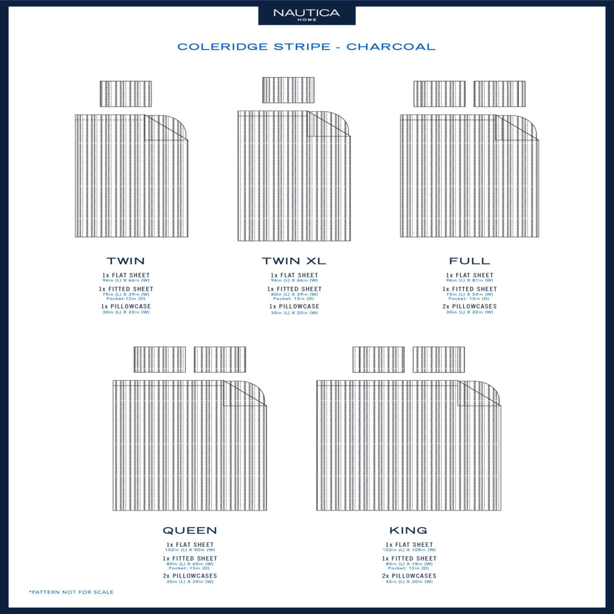 The Nautica Coleridge Stripe Sheet Set blends classic style with breathable comfort. Crafted from lightweight cotton percale, these 200 thread count sheets are cool to the touch and perfect for everyday use. The fully elasticized fitted sheet fits mattresses up to 12 in. deep, staying snug and secure. Machine washable for easy care.