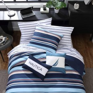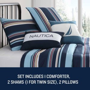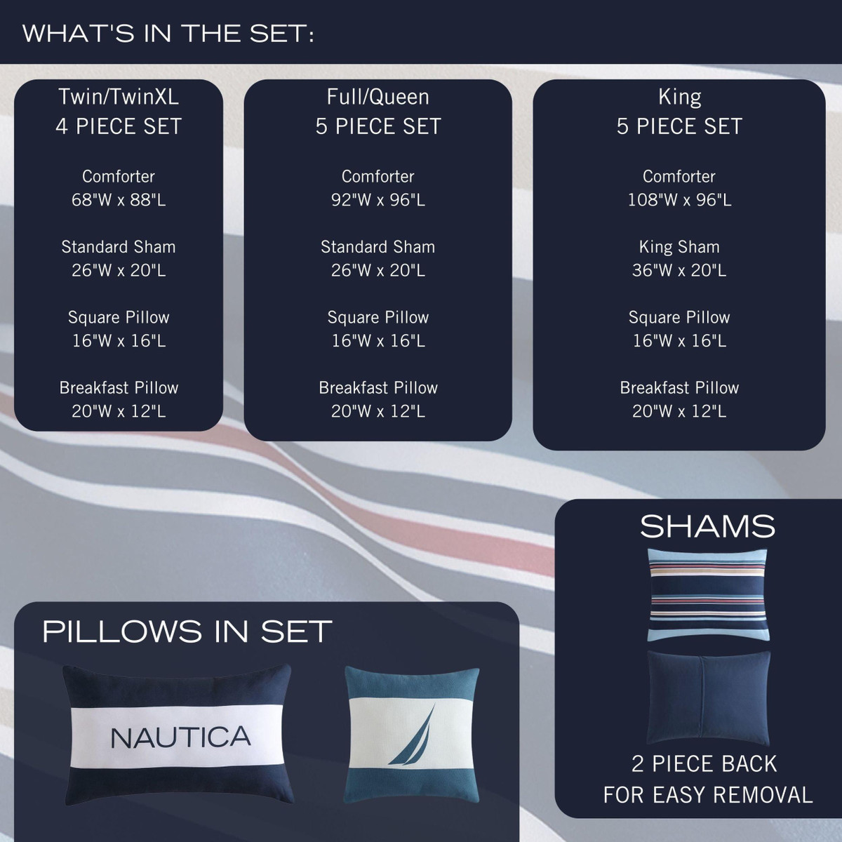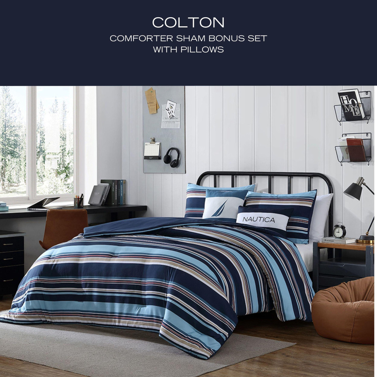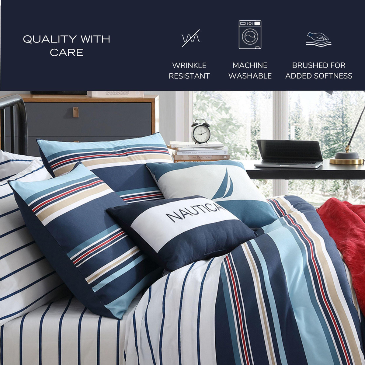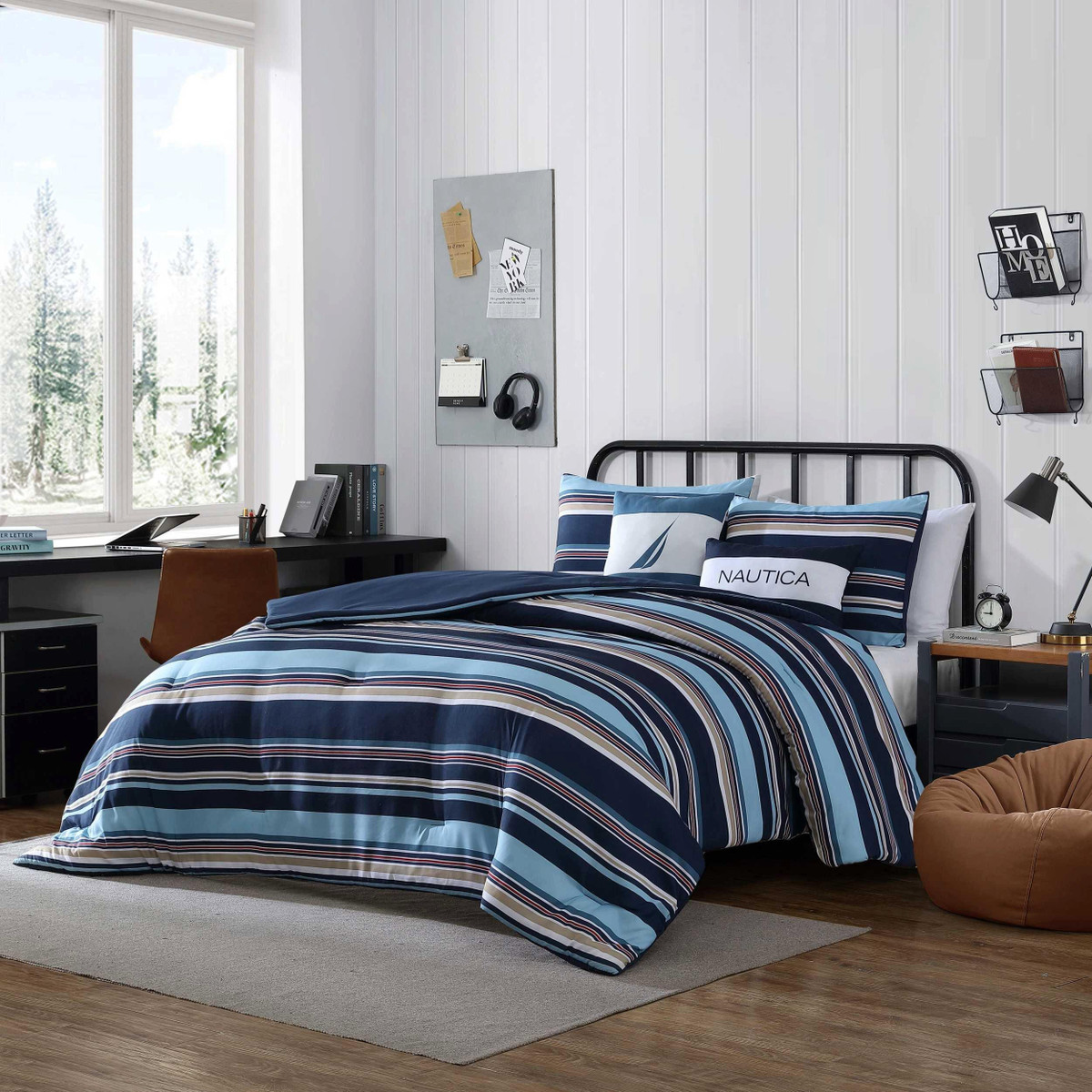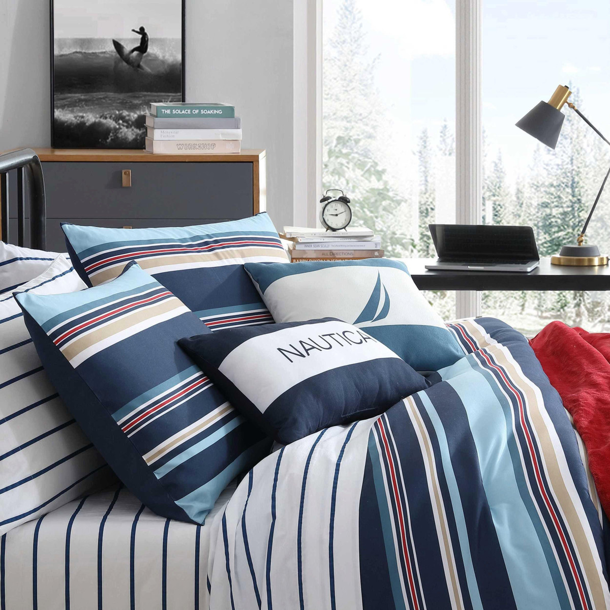 Bring coastal charm to your bedroom with the Nautica Colton 4 Pc. Comforter & Sham Set. Featuring soft brushed polyester and bold navy, blue, and red stripes, this set includes a comforter, shams, and two decorative pillows for a complete look. The comforter and shams are machine washable, while the pillows add a stylish, branded touch. Perfect for a cozy, nautical-inspired space.