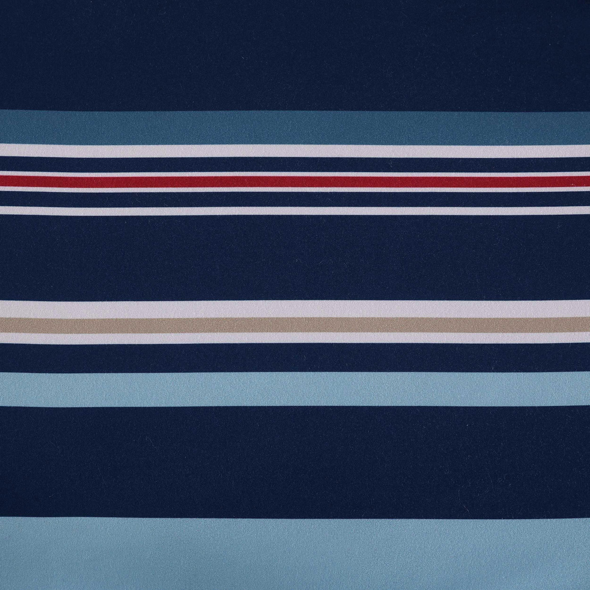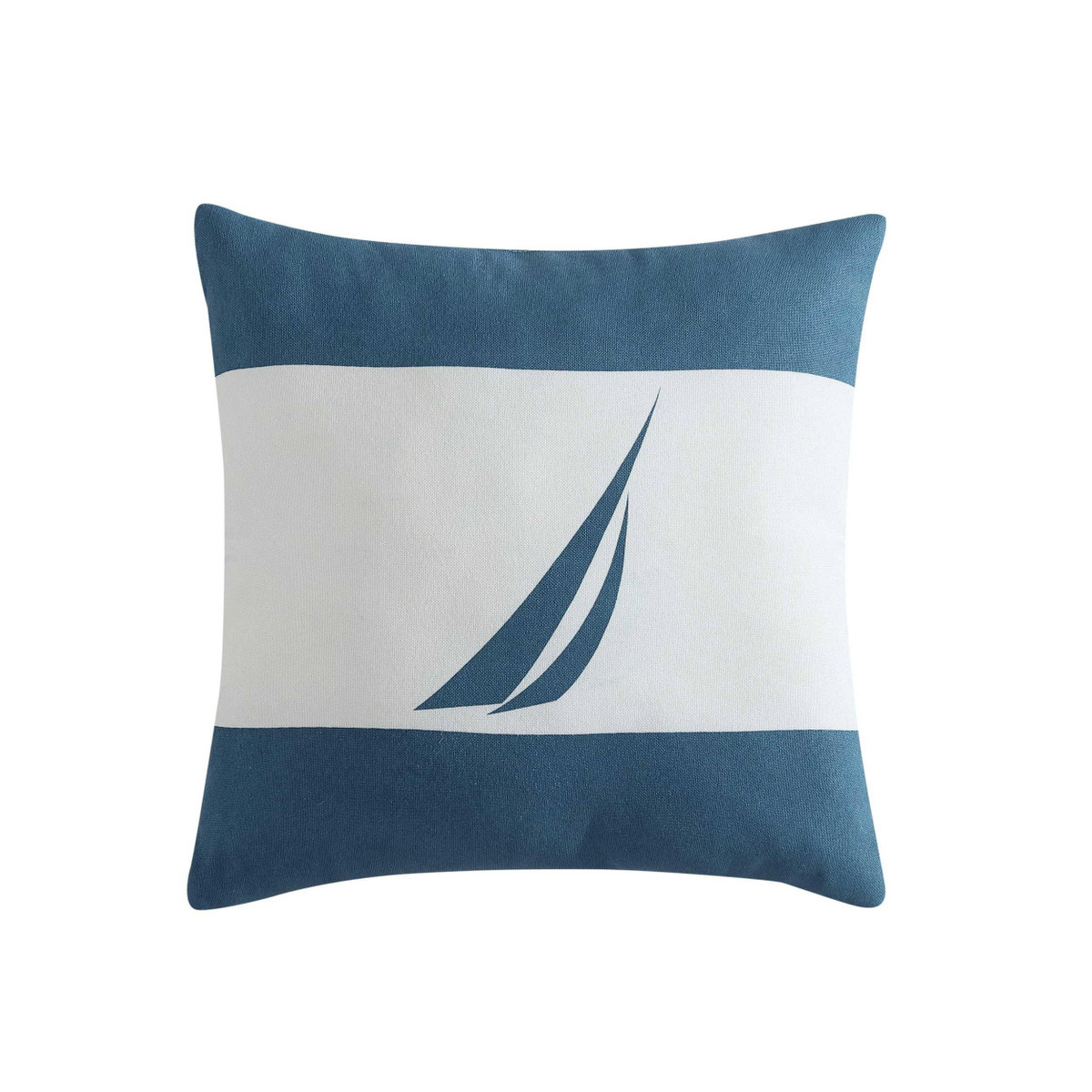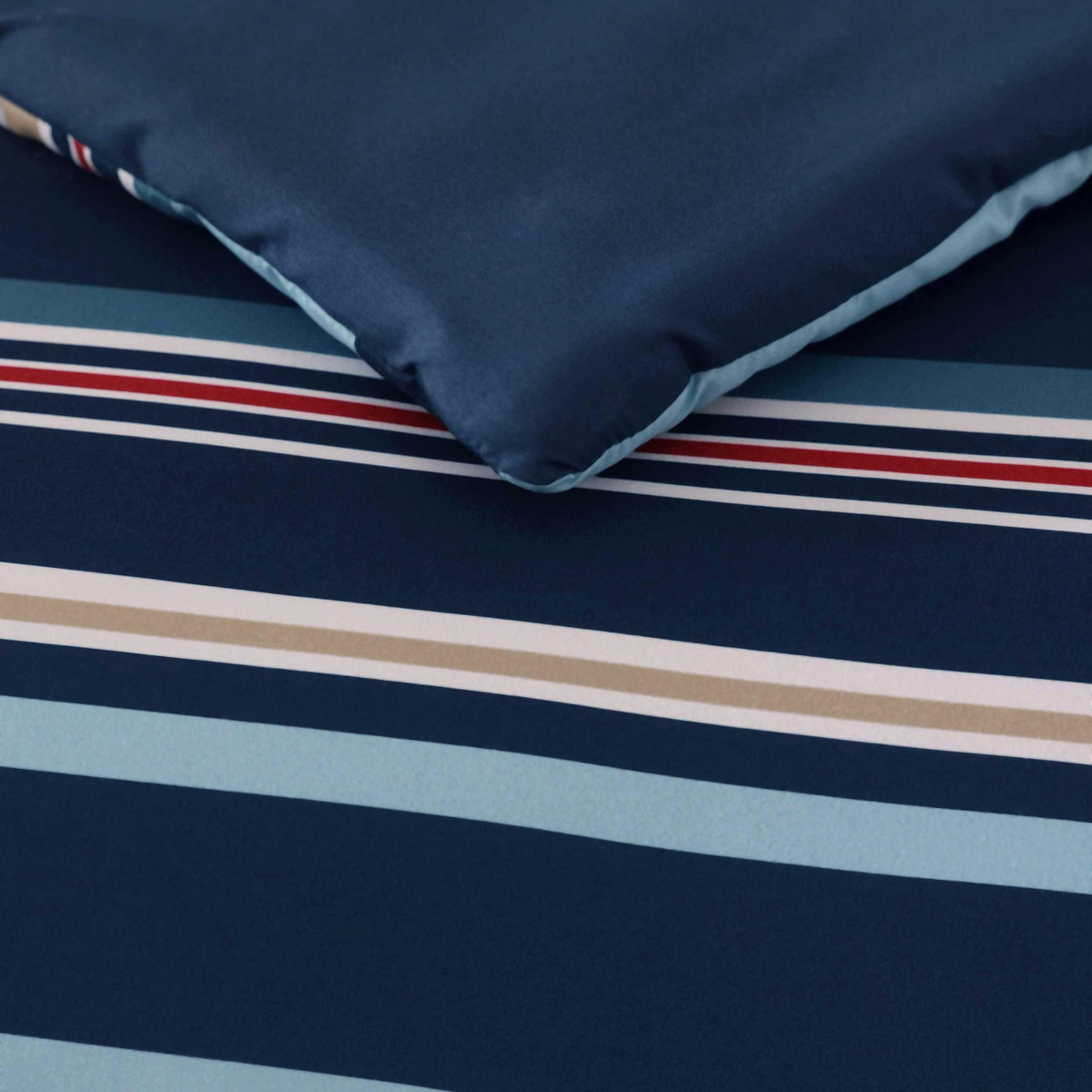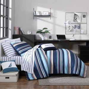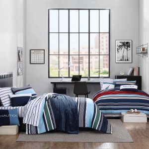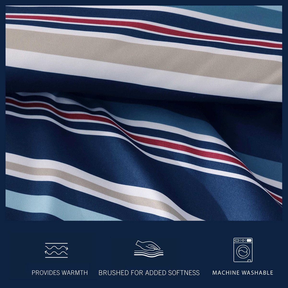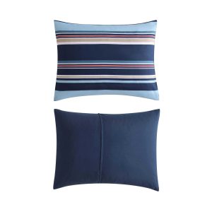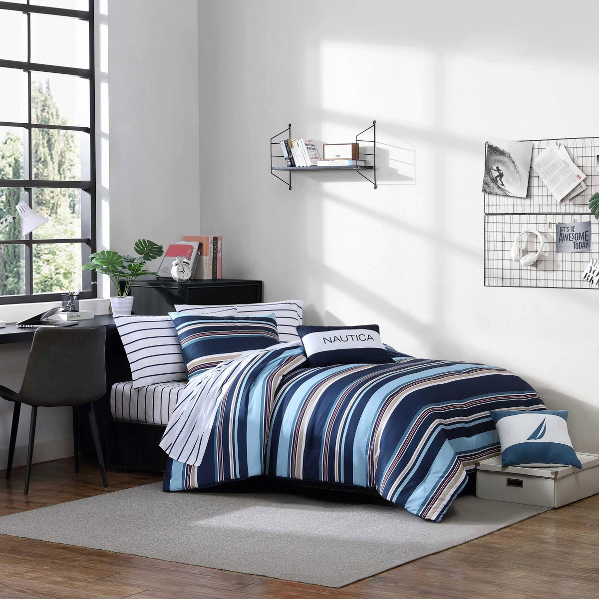 Bring coastal charm to your bedroom with the Nautica Colton 4 Pc. Comforter & Sham Set. Featuring soft brushed polyester and bold navy, blue, and red stripes, this set includes a comforter, shams, and two decorative pillows for a complete look. The comforter and shams are machine washable, while the pillows add a stylish, branded touch. Perfect for a cozy, nautical-inspired space.
