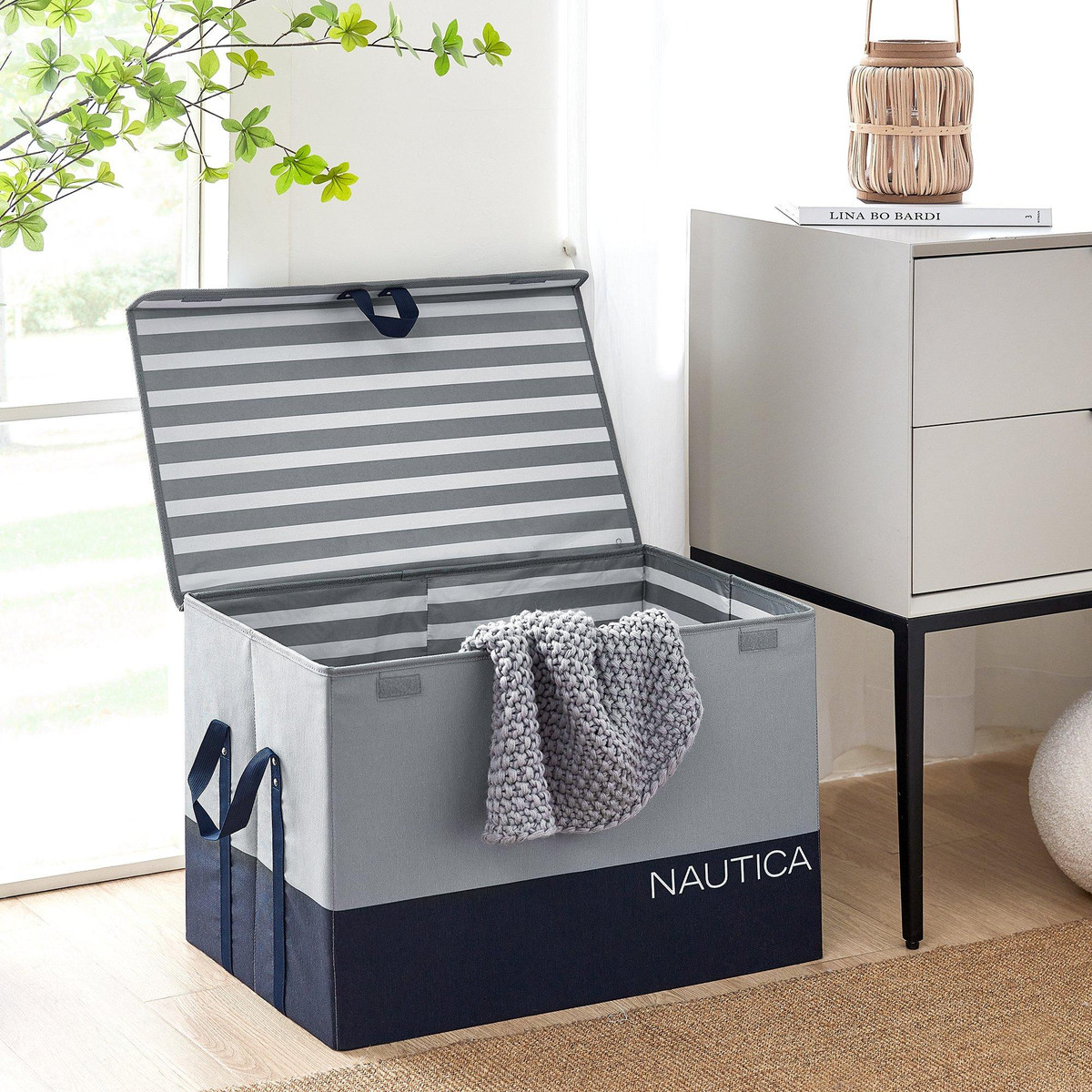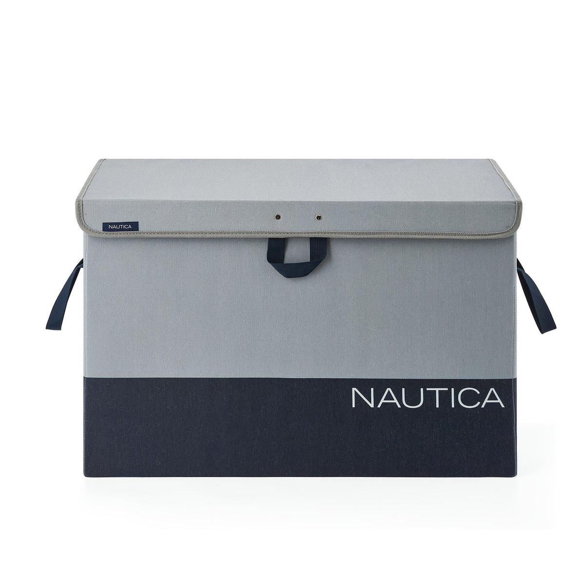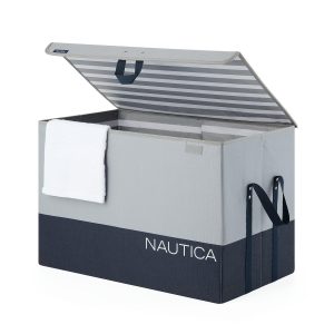 This Nautica Folding Large Storage Trunk with Lid offers a stylish and easily storable solution ideal for elevating any space in your home. This storage trunk features a lid to keep contents concealed, durable reenforced handles and a convenient collapsible design for easy storage when not in use. The Nautica branding combined with the trendy grey and black color block design will blend in beautifully with nearly any décor. Measures 24 in. x 14 in. x 16 in.