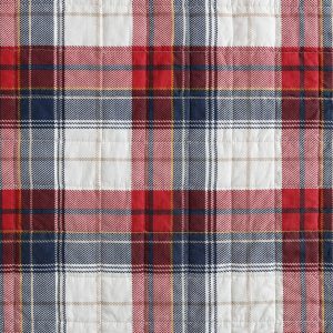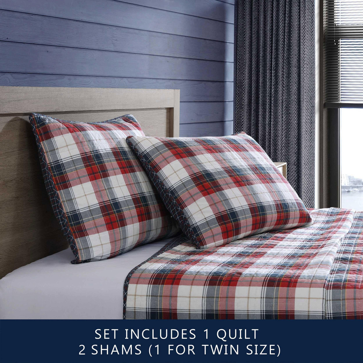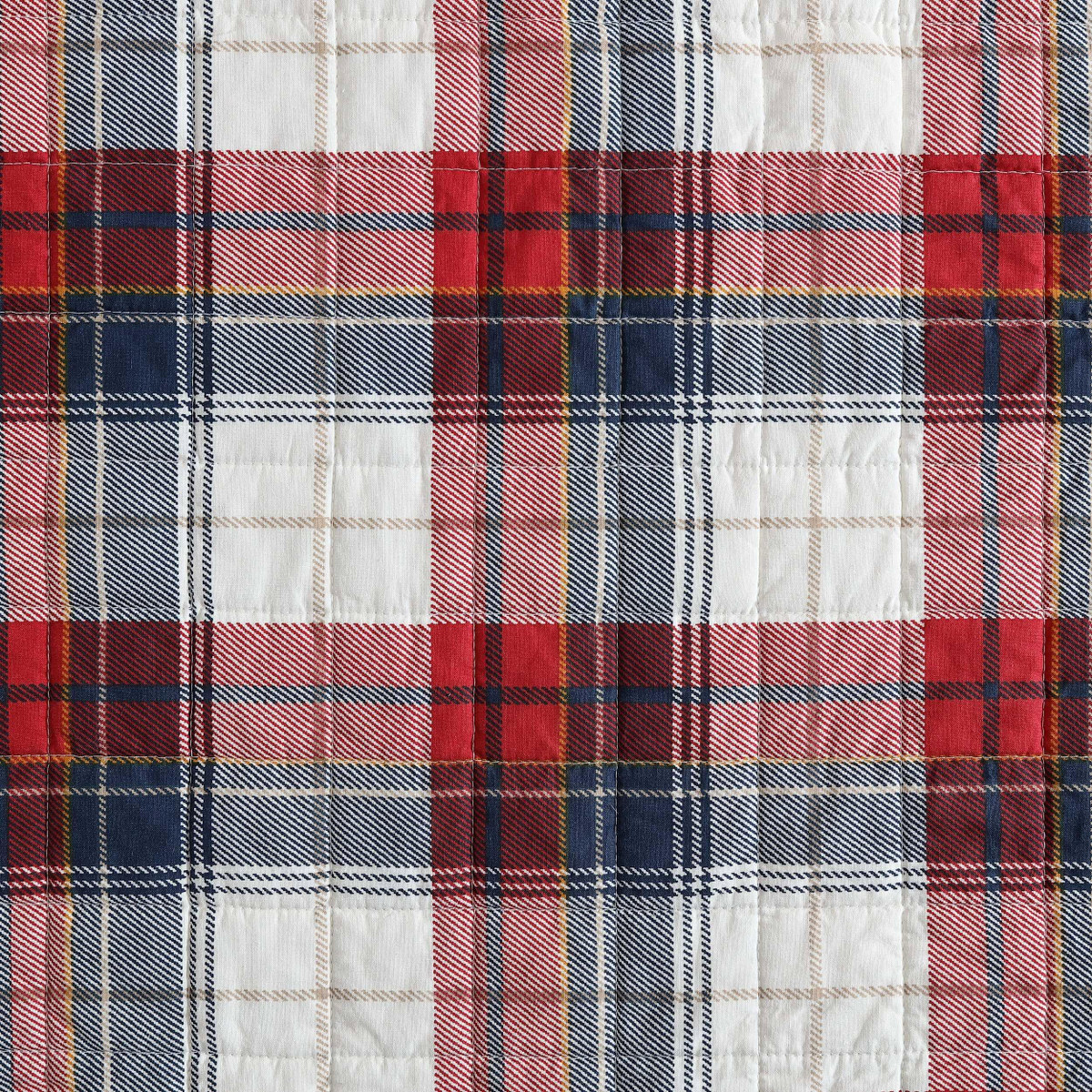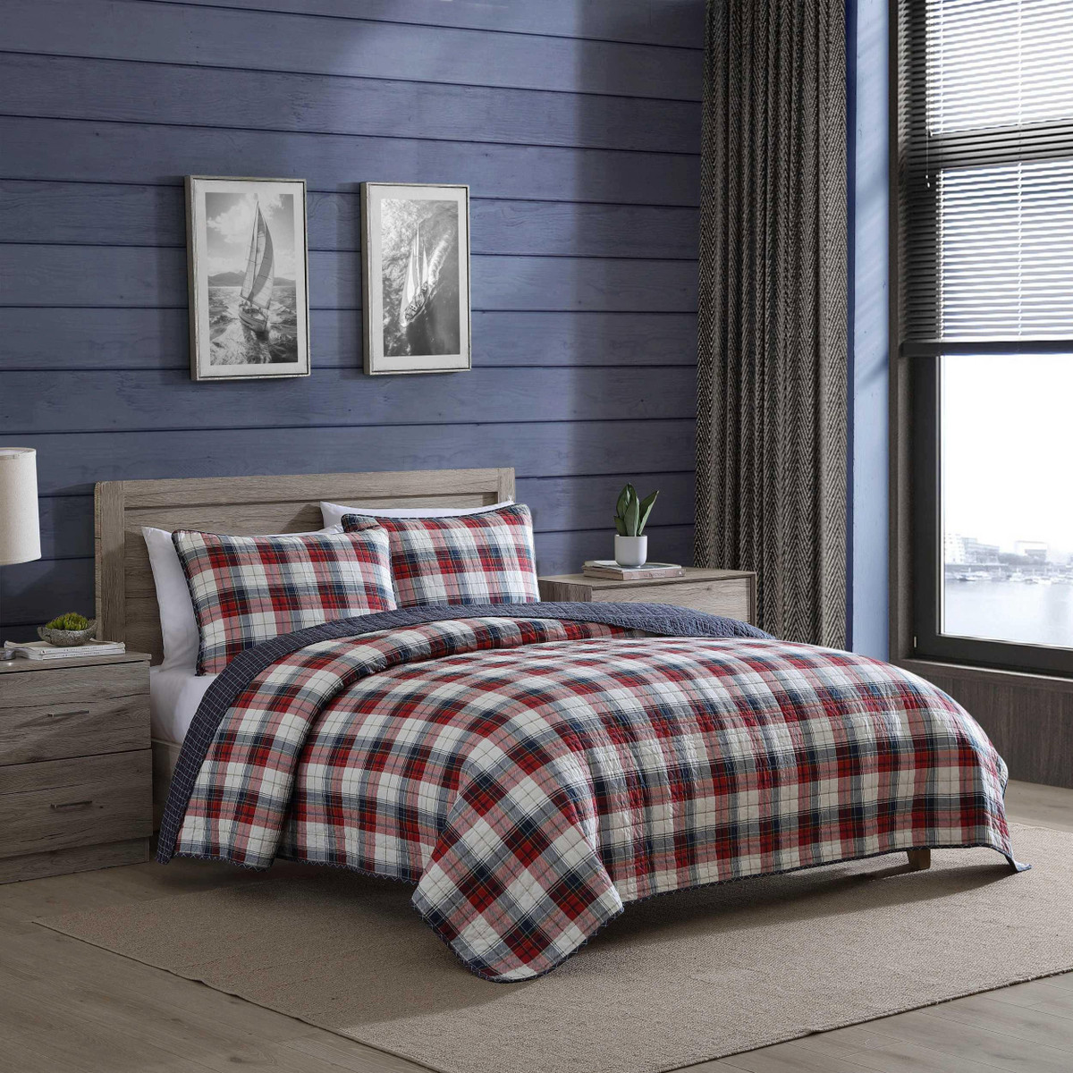With a modern twist on a traditional style, the 100% cotton Nautica Rosedale Quilt Set features a red, navy blue and ivory plaid pattern. Designed to keep you cool in the breezy summer months and warm in those cold winter nights, it is fully reversible. The shams are made with a 2-piece back closure, the quilt lightweight and prewashed for an extra soft feel. A cotton/polyester blend fill is crafted for long lasting use. Machine washable for easy care.