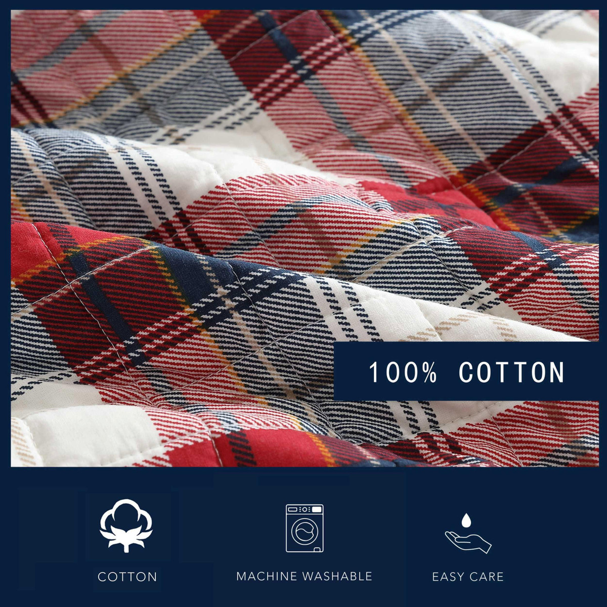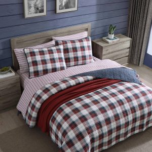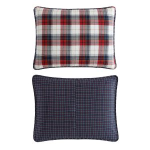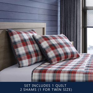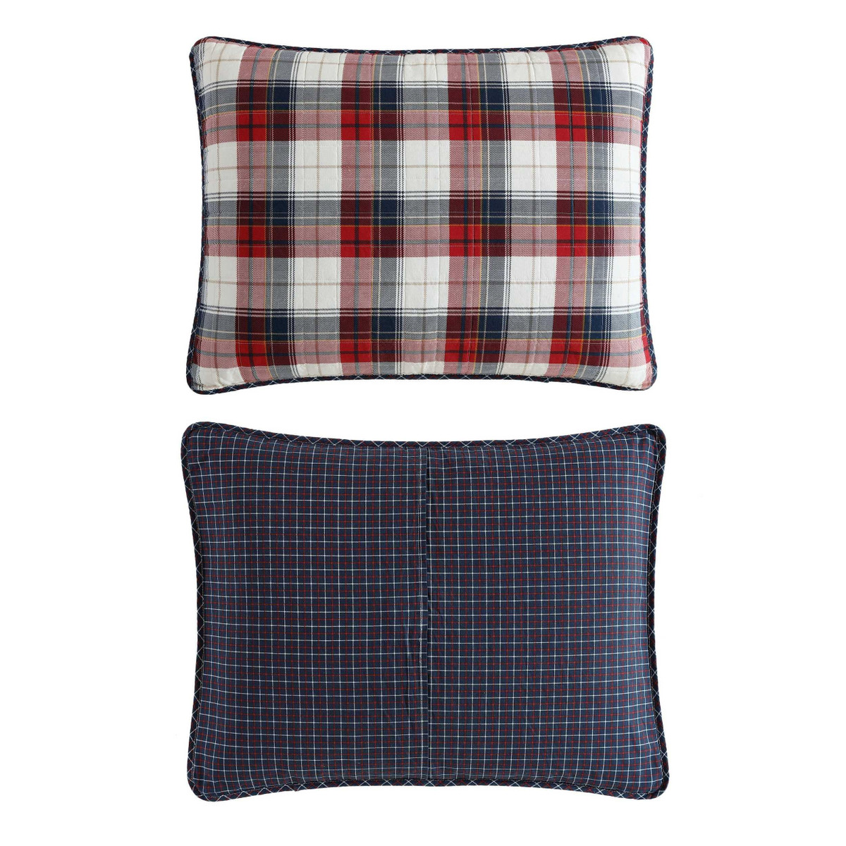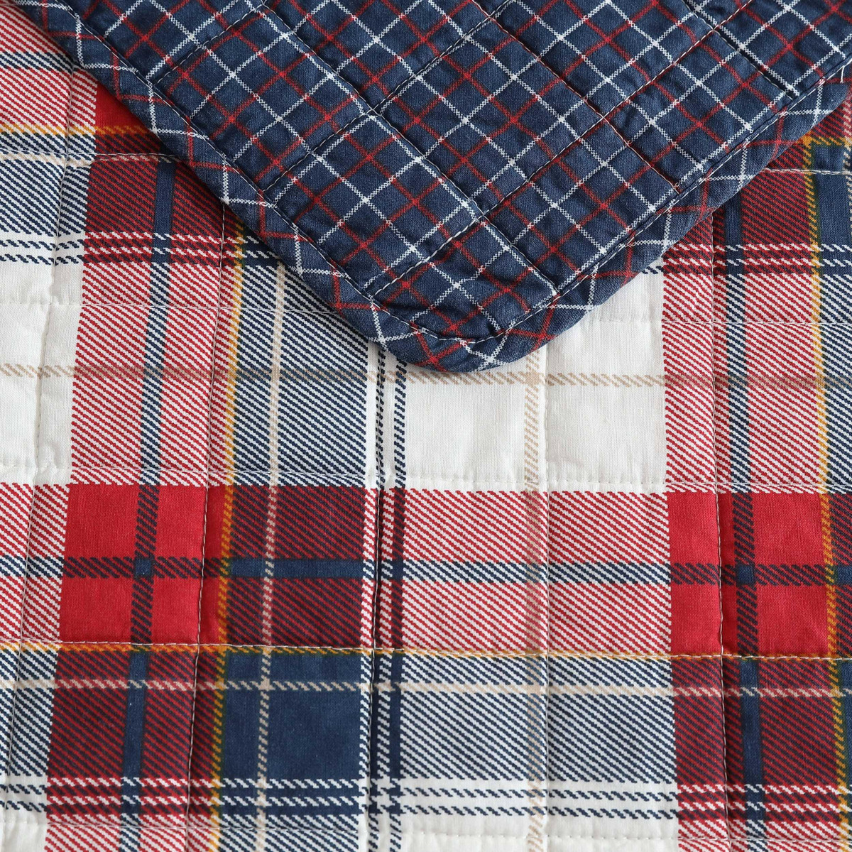With a modern twist on a traditional style, the 100% cotton Nautica Rosedale Quilt Set features a red, navy blue and ivory plaid pattern. Designed to keep you cool in the breezy summer months and warm in those cold winter nights, it is fully reversible. The shams are made with a 2-piece back closure, the quilt lightweight and prewashed for an extra soft feel. A cotton/polyester blend fill is crafted for long lasting use. Machine washable for easy care.