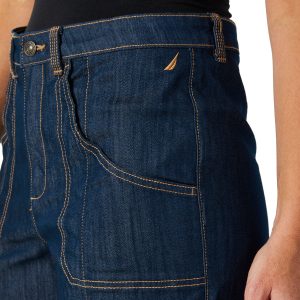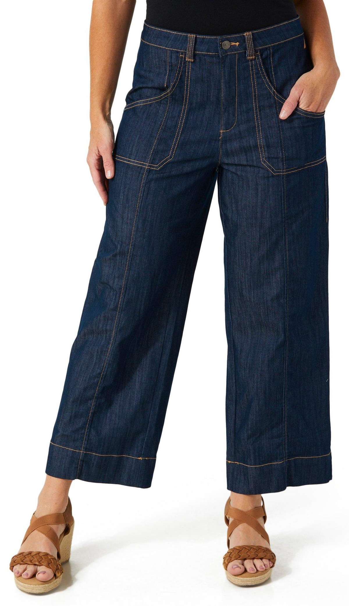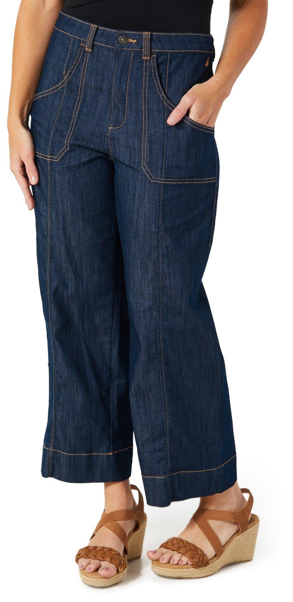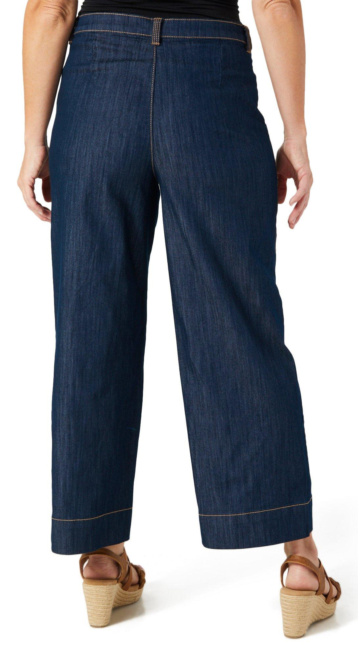 Elevate your denim game with these womens contrast stretch culottes. Designed with a wide leg crop fit, they feature side pockets and a classic button fly with zip closure for a modern twist on a timeless look.