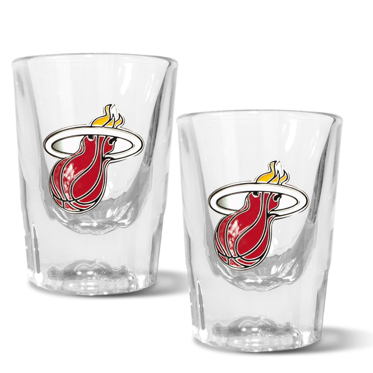 Show your team spirit tailgating with these NBA Miami Heat Set of 2 2 Oz. Prism Shot Glasses. The set includes two 2-oz shot glasses. In addition to the high-quality metal emblem, the Prism shot glass features an elegant cut at the base. Each measures 2.25” x 2.25” x 3.”
