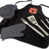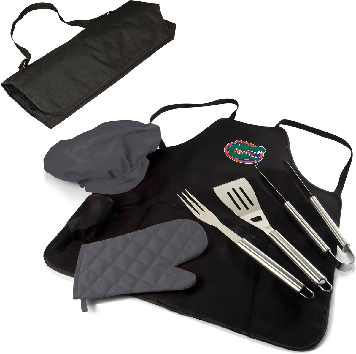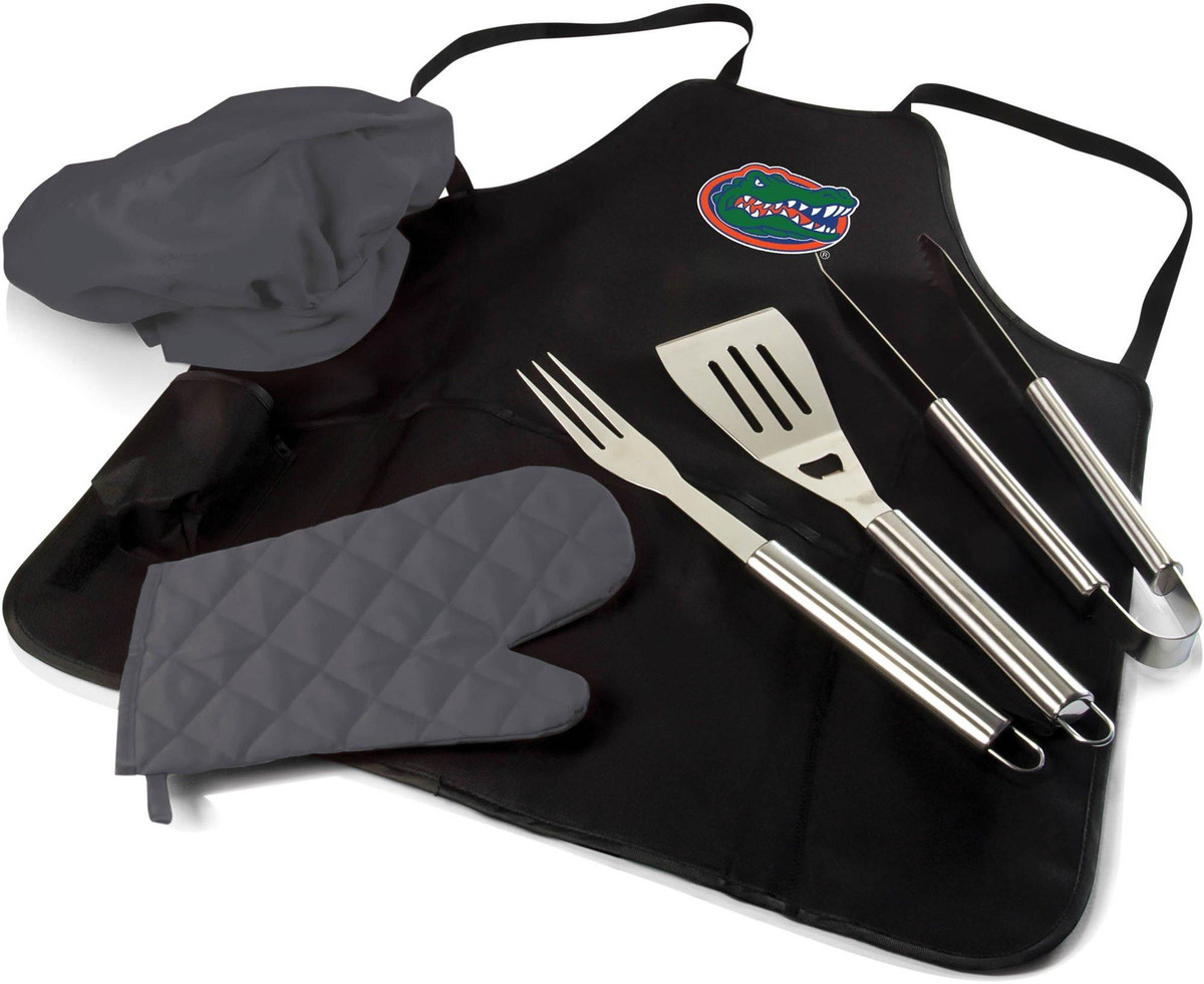 The UF BBQ Apron Tote Pro features a tote that converts to a full-sized apron with adjustable straps and deluxe barbecue tool set. Set includes a large spatula with bottle opener, a large fork, and tongs. Measures 19” x 18” x 2” and weighs 5 lbs.