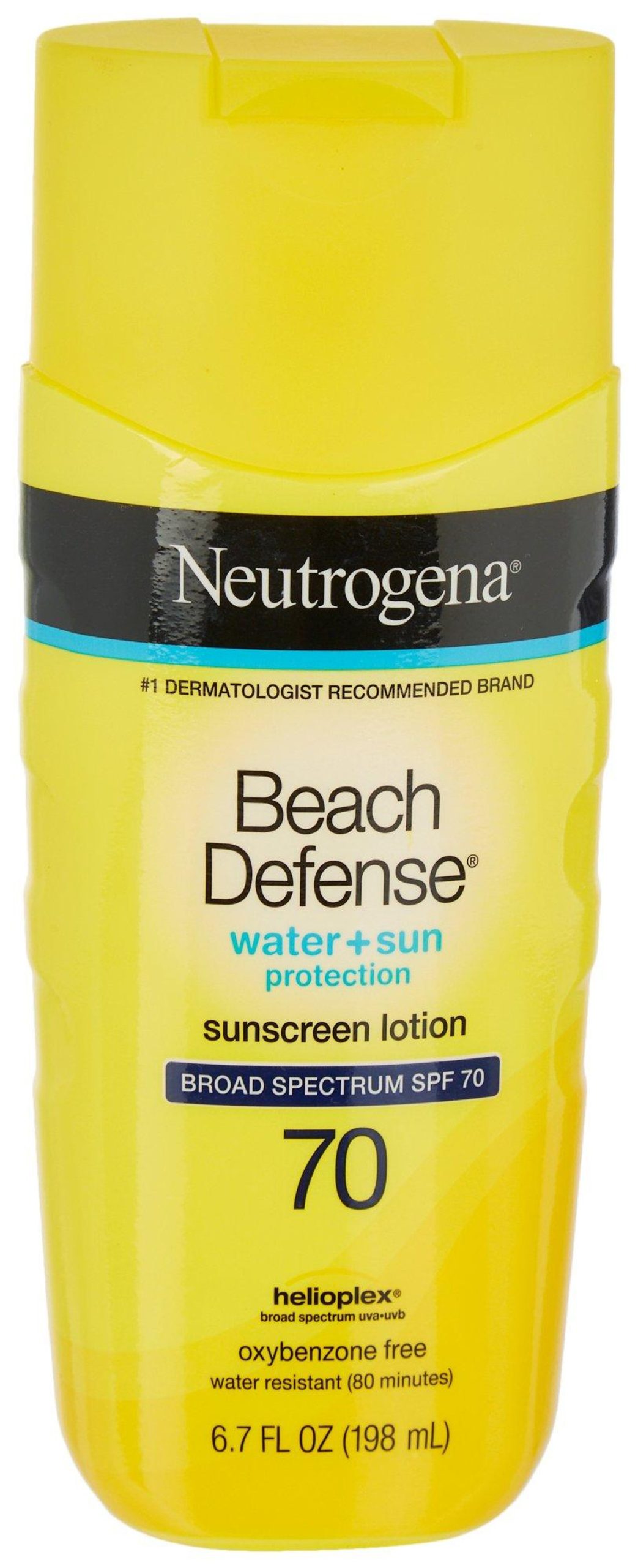This Beach Defense Sunscreen Lotion from Neutrogena features a fast-drying lightweight beach strength formula. Includes SPF 70 broad spectrum protection. Water-resistant up to 80 minutes. Oxybenzone-free. Contains 6.7 fl.oz.