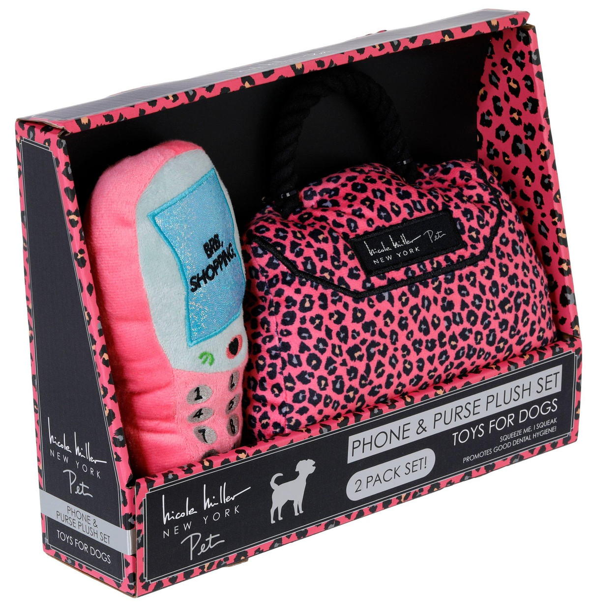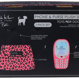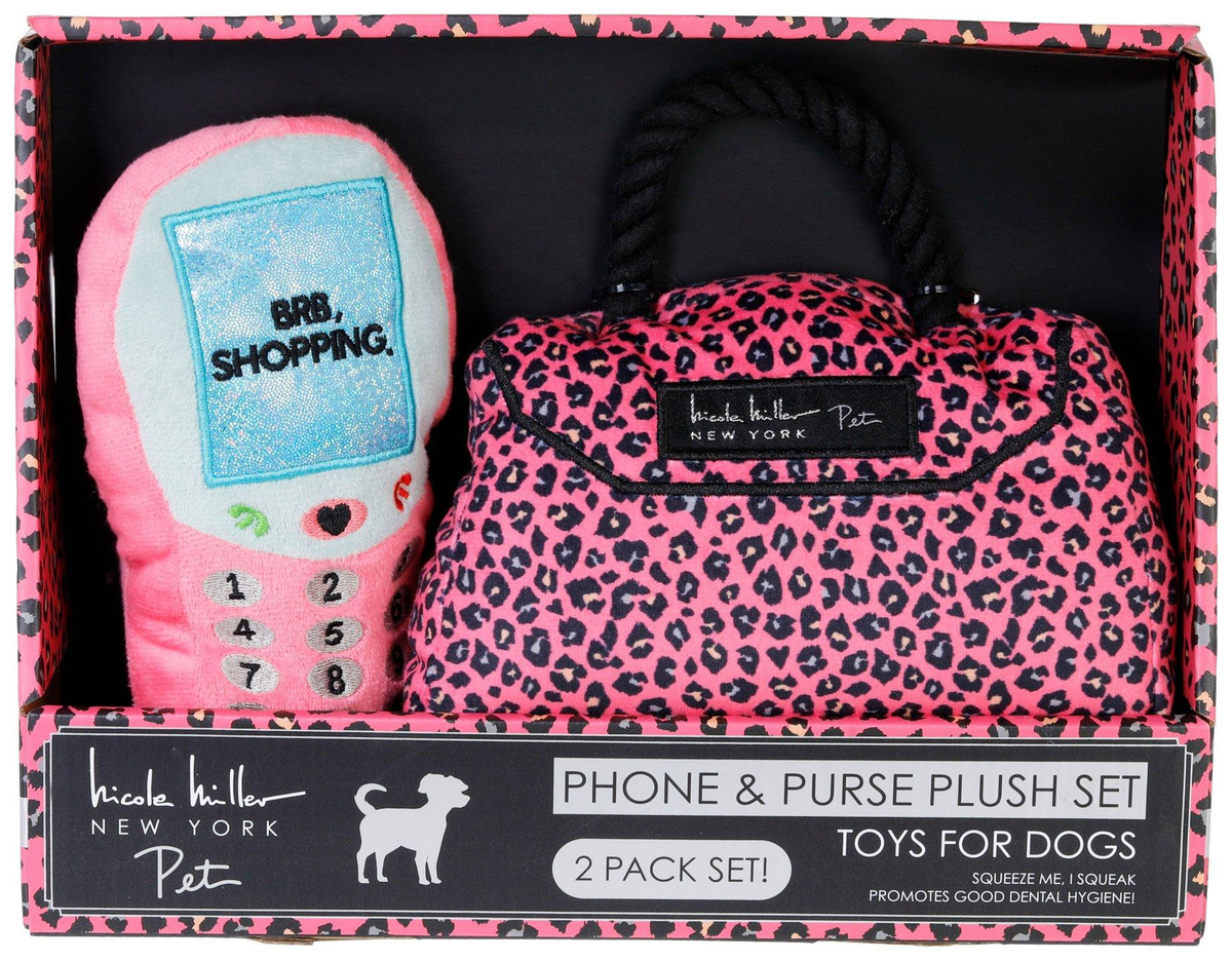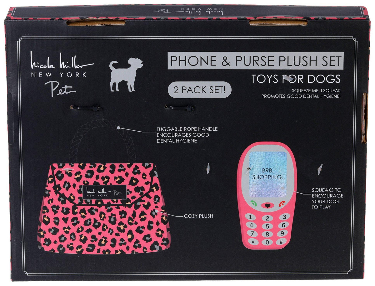 Treat your pup to playful luxury with this 2-piece plush dog toy set, featuring a chic handbag and cellphone. Soft, colorful fabric and built-in squeakers make each toy perfect for light chewing, gentle fetch or cuddle time. Packaged in a stylish box, its a fun gift for fashion-loving pet parents and their pups. Ideal for small to medium dogs. Measures approximately 8 in (handbag), 7 in (cell phone).