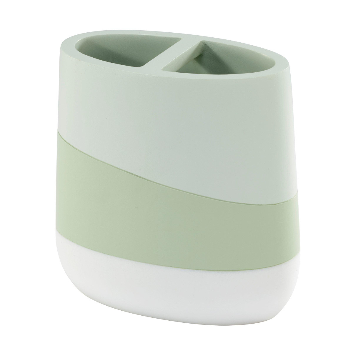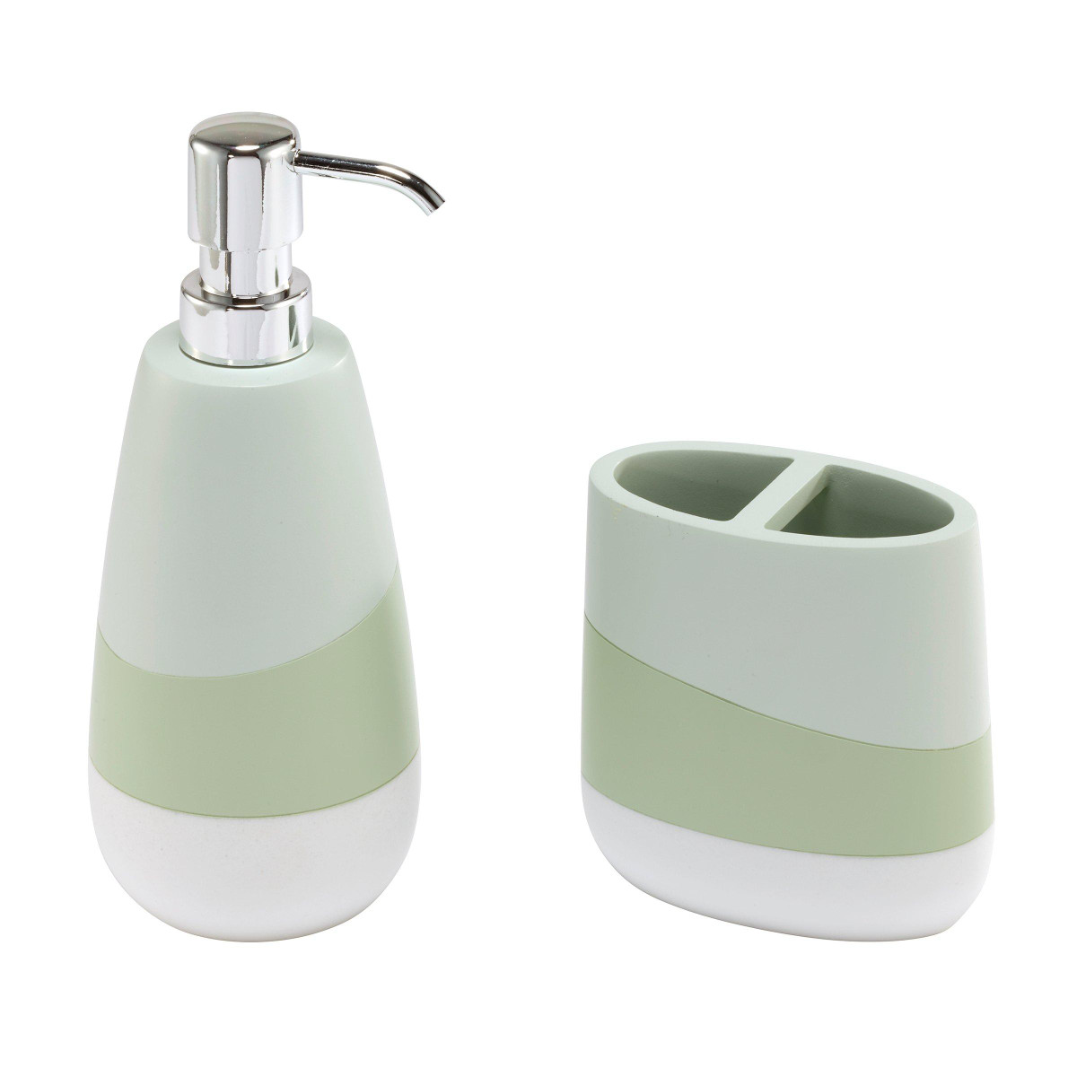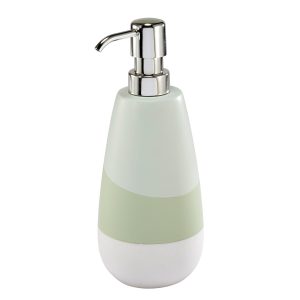 Elevate your bathroom decor the Nicole Miller 2-piece Tropiluxe Decorative Accessory Set. It features a modern, sleek, smooth-to-the-touch design with irregular bands of light green and celadon green with a white base. Made of durable resin for easy-care and long life. The set includes a toothbrush holder (4.20 x 2.20 x 4.30) and a lotion dispenser (2.80 x 2.80 x 8.36).