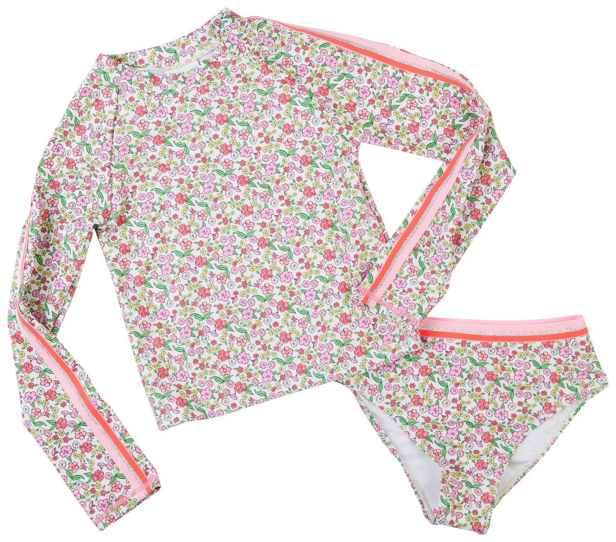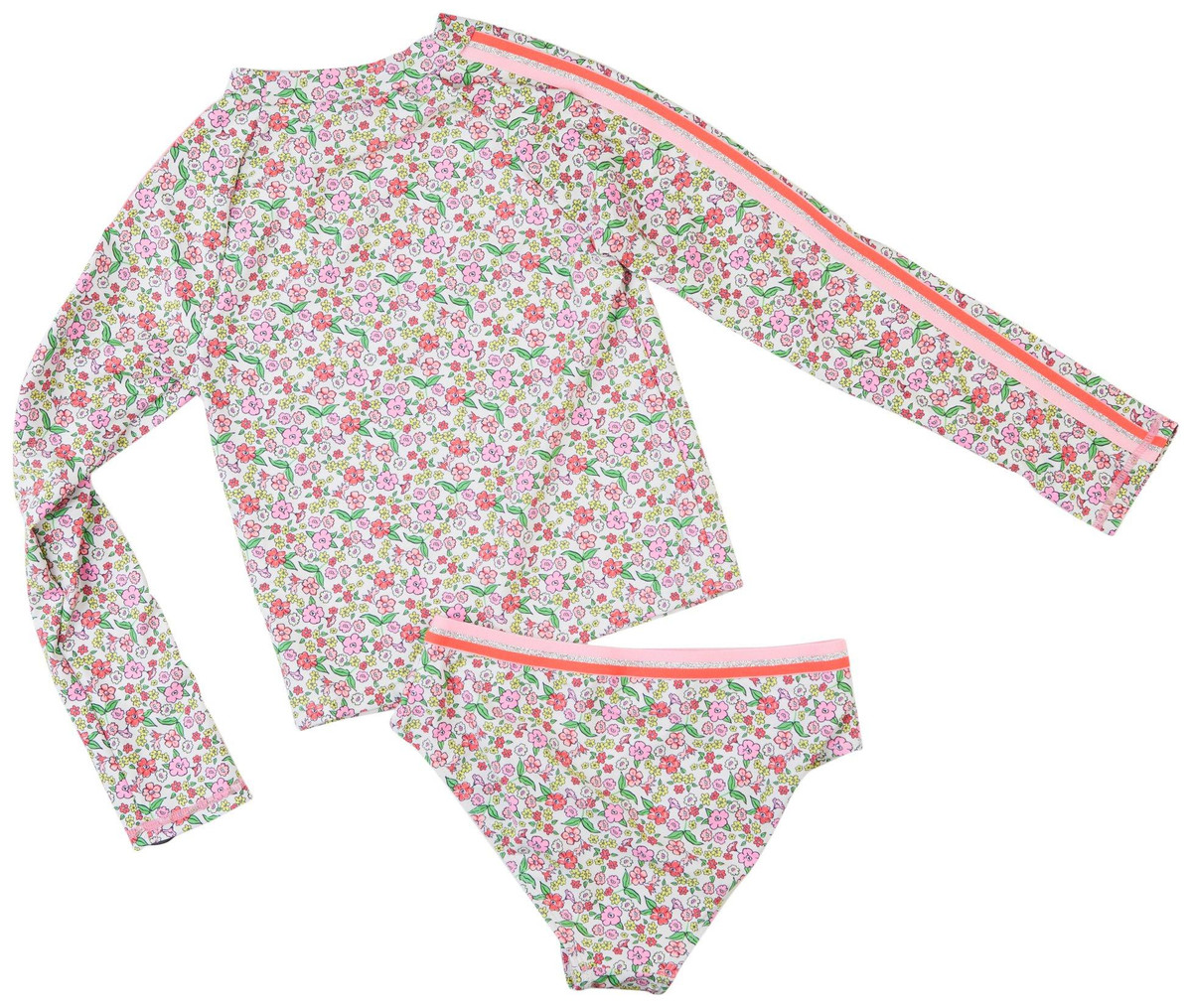 Keep her protected in style with this Big Girls 2 Pc Long Sleeve Rash Guard Swimsuit Set, featuring a bright floral design on a comfortable polyester/spandex blend. Includes a long sleeve top and coordinating swim bottoms for full coverage. Ideal for beach days, poolside, and active water play. Fabrication is 88% polyester, 12% spandex.