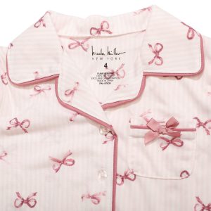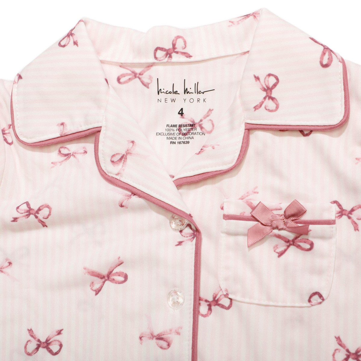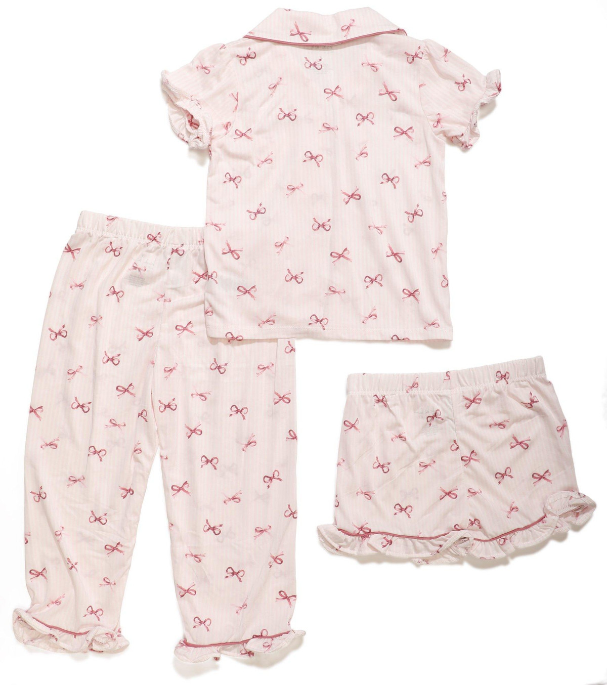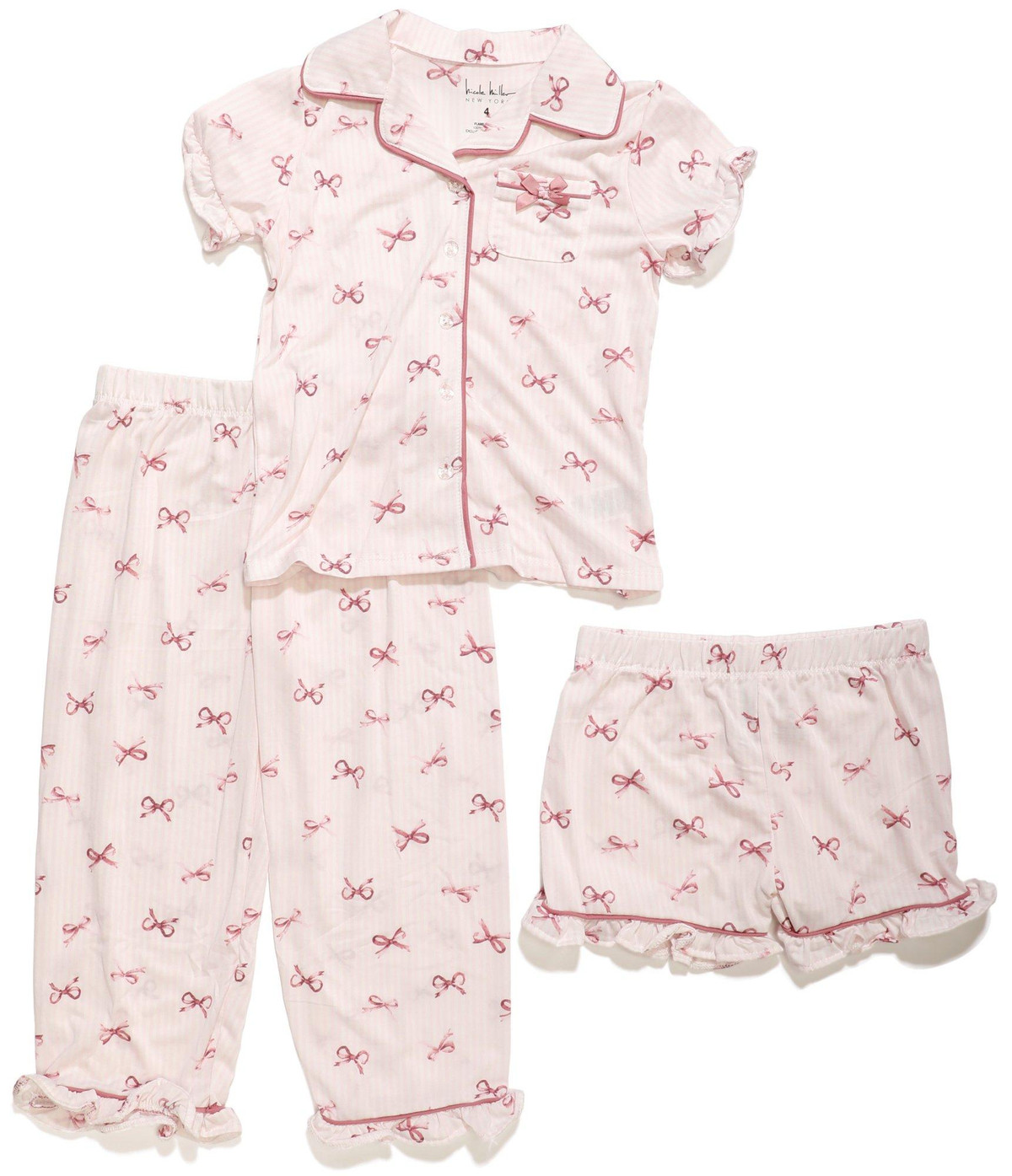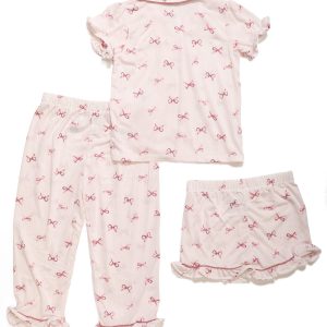 This Nicole Miller three piece pajama set for little girls includes ruffled shorts, matching pants, and a button down top with ruffled short sleeves. Made from 100% polyester, the fabric is soft and gentle for a cozy night’s sleep with a touch of playful elegance.