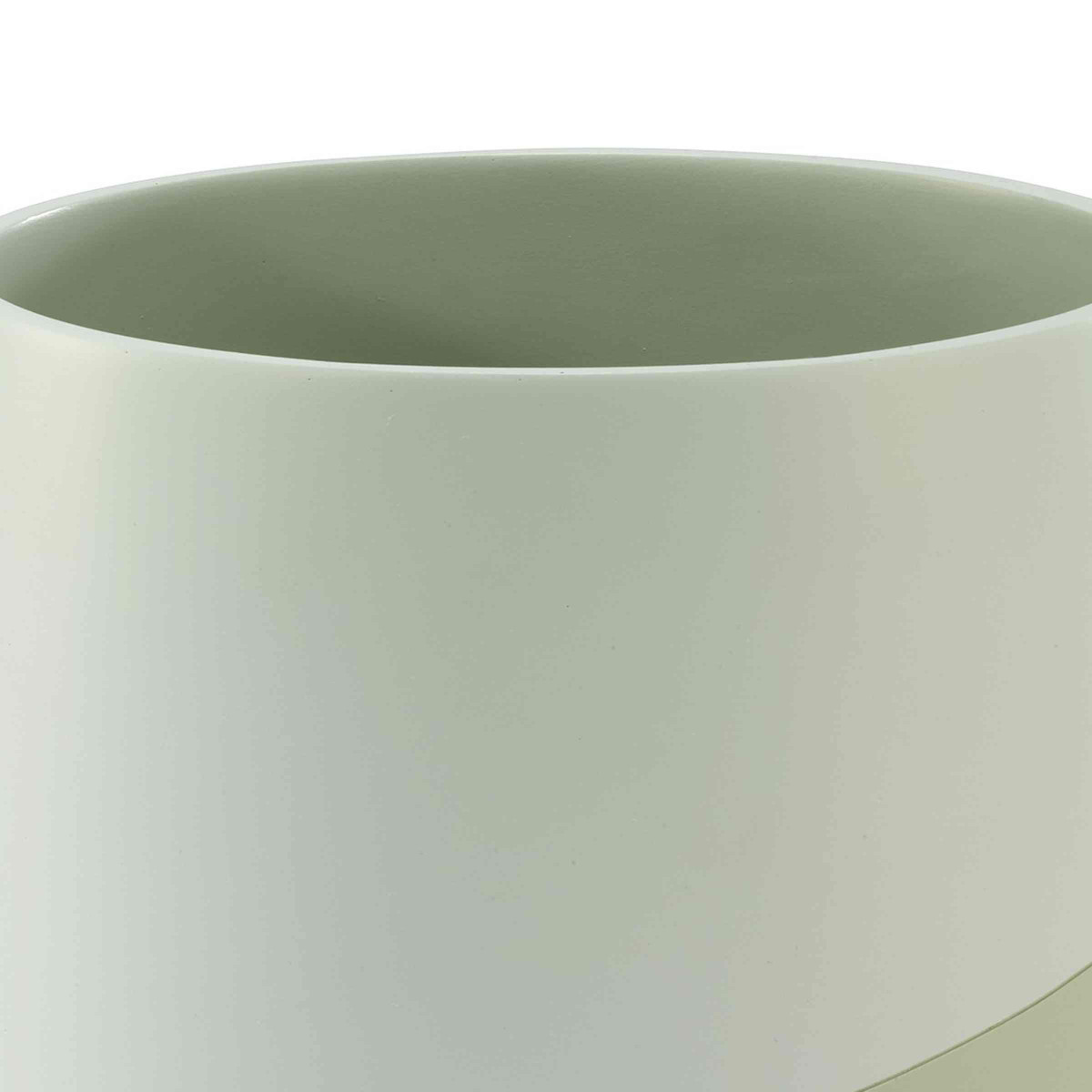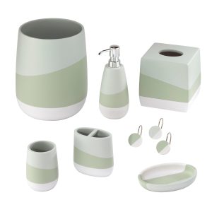 Elevate your bathroom decor the Nicole Miller Tropiluxe Decorative Wastebasket. It features a modern, sleek, smooth-to-the-touch design with irregular bands of light green and celadon green with a white base. Made of durable resin for easy-care and long life. Measures 7.60 in. x 7.60 in. x 10.00 in.