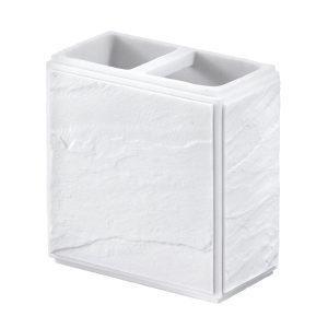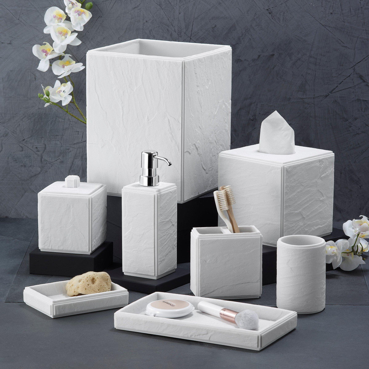 Elevate your bathroom decor with the Nicole Miller Zen 4-Piece Decorative Accessory Set. This modern collection features a white, textured marble design with raised panels on all sides, adding a touch of elegance and sparkle. Crafted from durable sand resin, these accessories are easy to care for and built to last. The et includes a tumbler (3.00 x 3.00 x 4.30), toothbrush holder (4.30 x 2.20 x 4.30), soap dish (5.50 x 4.00 x 1.10), and lotion dispenser (3.00 x 3.00 x 8.36).