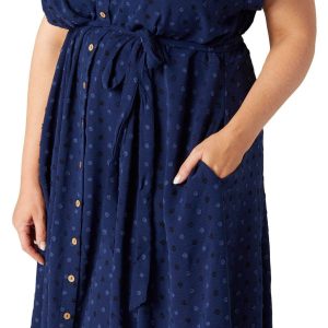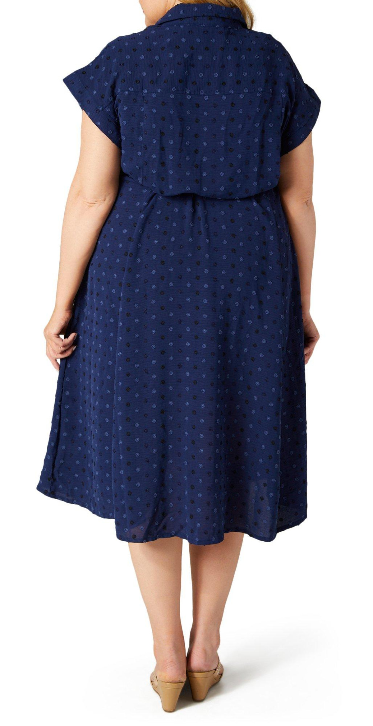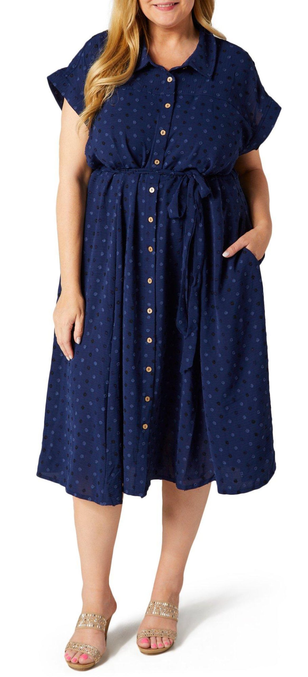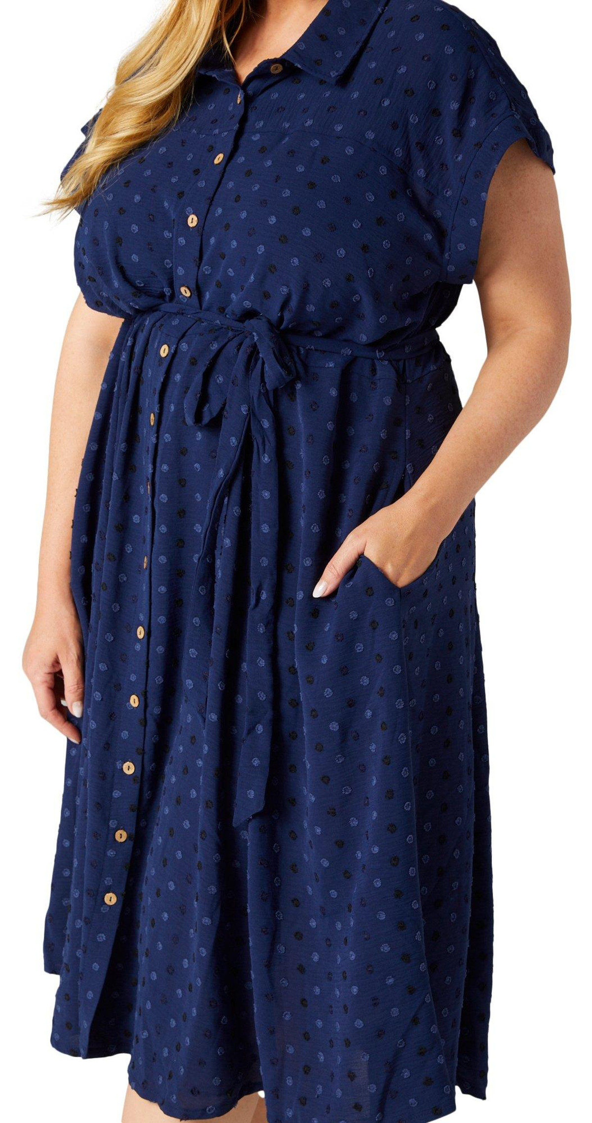 Step out in effortless style with this Short Sleeve Midi Shirt Dress. Featuring a flattering waist tie and a classic buttoned front, this dress is designed to enhance your silhouette. The embroidered polka dot pattern adds a touch of playful elegance, while the side slip pockets provide both convenience and charm. Perfect for any occasion, this versatile dress combines comfort and sophistication. Fabrication is 95% polyester, 5% spandex.