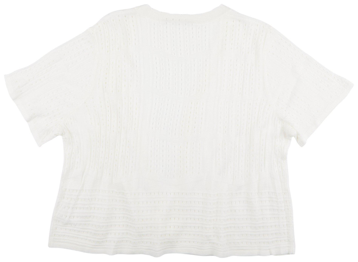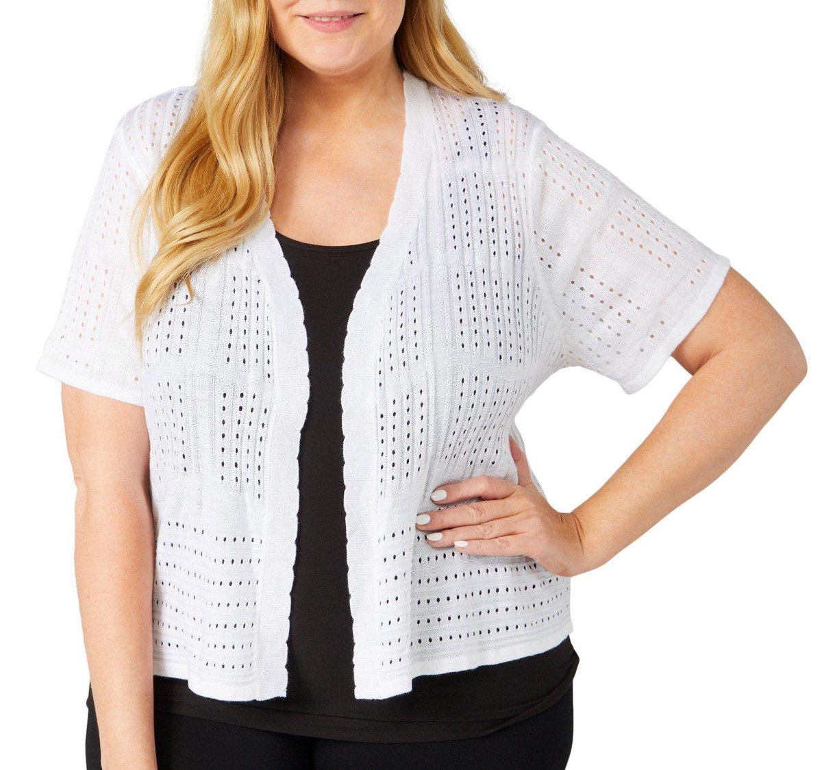 This short sleeve shrug features a solid color design on soft lightweight open knit fabric, a scallop trim, and clssic styling. The top length measures approximately 21 in. Fabrication 100% acrylic.