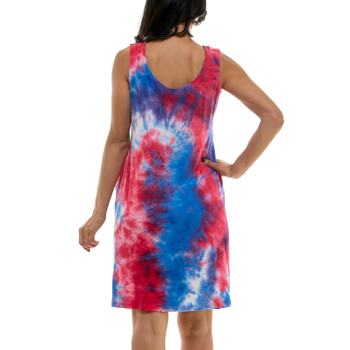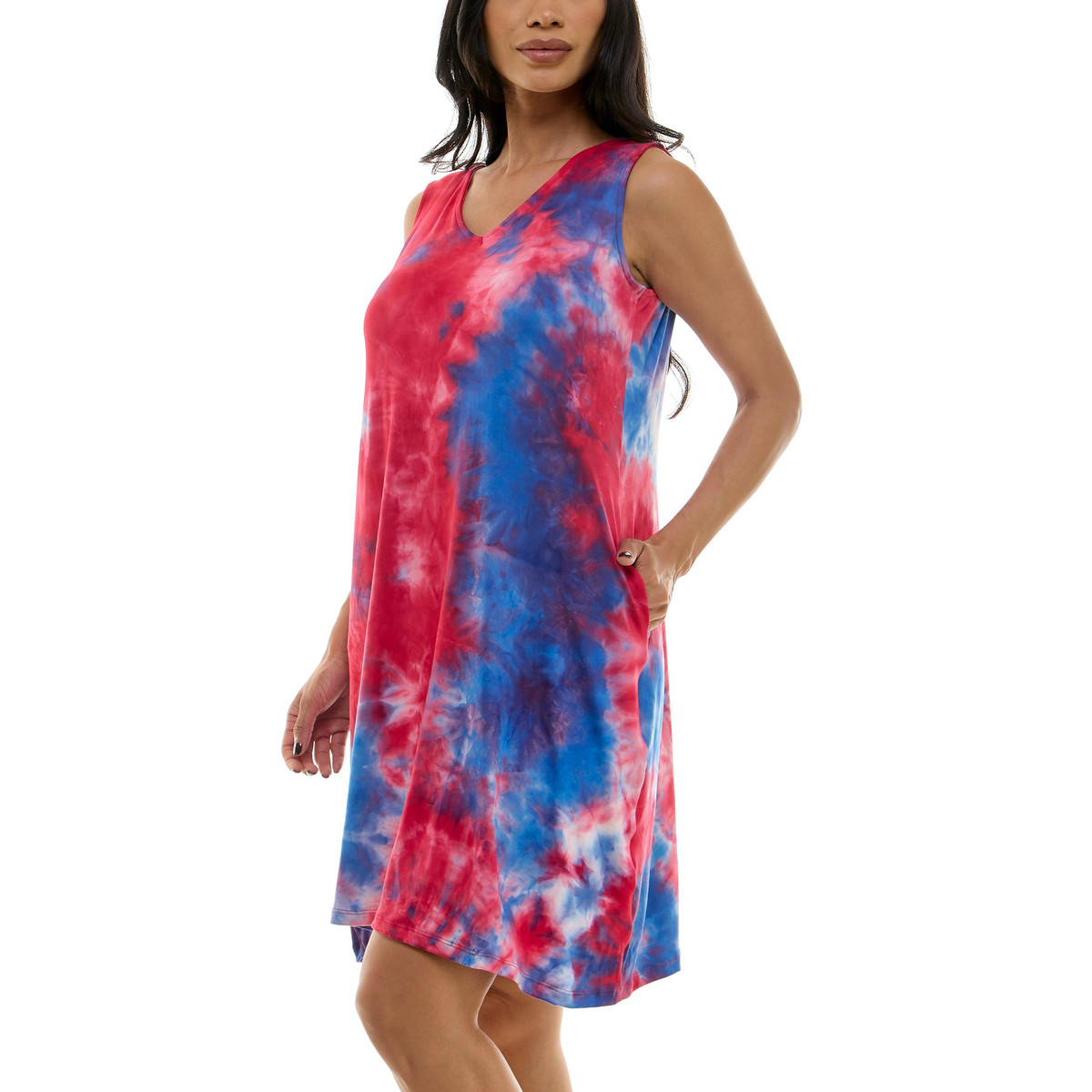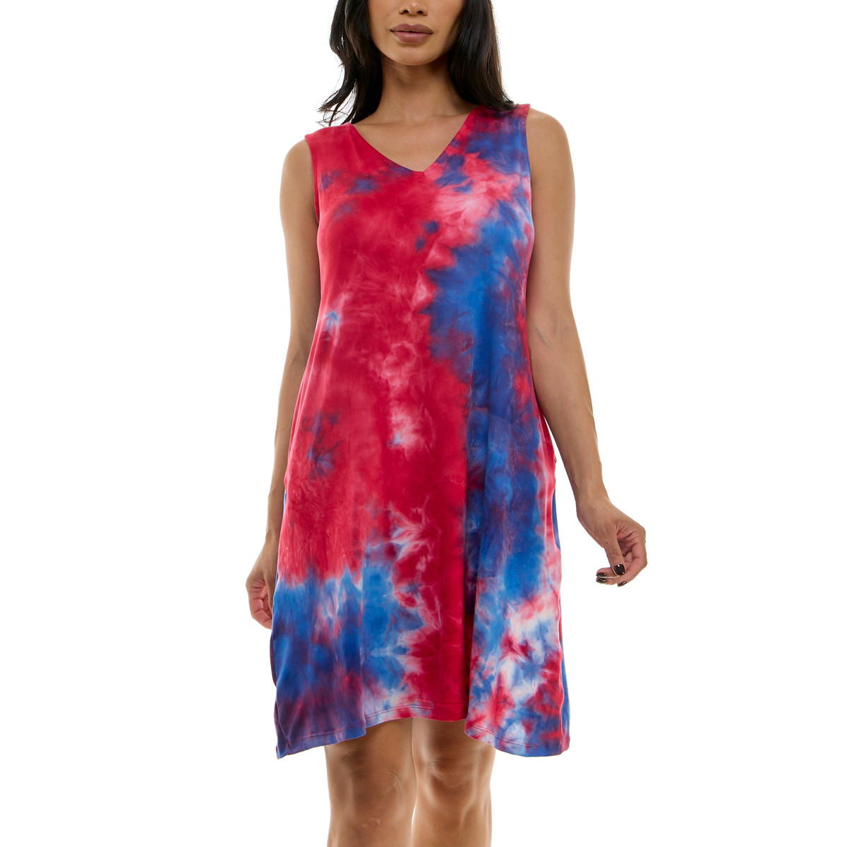 Celebrate in style with the Nina Leonard Americana Dress, featuring a bold red, white, and blue tie-dye design. This sleeveless piece offers all-day comfort with soft, breathable fabric and includes handy side pockets for everyday ease. Perfect for festive gatherings or casual days out, a fun, functional nod to patriotic flair.