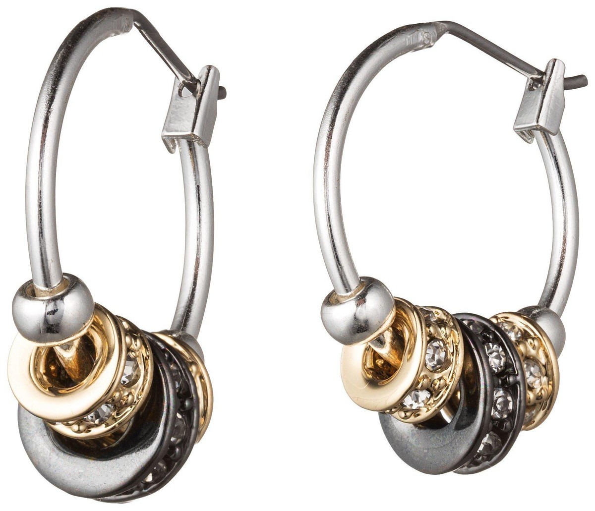 These Nine West hoop earrings are perfect for everyday wear. Featuring rhinestone embellished slide rings, 0.75 in. diameter, click top closure & has a silver, hematite & gold tone finish.