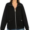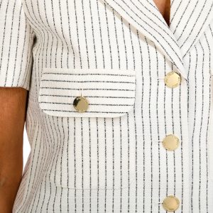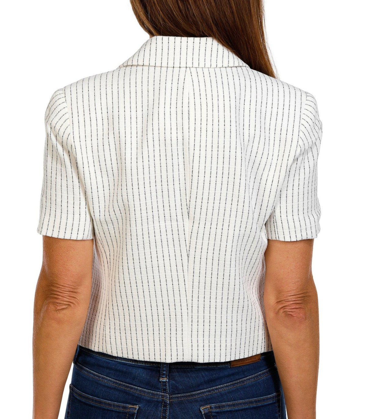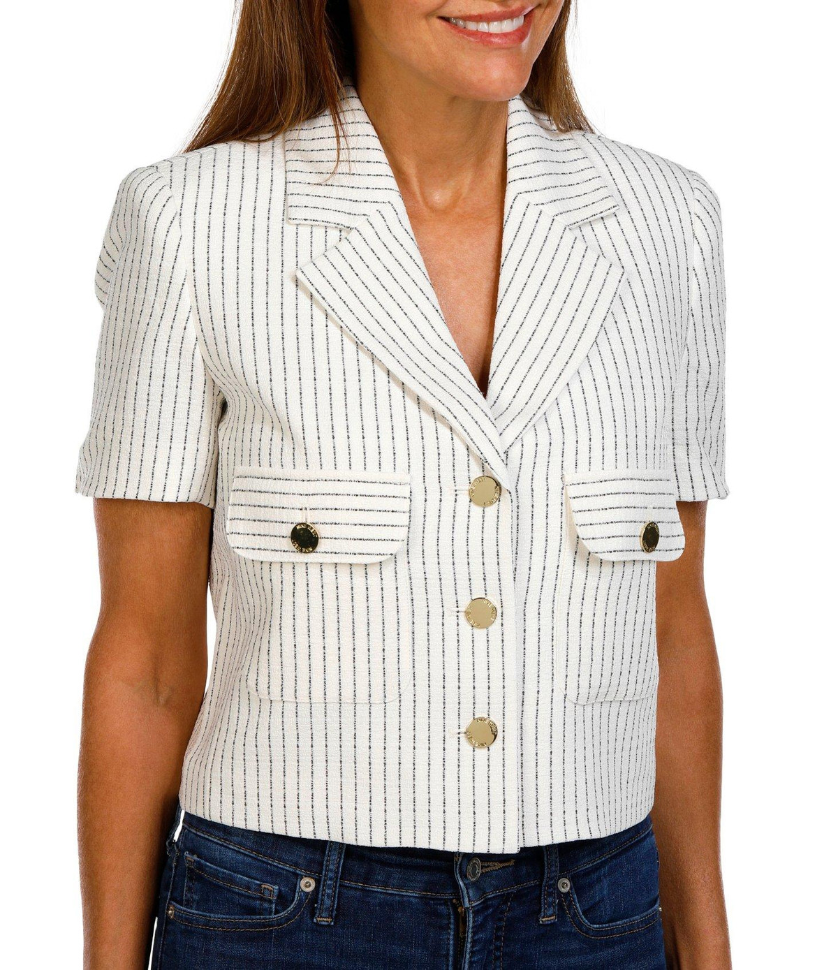Confidence meets contemporary style in this womens cropped button down jacket with classic stripes, padded shoulders, and short sleeves. Fully lined and crafted from a polyester-elastane blend, it offers structure, comfort, and a sharp silhouette. Perfect for layering, this cropped jacket transitions seamlessly from polished work looks to relaxed weekend style. Length measures approximately 19 in. Fabrication is 97% polyester, 3% elastane.