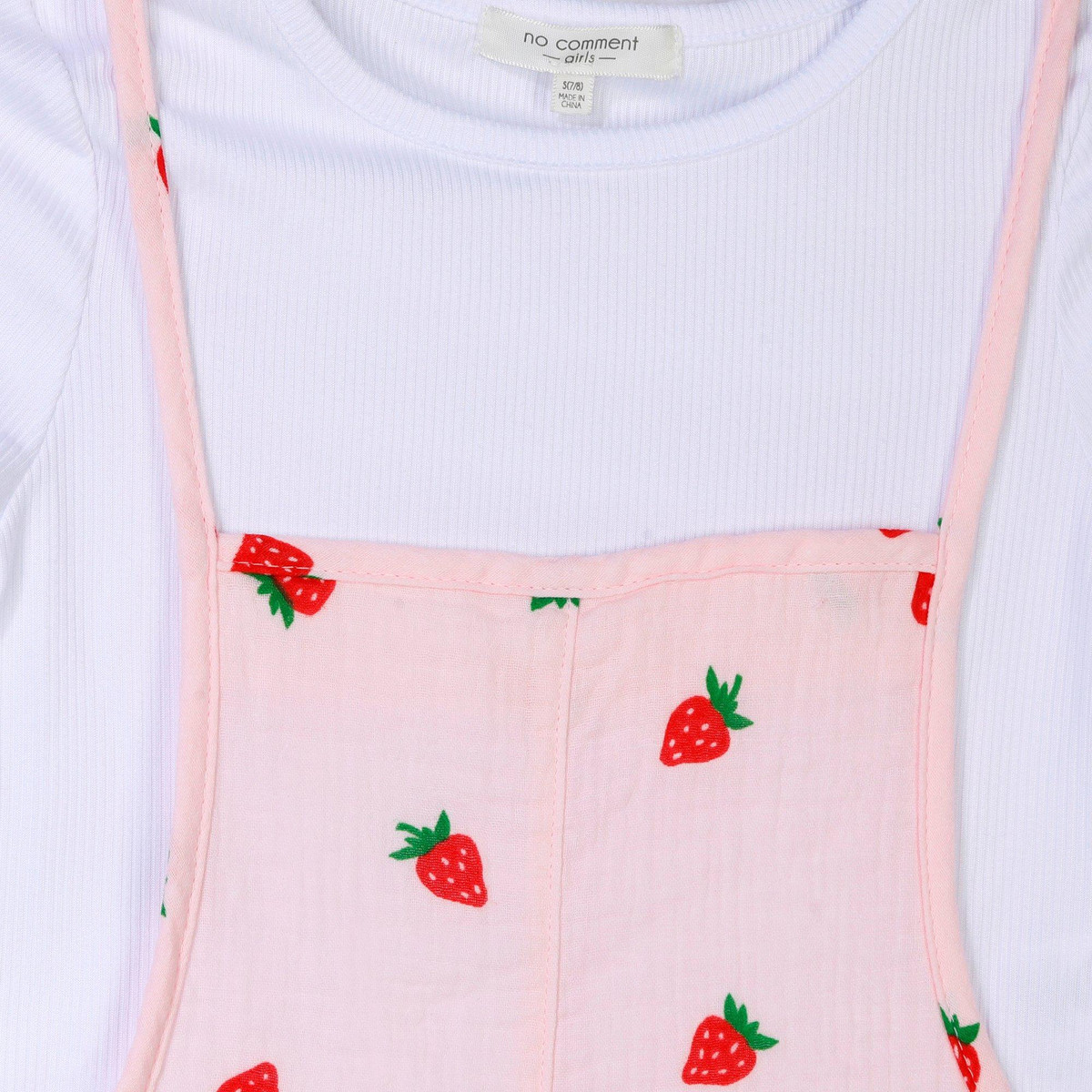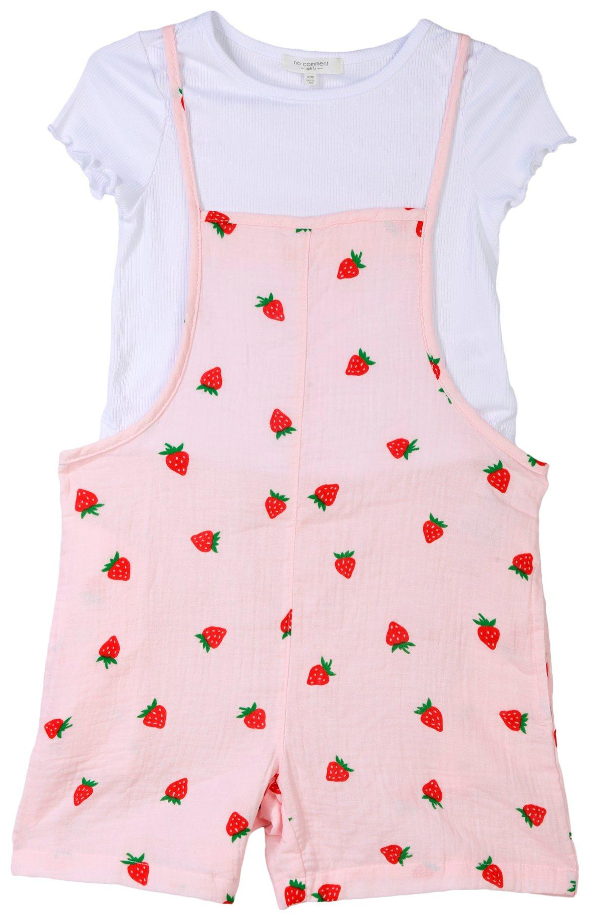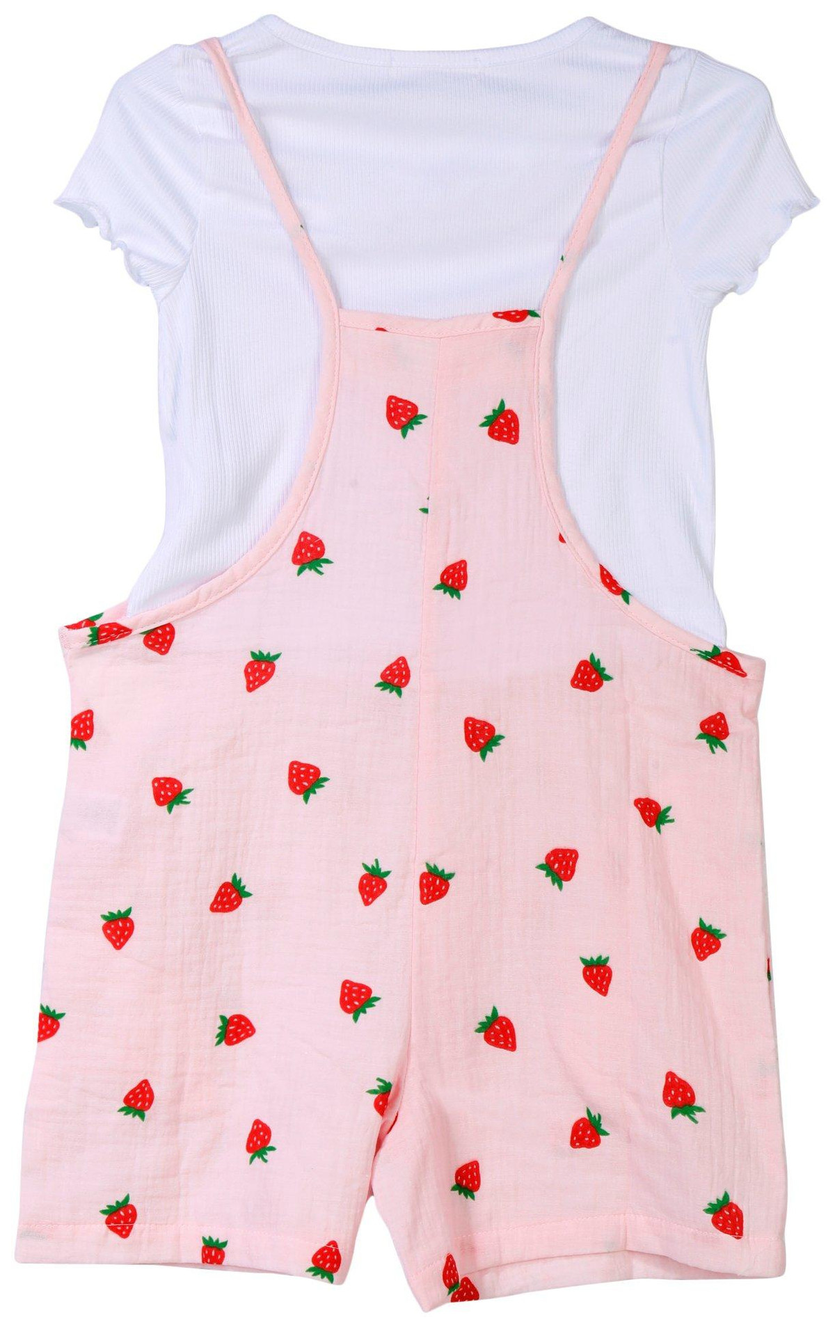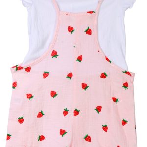 Freshen up her look with this sweet 2-piece romper set. It features a white ribbed short-sleeve top with a classic crew neckline, paired with a 100% cotton spaghetti strap romper covered in a cheerful lemon print. Perfect for sunny days and playful outings, this breezy set lets her shine in comfort and style.