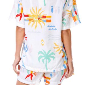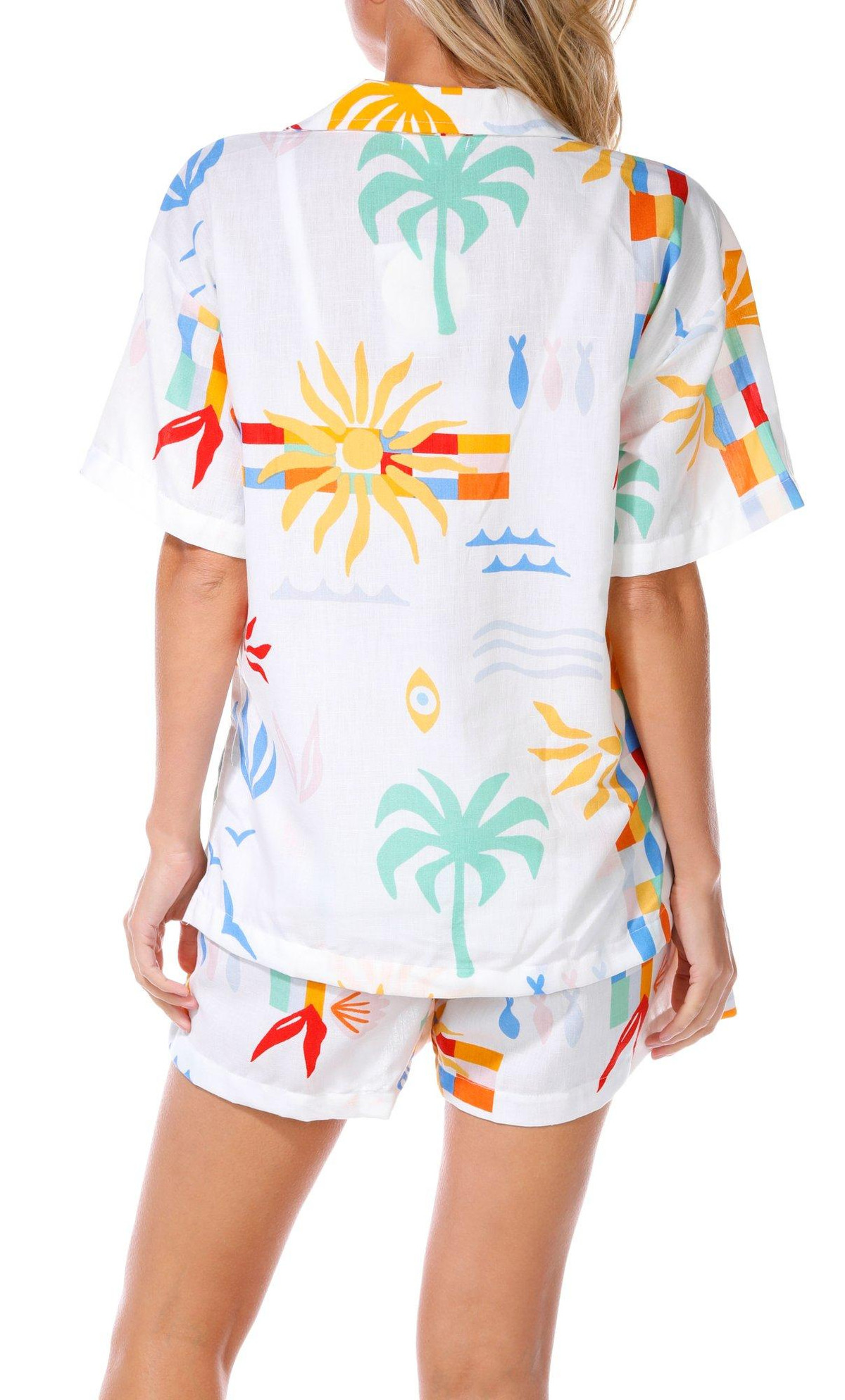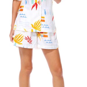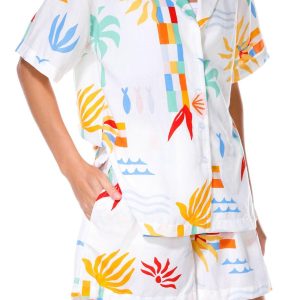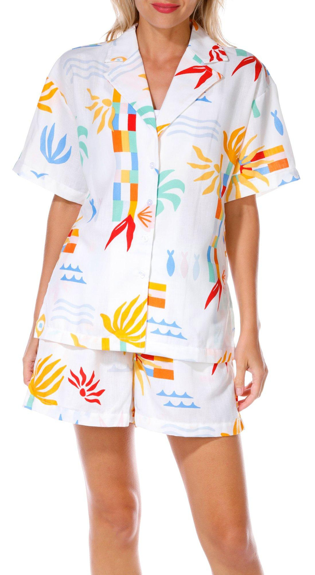 Keep it cool and coordinated with this Juniors 2 Pc Summer Print Shorts Set. Featuring a short sleeve button-down shirt with a collared neckline and matching drawstring shorts with side seam pockets, this breezy set is perfect for sunny days and effortless style. Fabrication 100% polyester