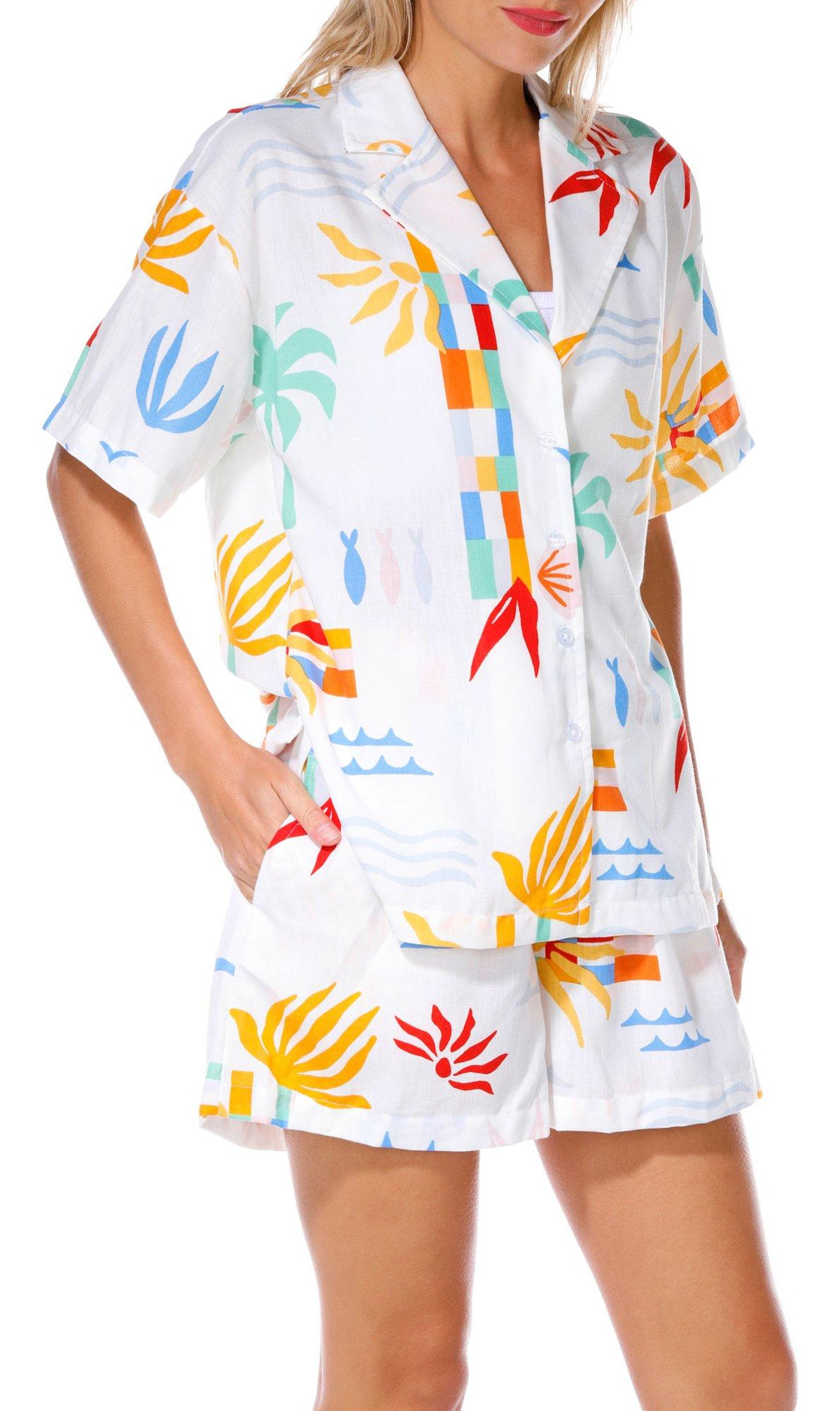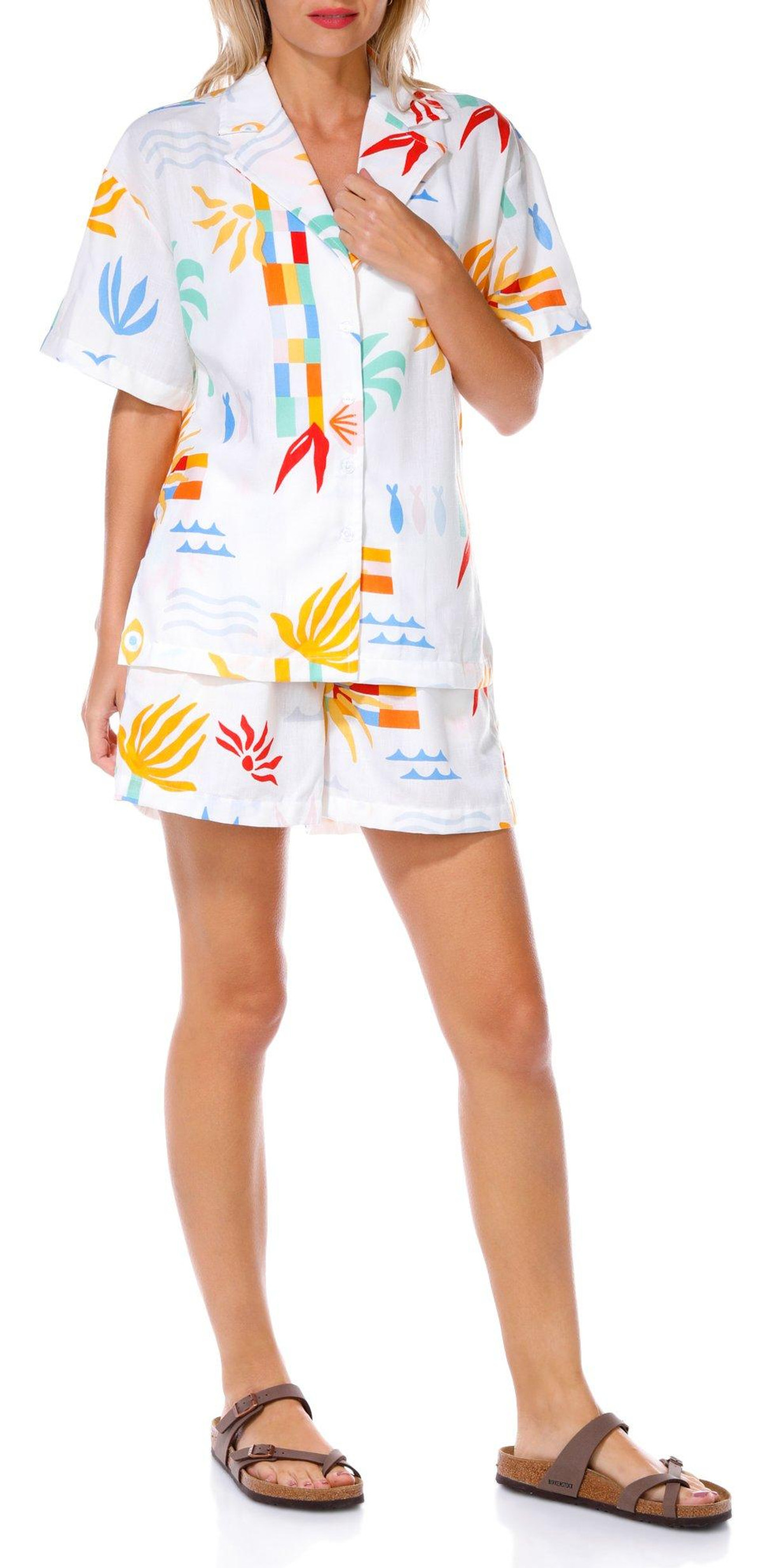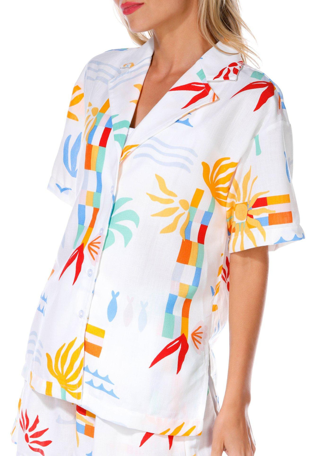 Keep it cool and coordinated with this Juniors 2 Pc Summer Print Shorts Set. Featuring a short sleeve button-down shirt with a collared neckline and matching drawstring shorts with side seam pockets, this breezy set is perfect for sunny days and effortless style. Fabrication 100% polyester