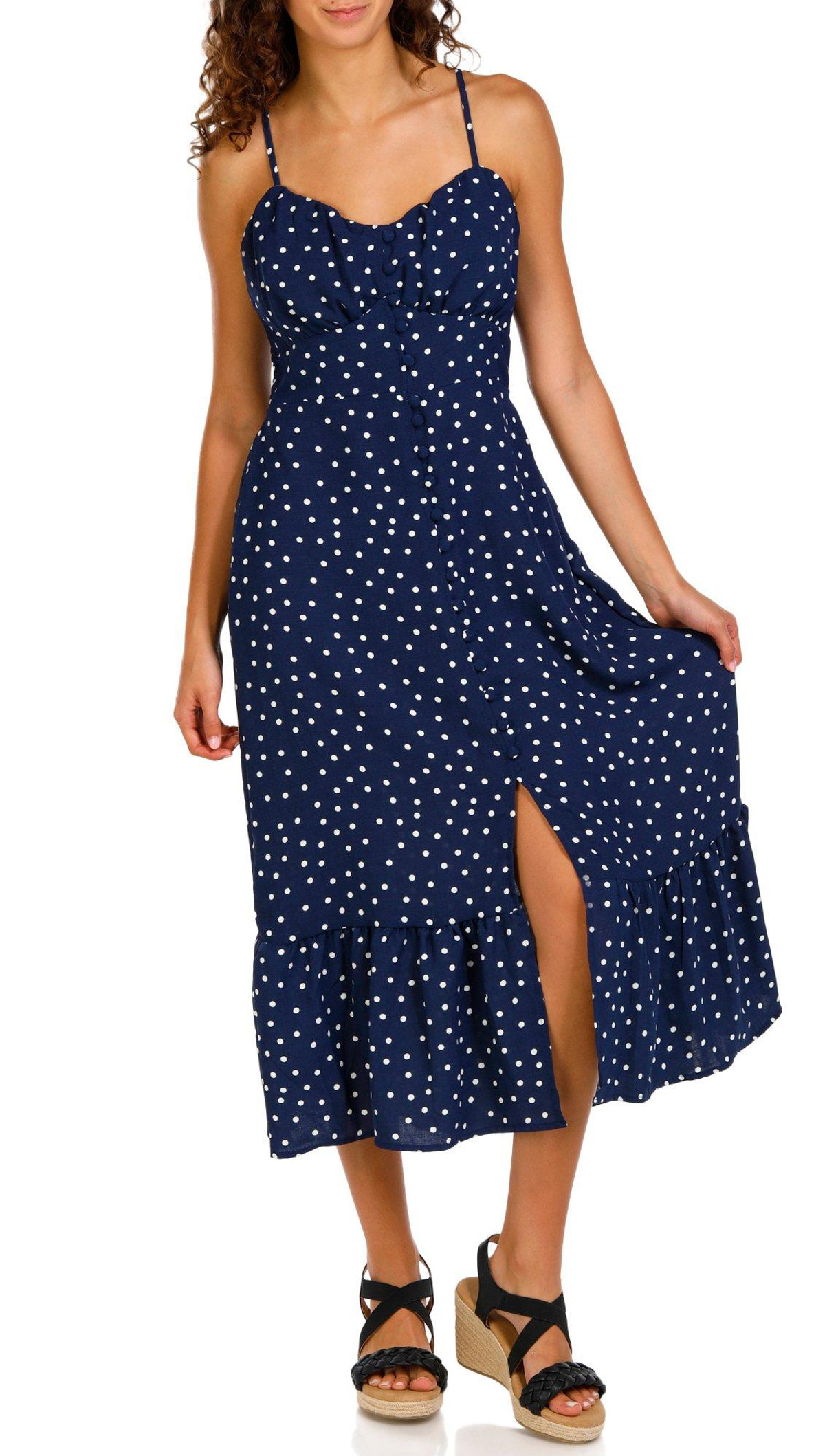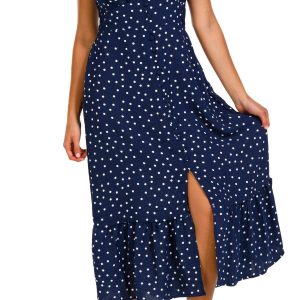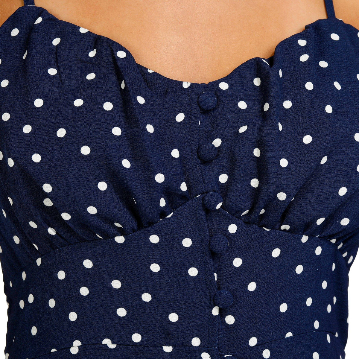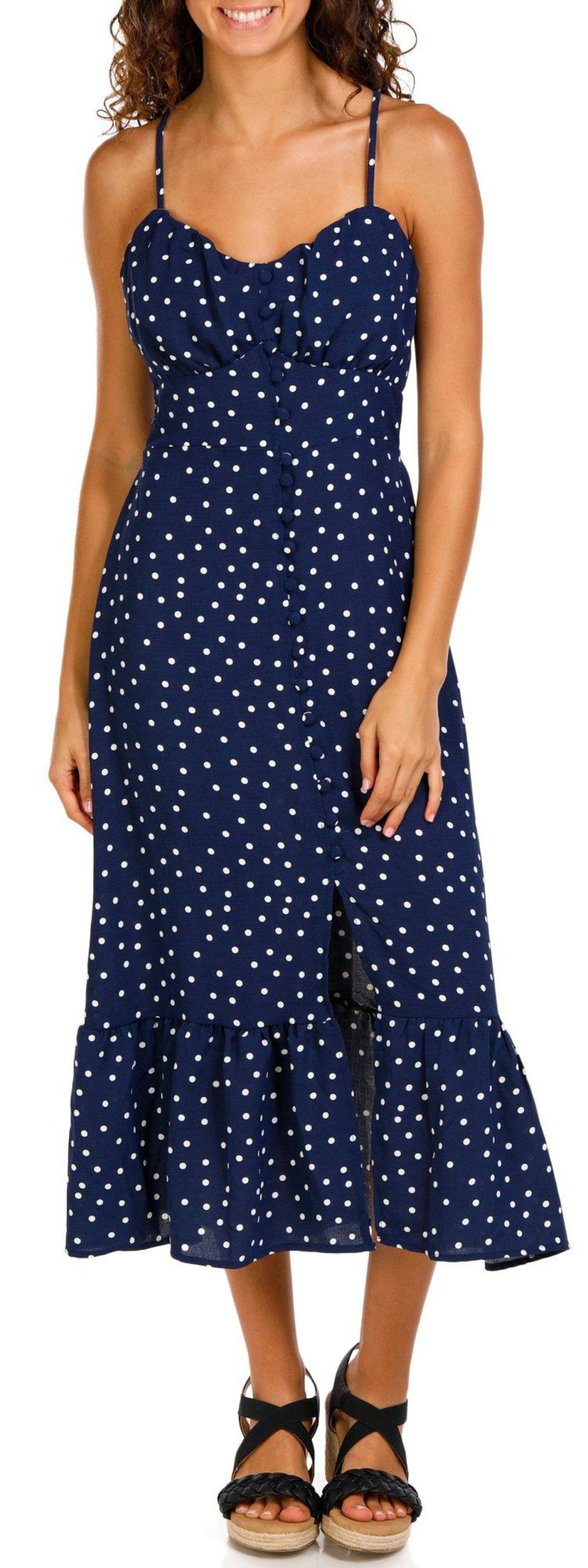 Playful and chic, this Sleeveless Flounce Dress features a classic polka dot print and a charming buttoned front. The flounce detail adds a touch of movement, making it perfect for sunny days, brunch dates, or weekend adventures.