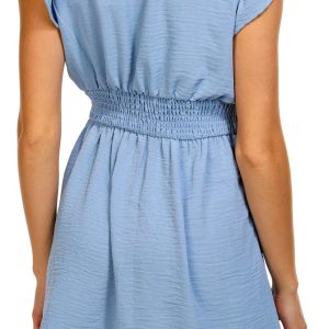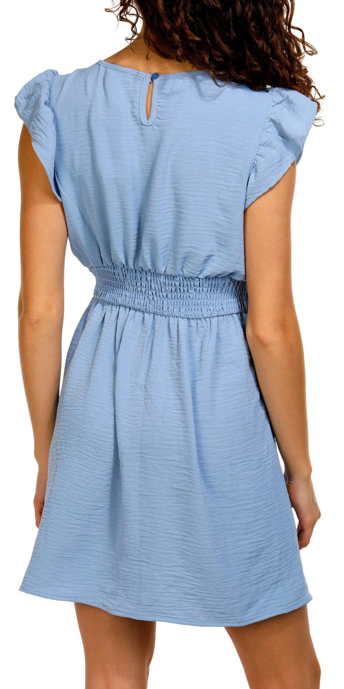 Introducing the Juniors Flutter Sleeve Mini Dress, crafted from 100% polyester for a lightweight and comfortable fit. This stylish dress features a solid color and a flattering 31-inch length. The short flutter sleeves add a touch of elegance, while the smocked waist ensures a perfect fit. The back keyhole neckline provides a chic and modern detail. Perfect for any occasion, this versatile mini dress is a must-have addition to your wardrobe.