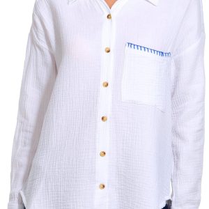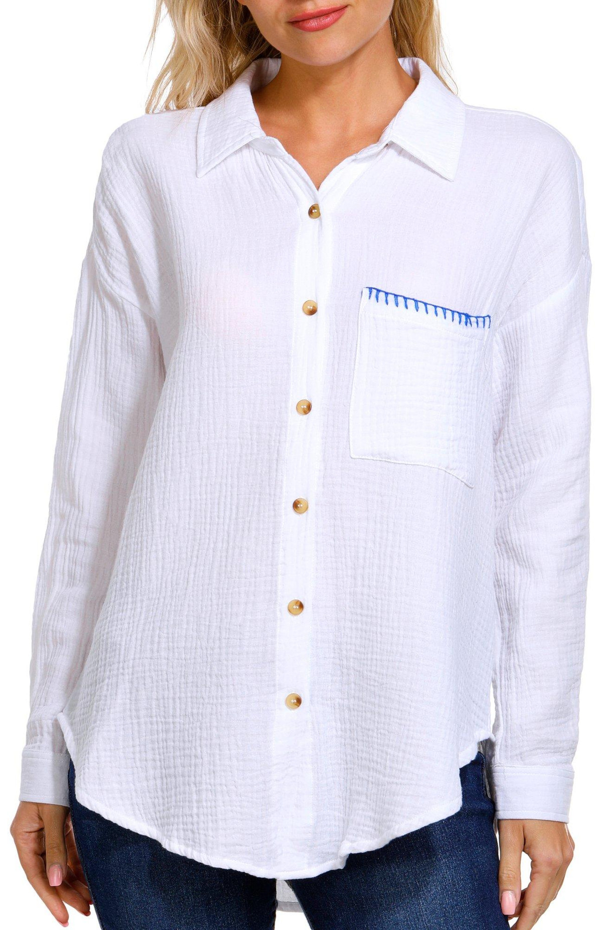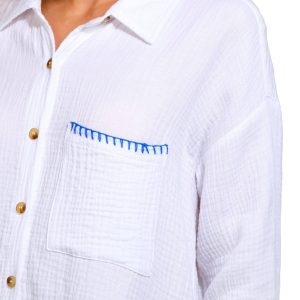 This Buttoned Long Sleeve Top is a perfect blend of comfort and elegance. Crafted from soft cotton fabric, this top ensures all-day comfort while maintaining a stylish look. The buttoned front adds a classic touch, complemented by embroidered accents and motif that bring a unique and sophisticated flair. The addition of a chest pocket adds both functionality and a casual element. Top length measures approximately 22 in.