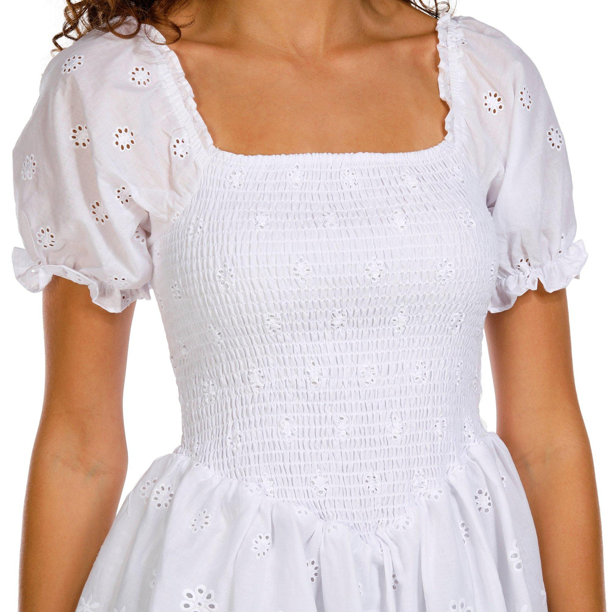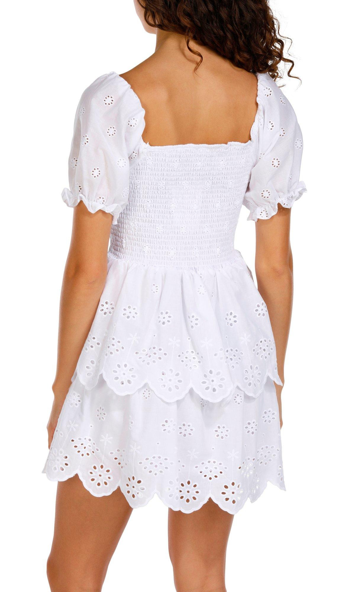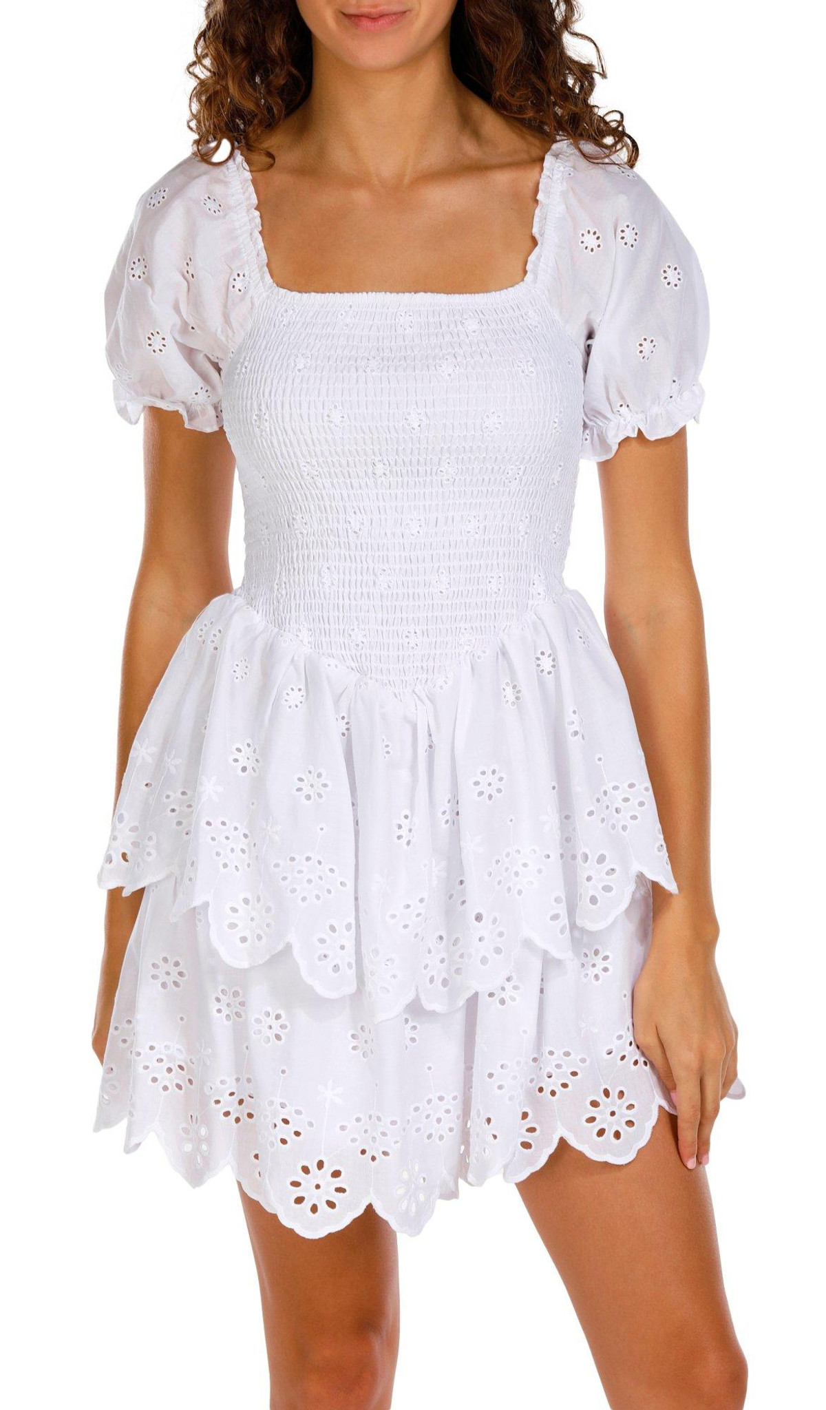 Embrace sweet style with this Mini Dress, featuring short puff sleeves, a tiered silhouette, and delicate eyelet details. Light and breezy, it is perfect for garden parties, picnics, or sunny strolls.