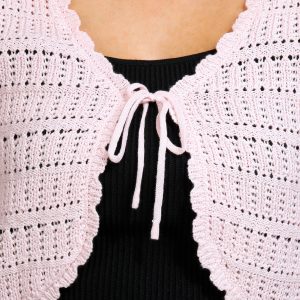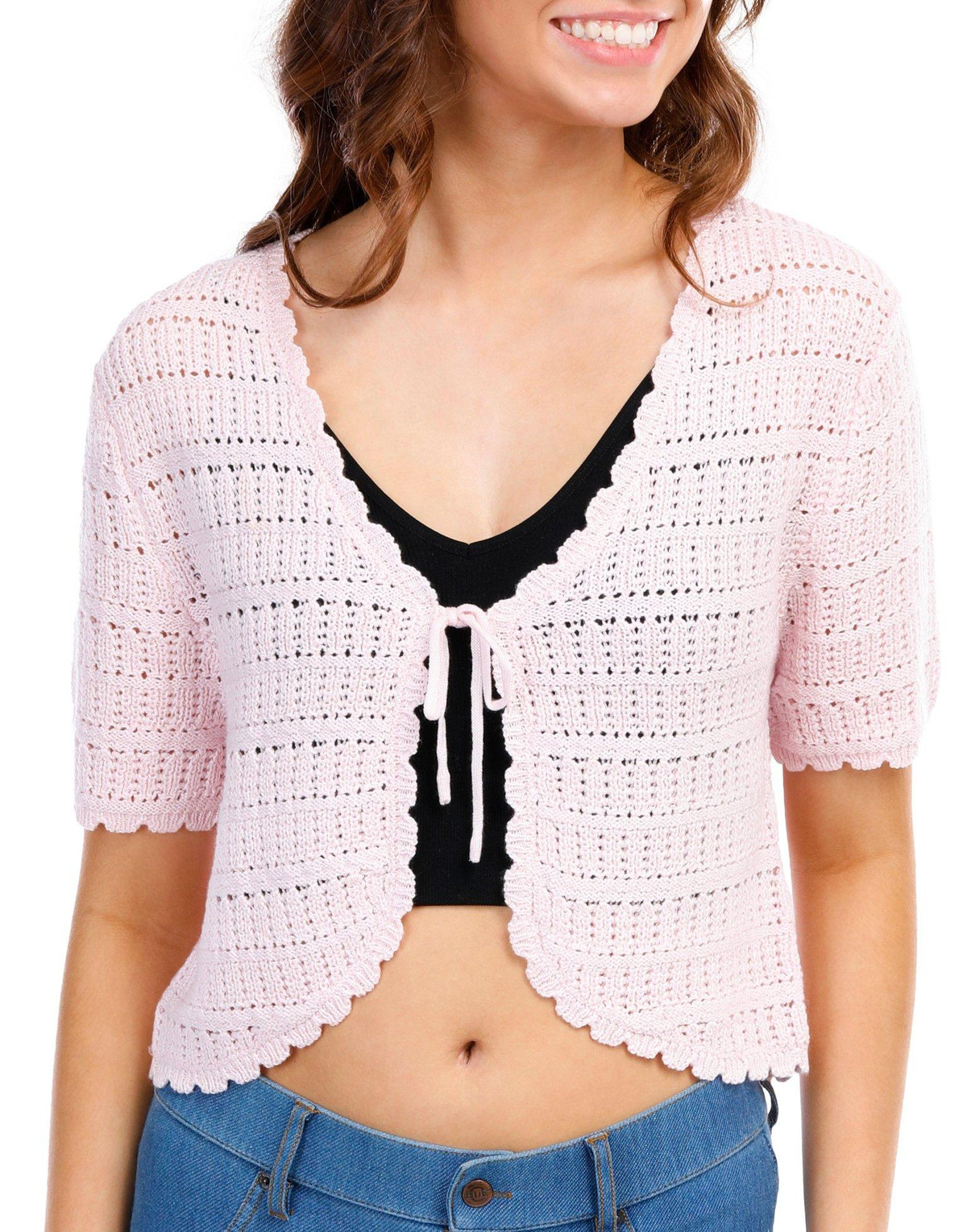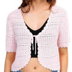 Enhance your wardrobe with our Juniors Short Sleeve Tie Front Crochet Cardigan. Made from a blend of cotton and acrylic, this cardigan features a stylish solid color and a charming tie front. The short sleeves and scallop trim on the sleeves add a touch of elegance, while the cropped fit provides a modern twist. Perfect for layering over your favorite outfits, this cardigan is a versatile and chic addition to your collection.