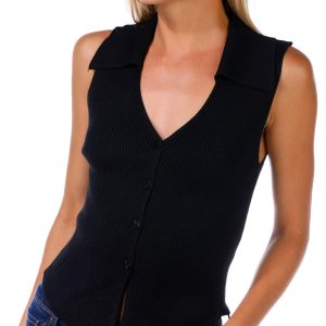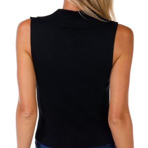 This juniors top features a solid ribbed texture with a button down front and a sleek johnny collar. The sleeveless design adds a modern touch, making it a versatile piece for layering or wearing on its own. Fabrication 80% rayon, 20% polyester