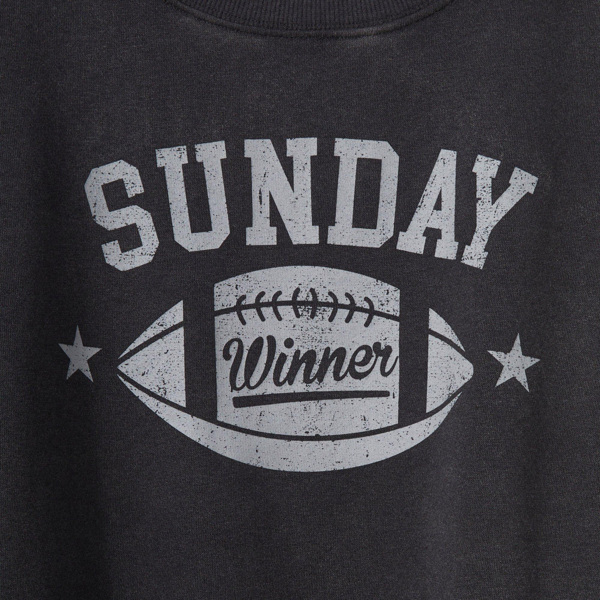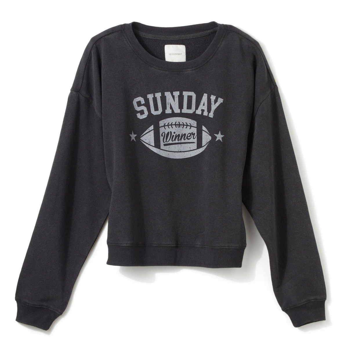 This juniors pullover sweater features a classic crewneck and Sunday football design. Soft knit adds comfort perfect for game day style and casual wear. Fabrication is 60% cotton and 40% polyester.