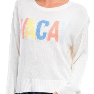 Introducing the Juniors Vacay Sweater, made from 100% acrylic for a soft and cozy feel. This trendy sweater features a classic round neckline and a playful Vacay script on the chest, adding a fun and relaxed vibe to your outfit. Perfect for casual outings or lounging at home, this sweater combines comfort and style effortlessly.