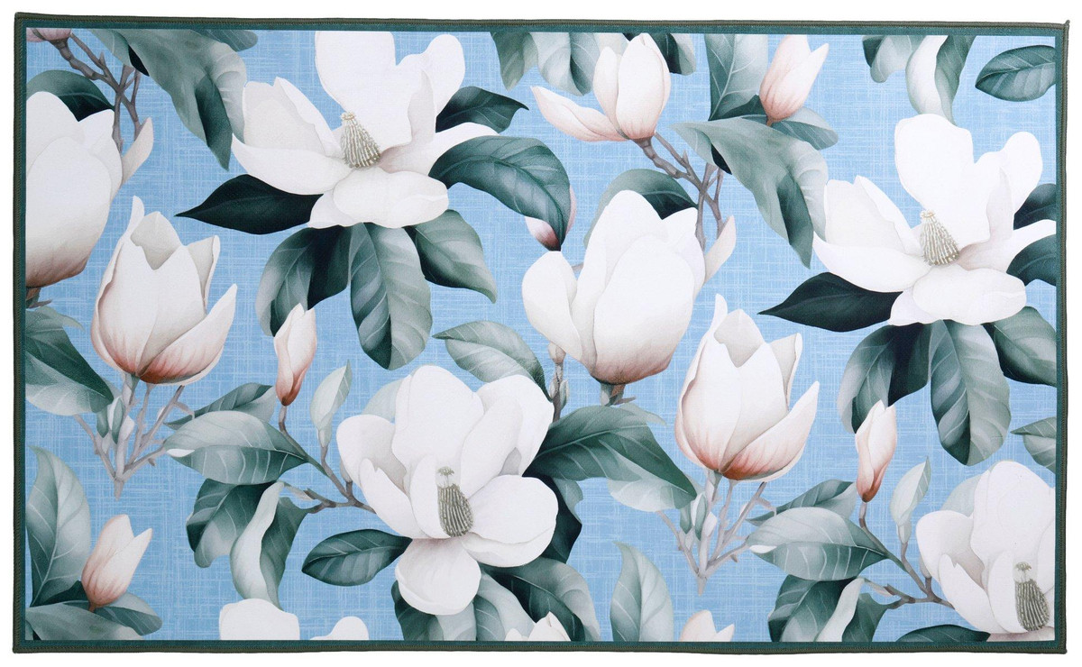 Add a touch of nature to your home with this 27 by 45 indoor accent rug in beautiful blue and green, highlighted by delicate white flowers. Made from 100 percent polyester, it feels soft underfoot and is machine washable for easy care. Perfect for brightening bedrooms, entryways, or living spaces.