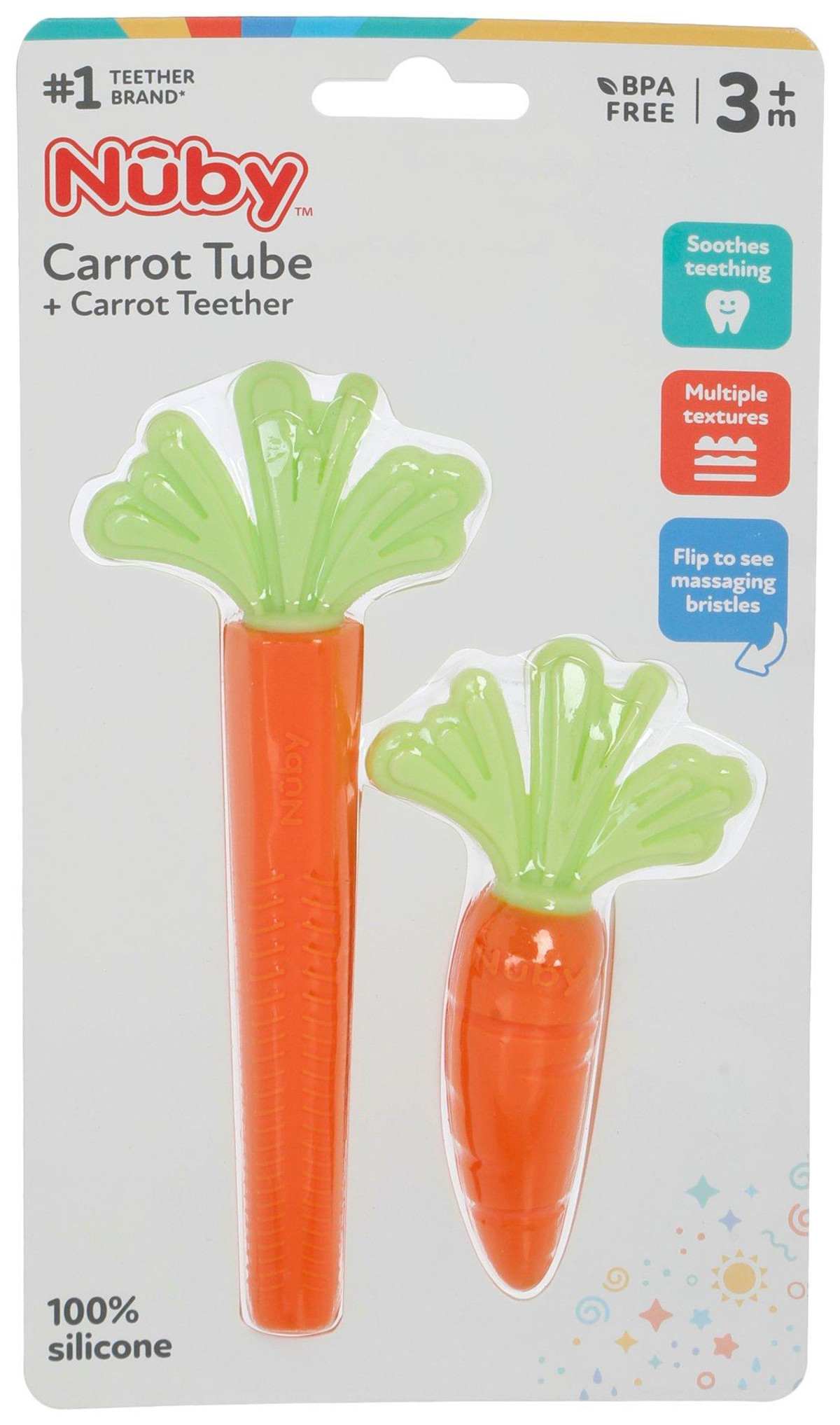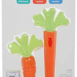 This two pack Carrot Teether & Carrot Tube teether pack helps make teething easier for your little ones! he multi-textured surfaces encourage tactile exploration and massage baby’s sore gums as they teethe. The Carrot Teether and Carrot Tube Teethers are made of soft, flexible silicone so they provide just the right relief for fussy babies.