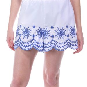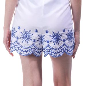 Add a touch of charm with the Womens Embroidered Scalloped Shorts. Featuring a stylish embroidered design, scalloped hem, elastic waistband, and side seam pockets, these shorts offer a breezy 3-inch inseam. Fabrication is 100% cotton.