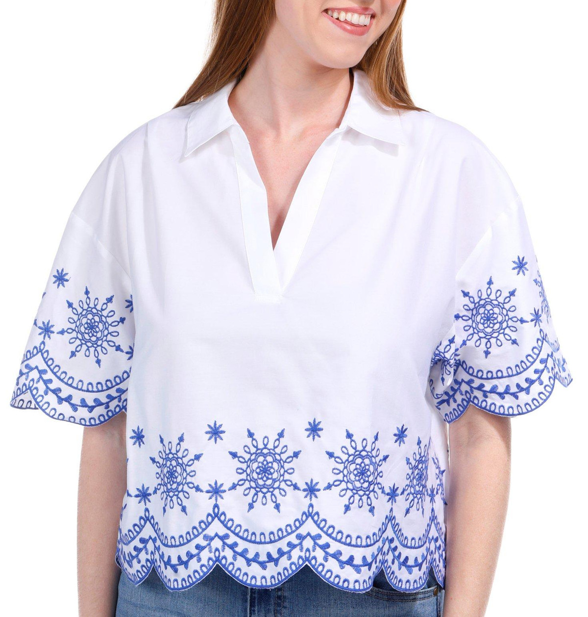 Our Short Sleeve Embroidered Top features a scalloped hem, embroidered design, short sleeves, and a split collared neckline. This lightweight piece adds a touch of charm to any casual outfit, perfect for warm days. Fabrication is 100% cotton.