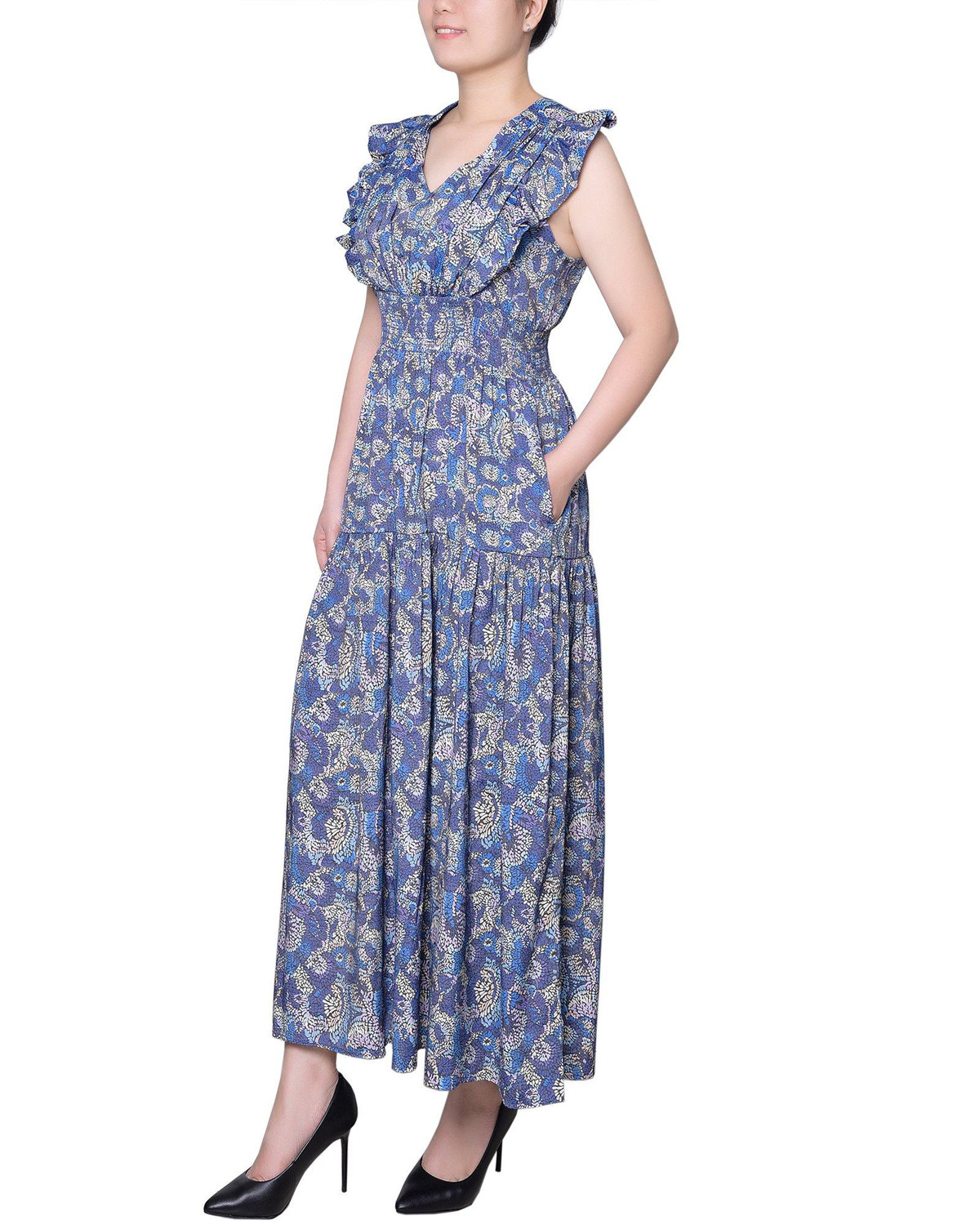 Embrace vintage charm with this sleeveless midi dress, featuring a tiered design and a v-neckline adorned with ruffle details. The shirred smocked waist enhances your silhouette, making it perfect for sunny days or carefree nights. The vintage-inspired floral design adds a touch of nostalgia, ideal for gatherings with friends and family. This dress effortlessly combines elegance and comfort, ensuring you look and feel fabulous on any occasion. Length 50 in. Fabrication 62% rayon, 38% polyester.