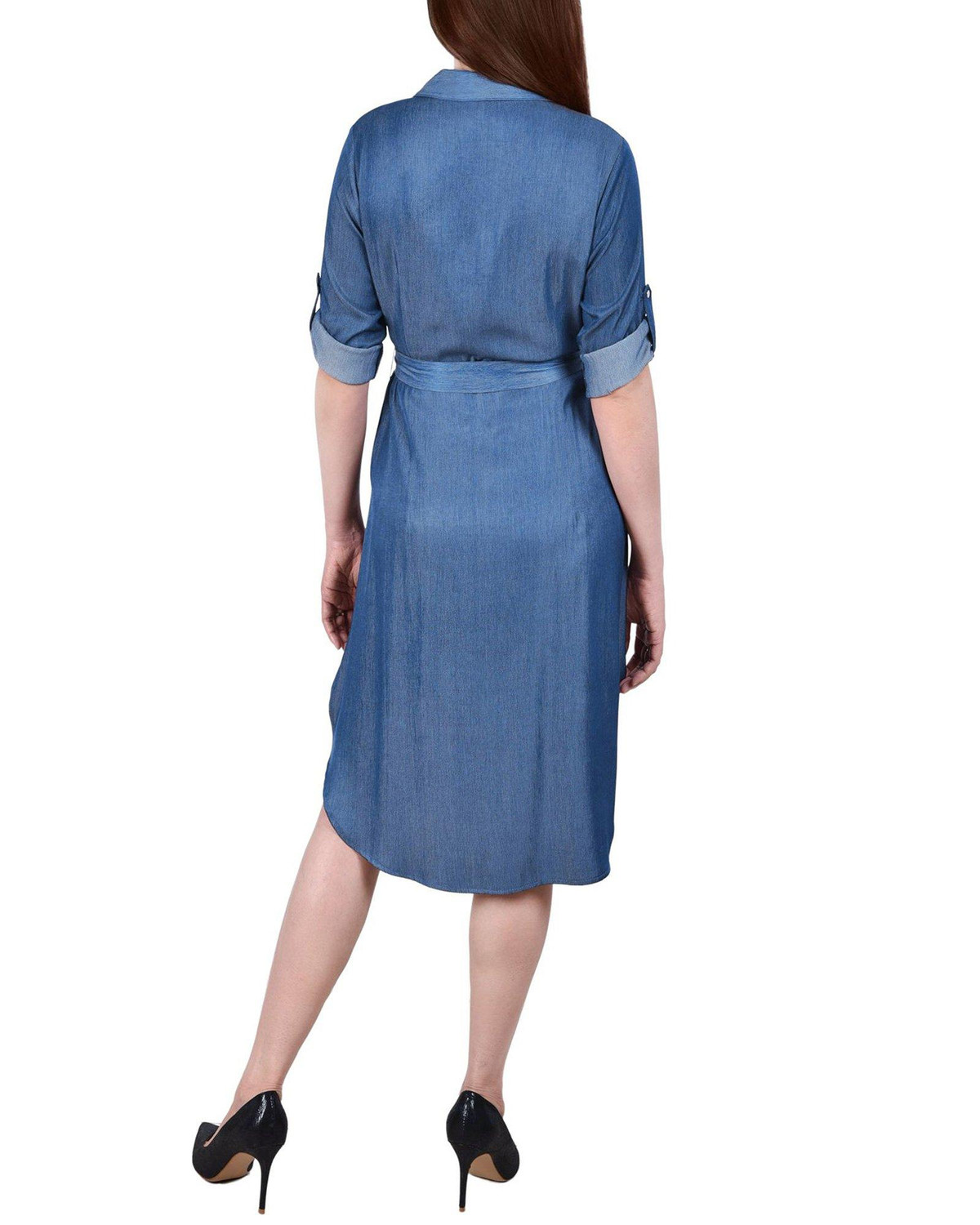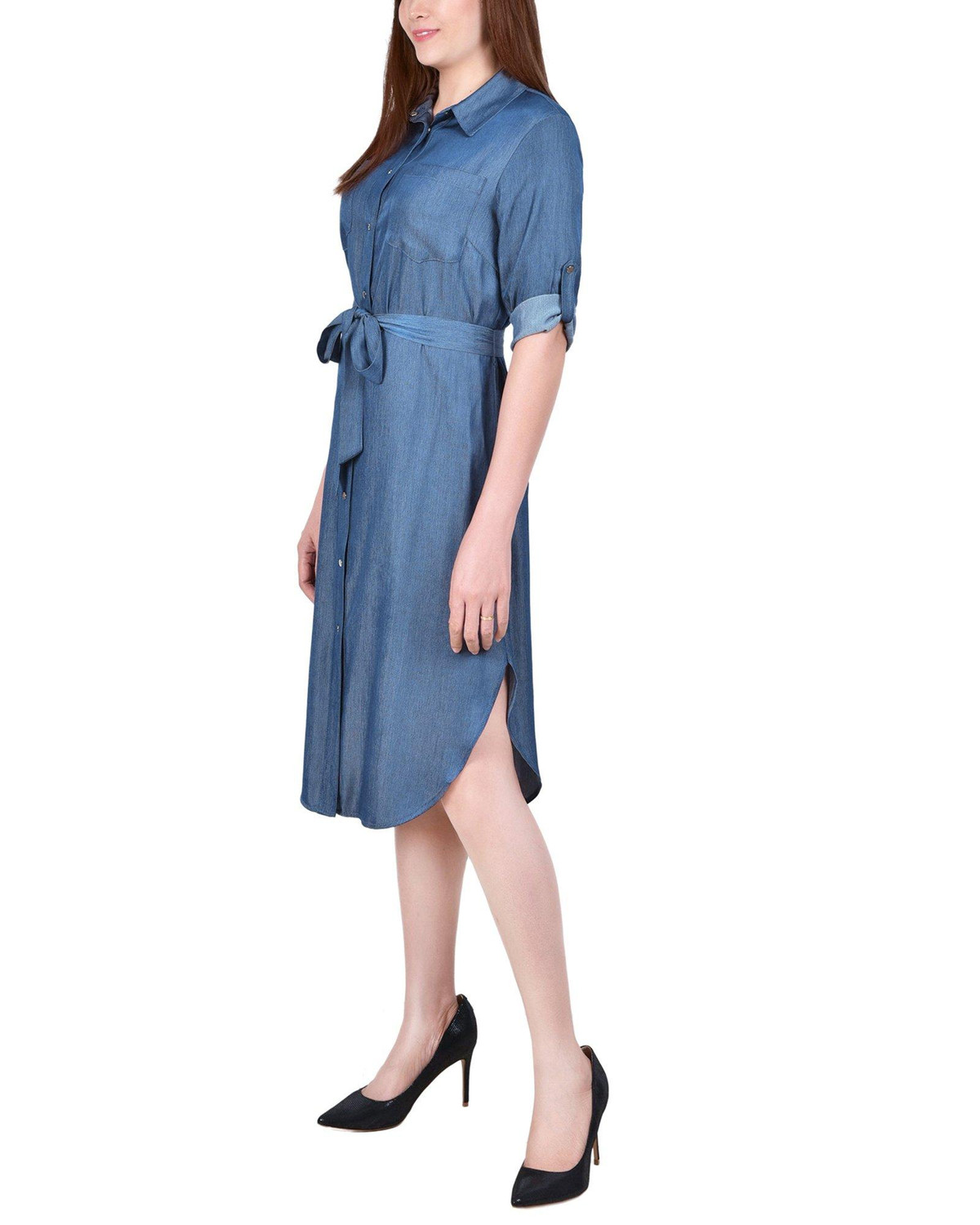 This Roll Tab Sleeve Denim Dress with full button front with a self belt and below the knee length.