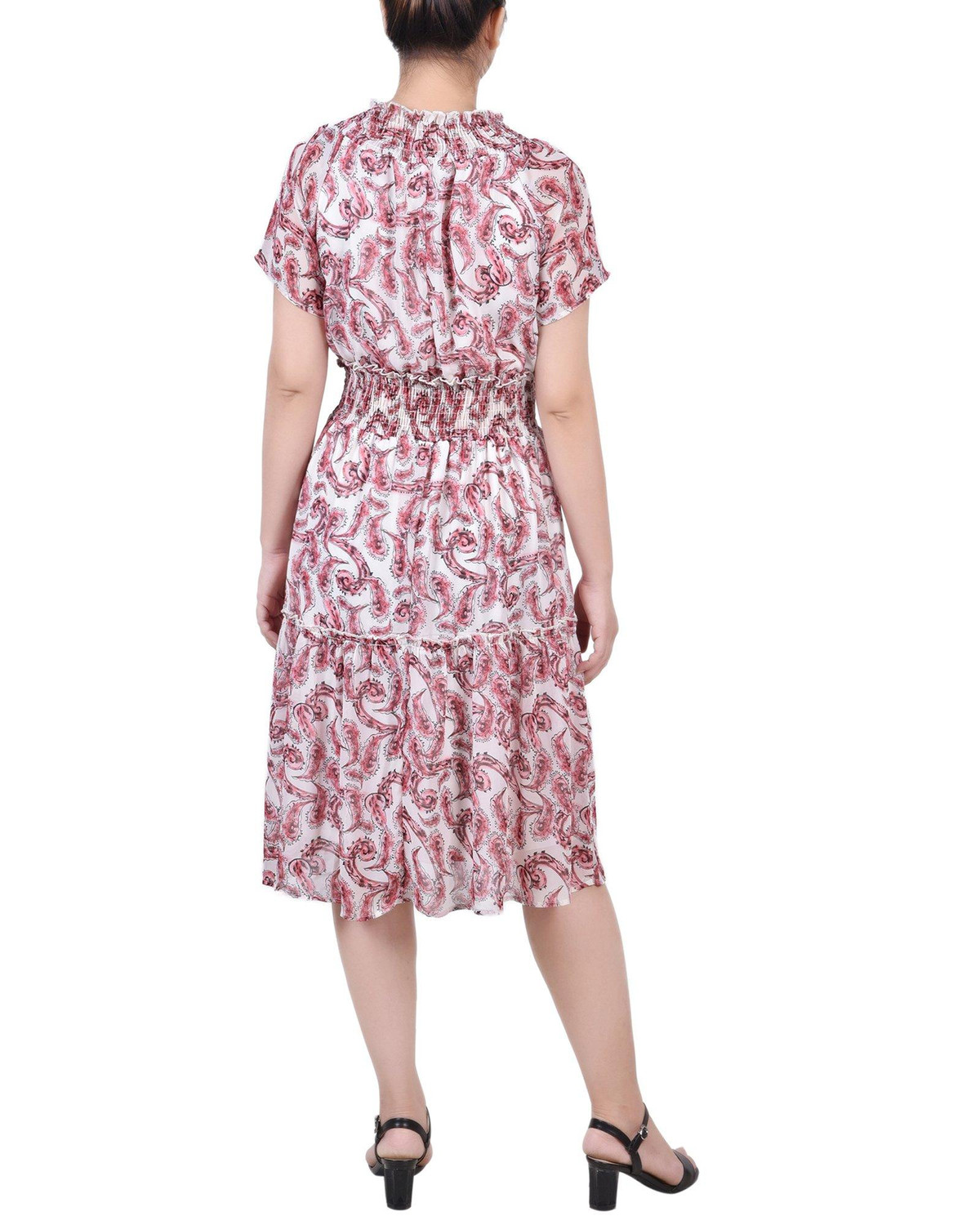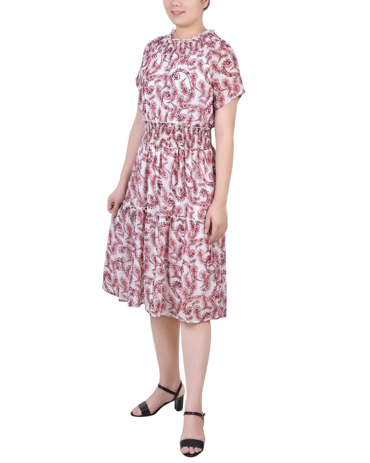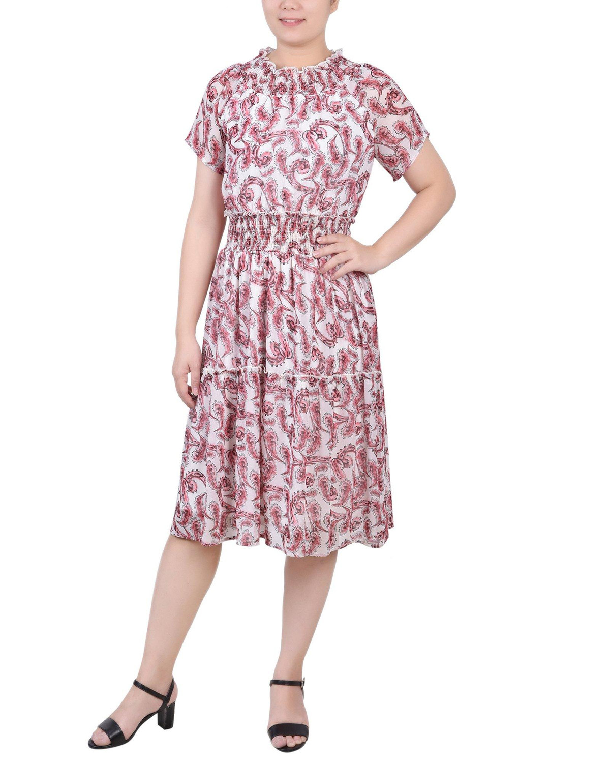 With ruffled neck and smocked waist, this NY Collection dress is perfect for office days and cocktail parties alike.