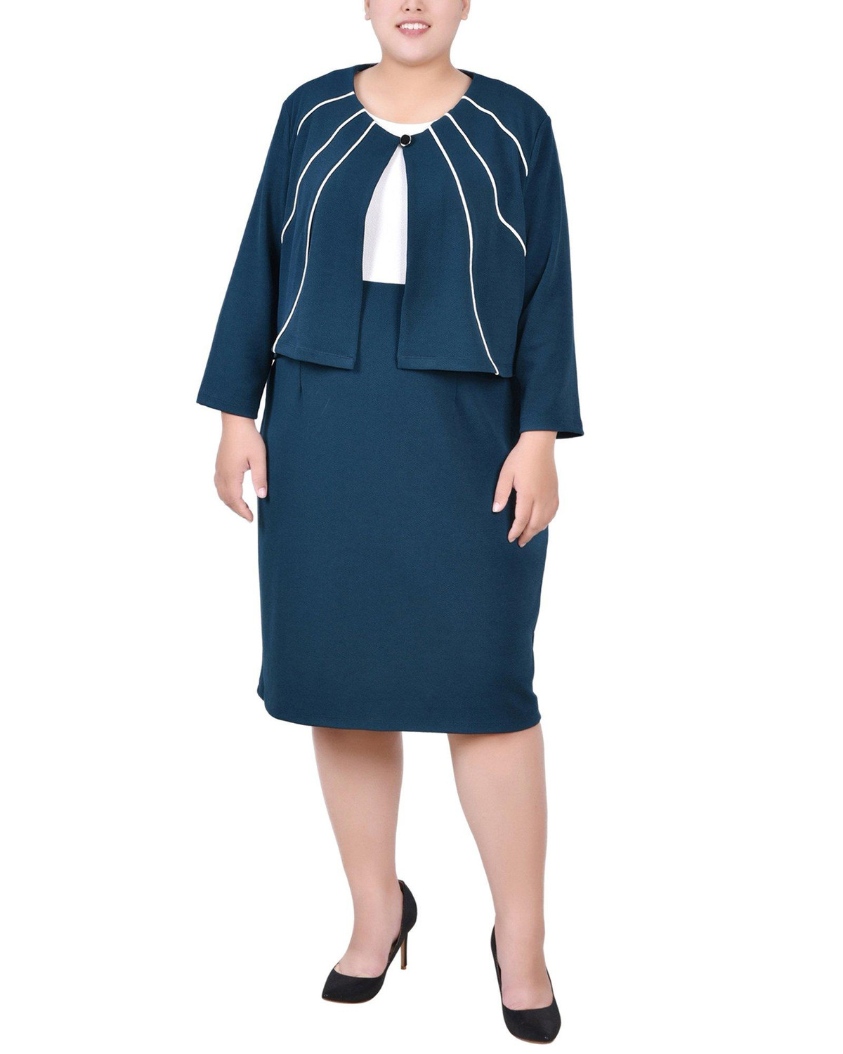 With bold contrast piping details, this NY Collection color-blocked dress is layered under a 3/4 sleeve jacket, perfect for any work day.