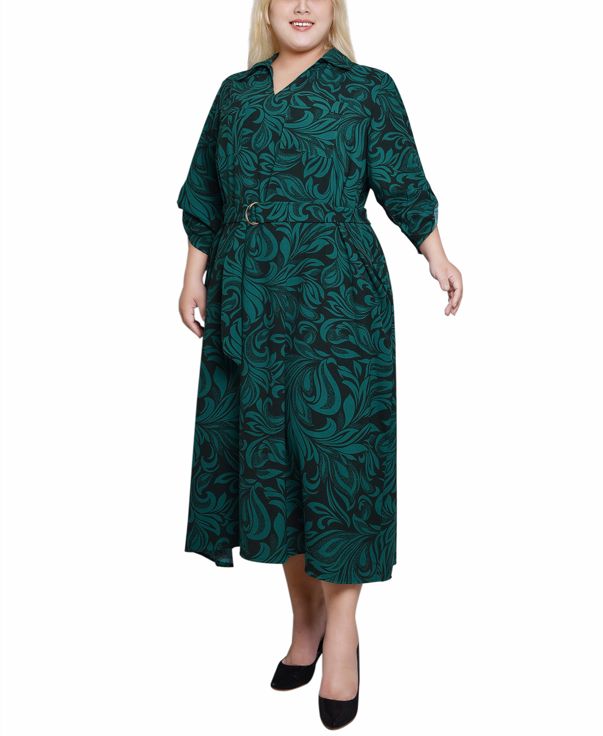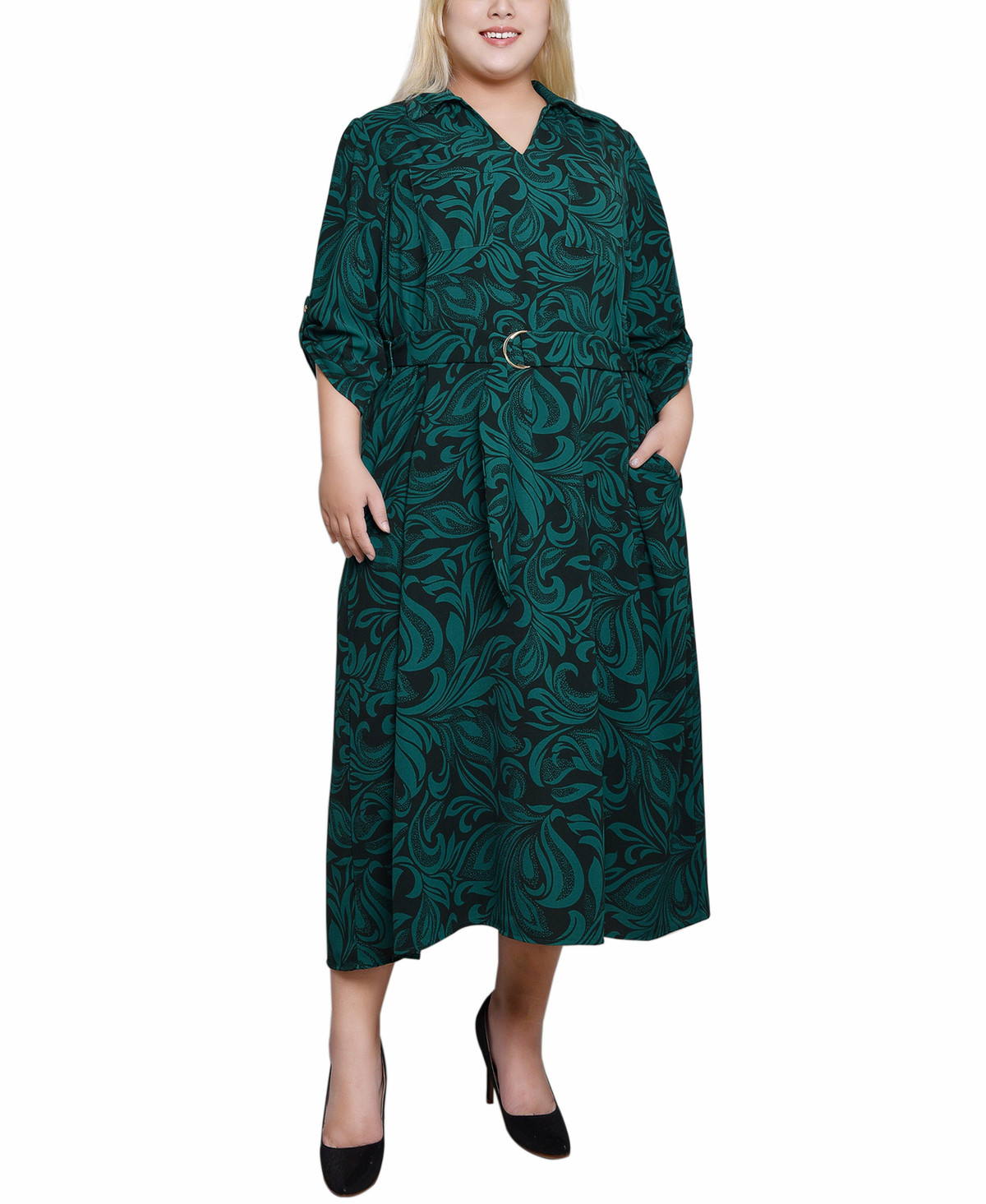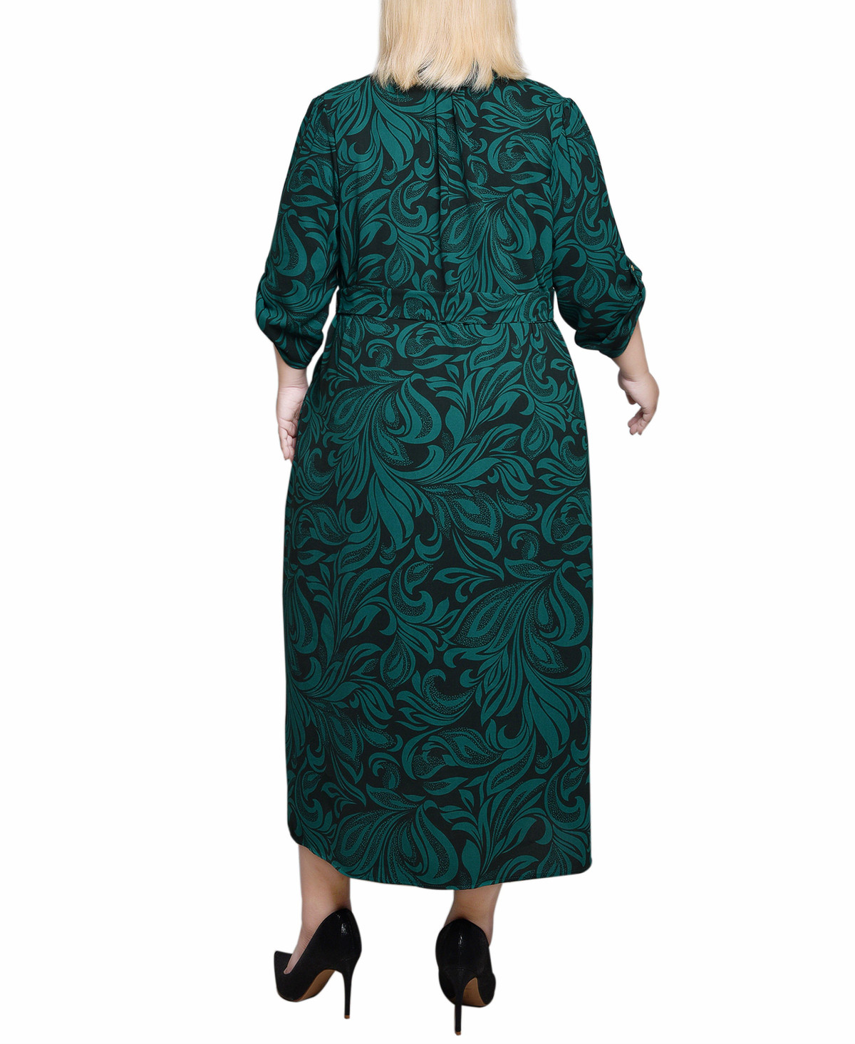 Elevate your work wardrobe with this classic and sophisticated midi dress, perfect for transitioning seamlessly from the office to lunch meetings. Featuring a belted waist for a flattering silhouette, this dress boasts 3/4-length roll tab sleeves that add a touch of versatility and style. Its professional design ensures you look polished and confident, making it an essential piece for any career-driven individual. Dress length approximatley 48 in. Fabrication 100% polyester.