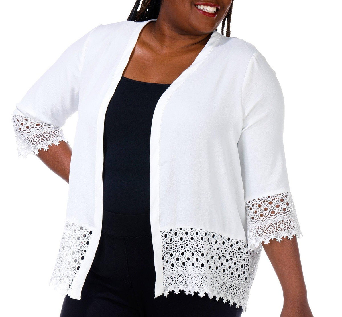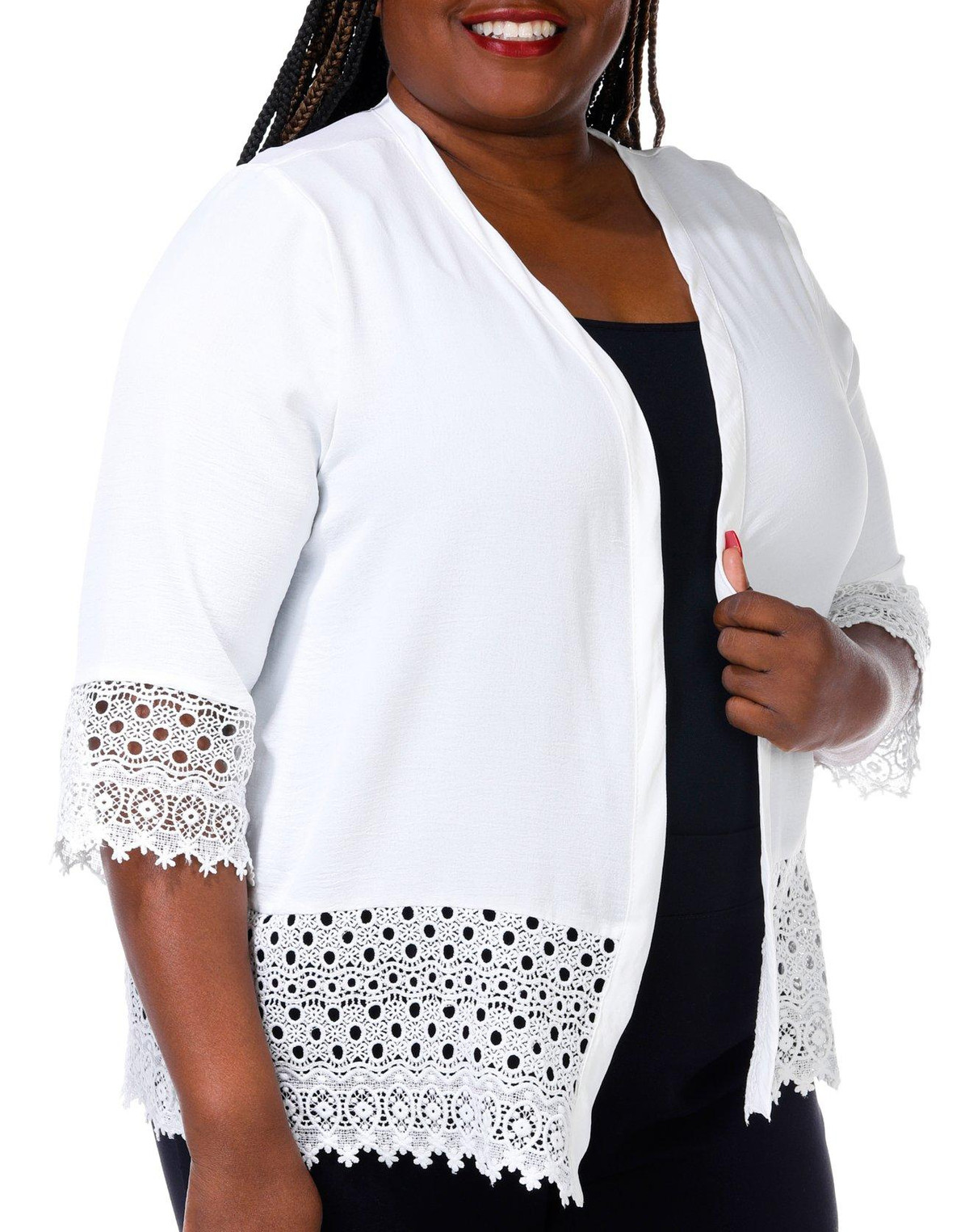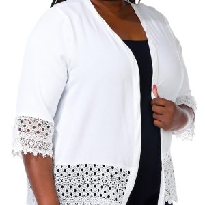 This plus size cardigan features a stylish solid color with long sleeves trimmed in crochet. The open front design and crochet hem add a breezy, feminine touch, making it a perfect lightweight layer for any season. 100% polyester