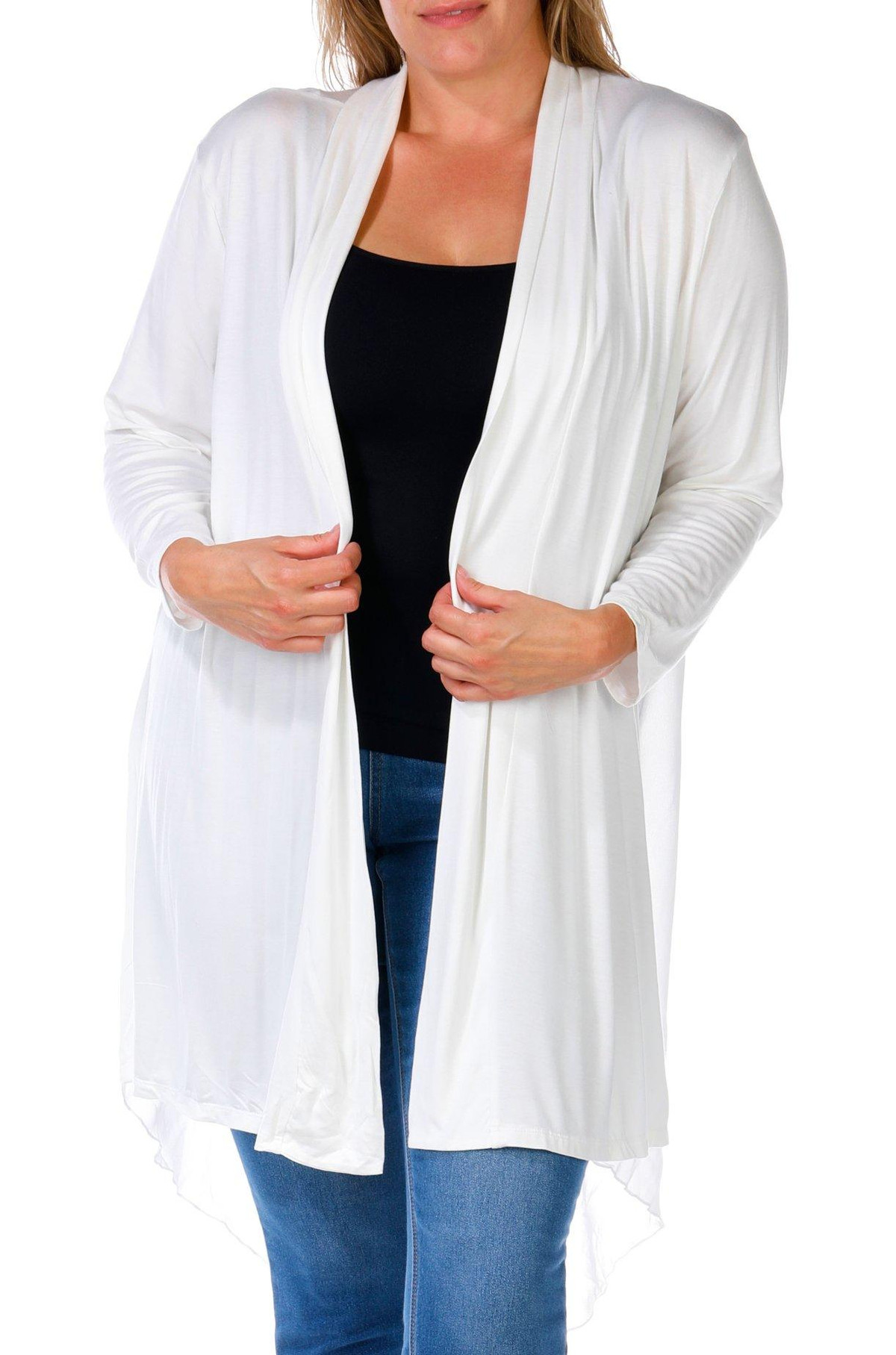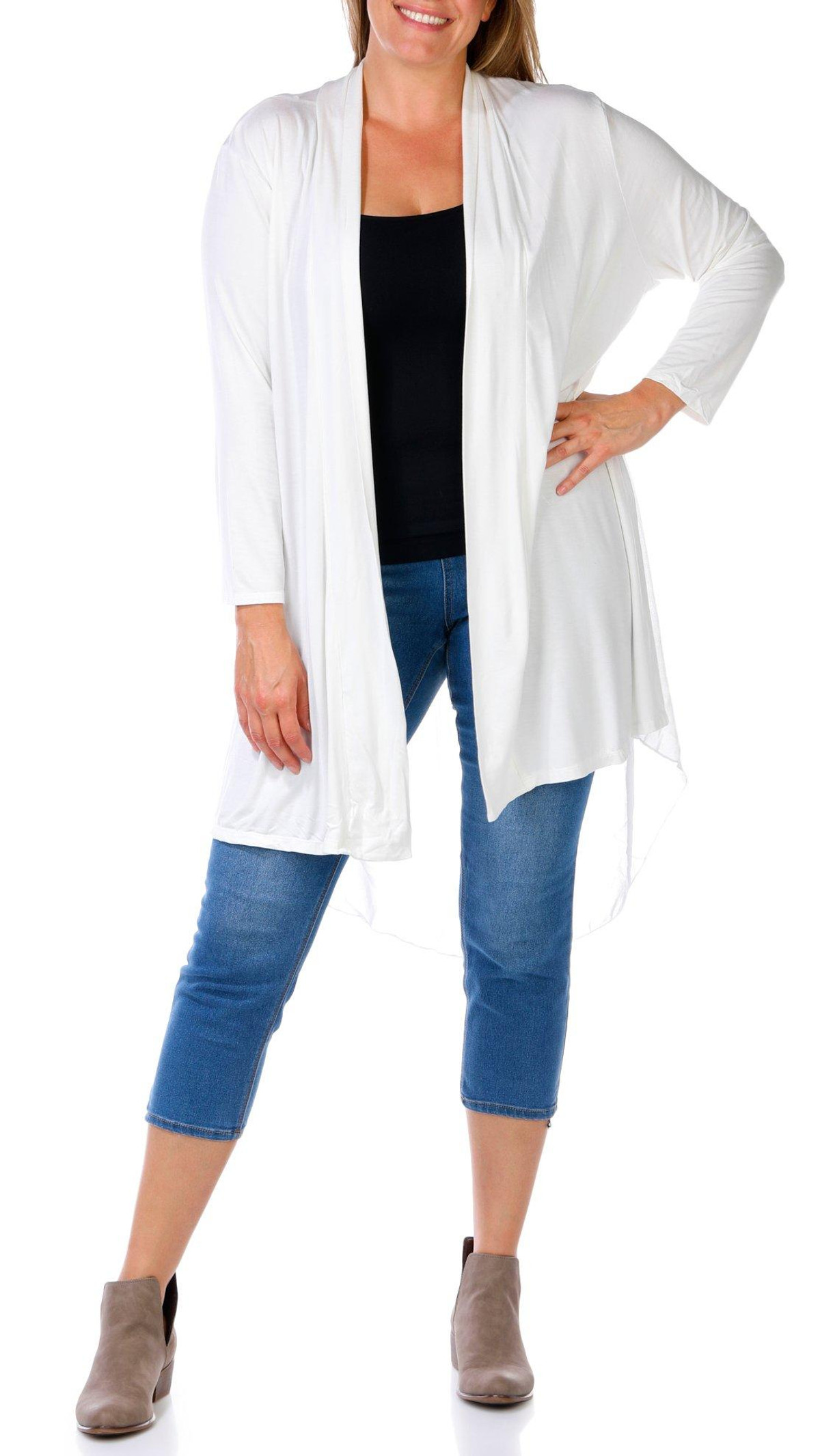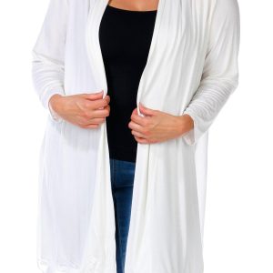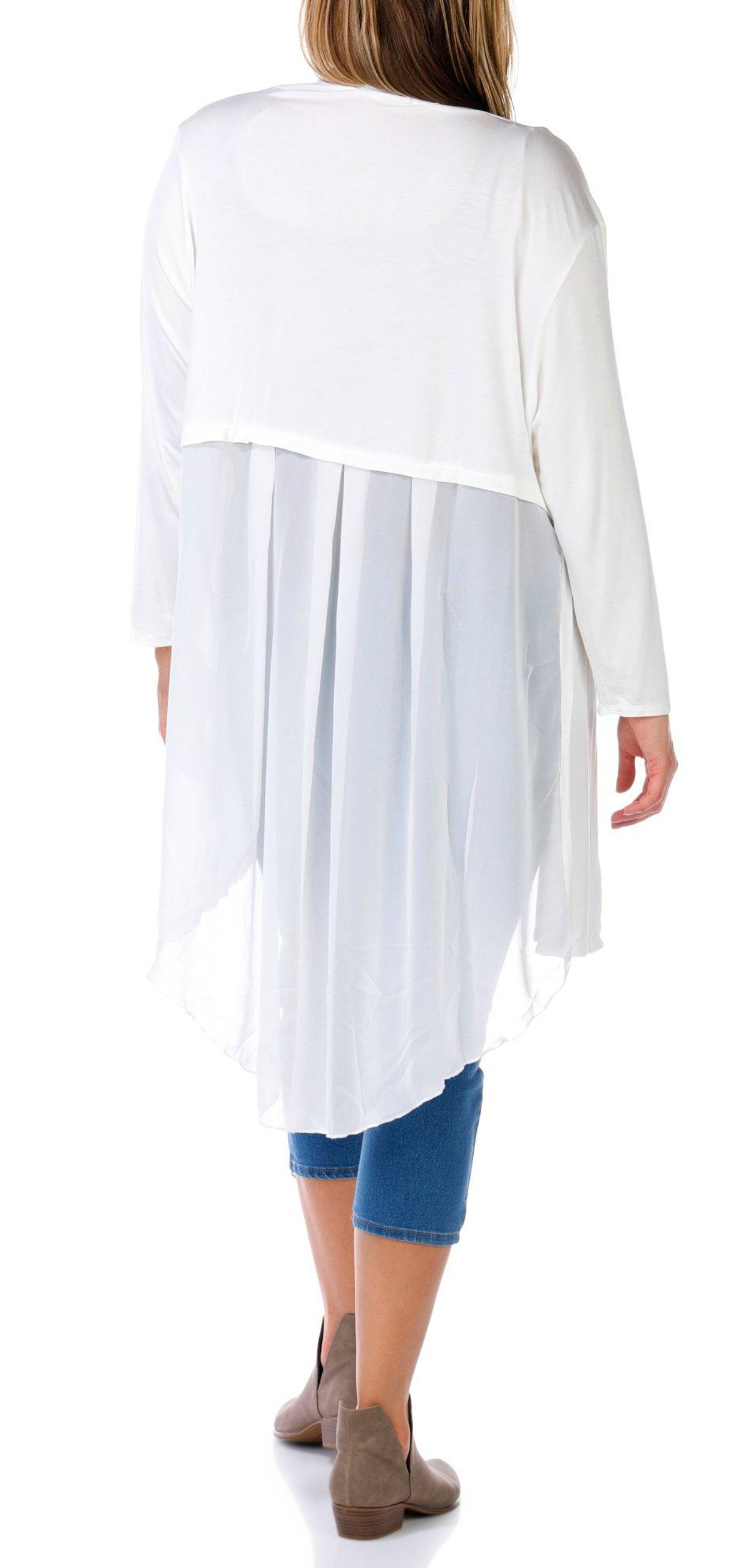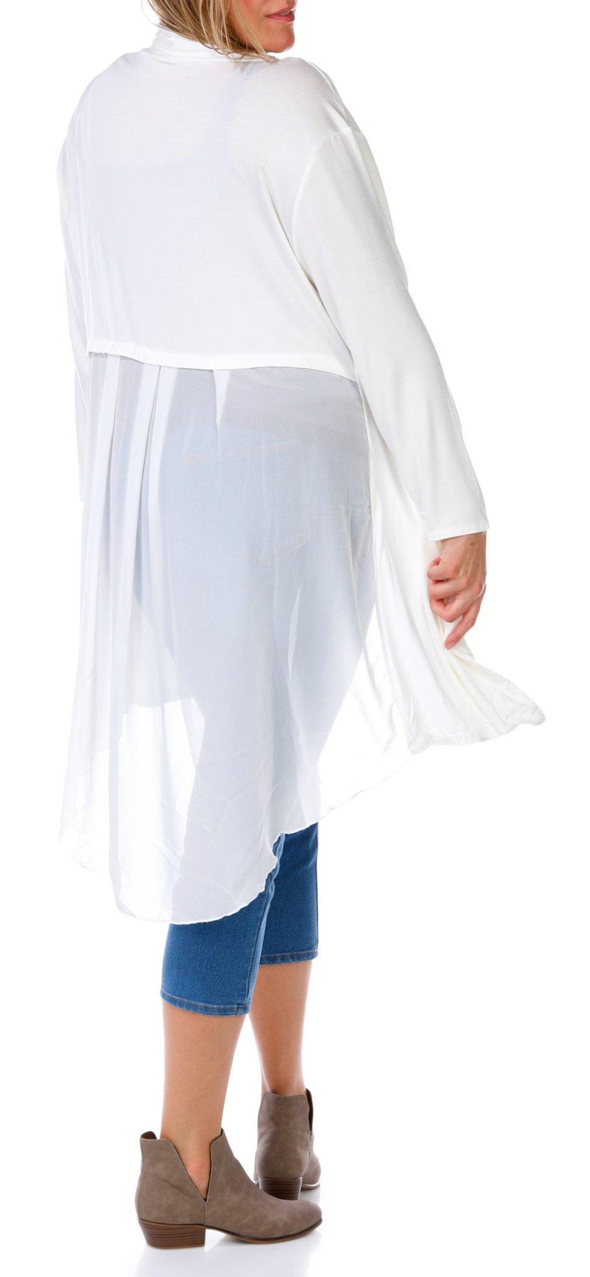 This women’s long sleeve cardigan is the epitome of effortless elegance. Made from a soft, flowy fabric that drapes beautifully, it features a sheer chiffon panel in the back for a touch of airy sophistication. The elongated silhouette adds graceful movement, making it a chic layering piece for any season. Self fabrication is 95% rayon and 5% spandex, contrast fabrication is 100% polyester.