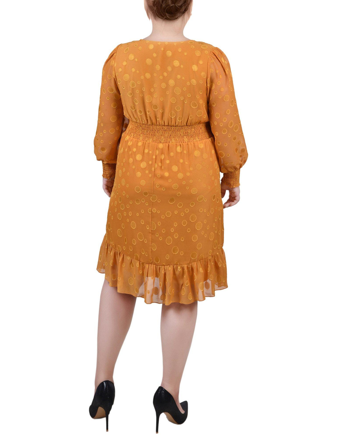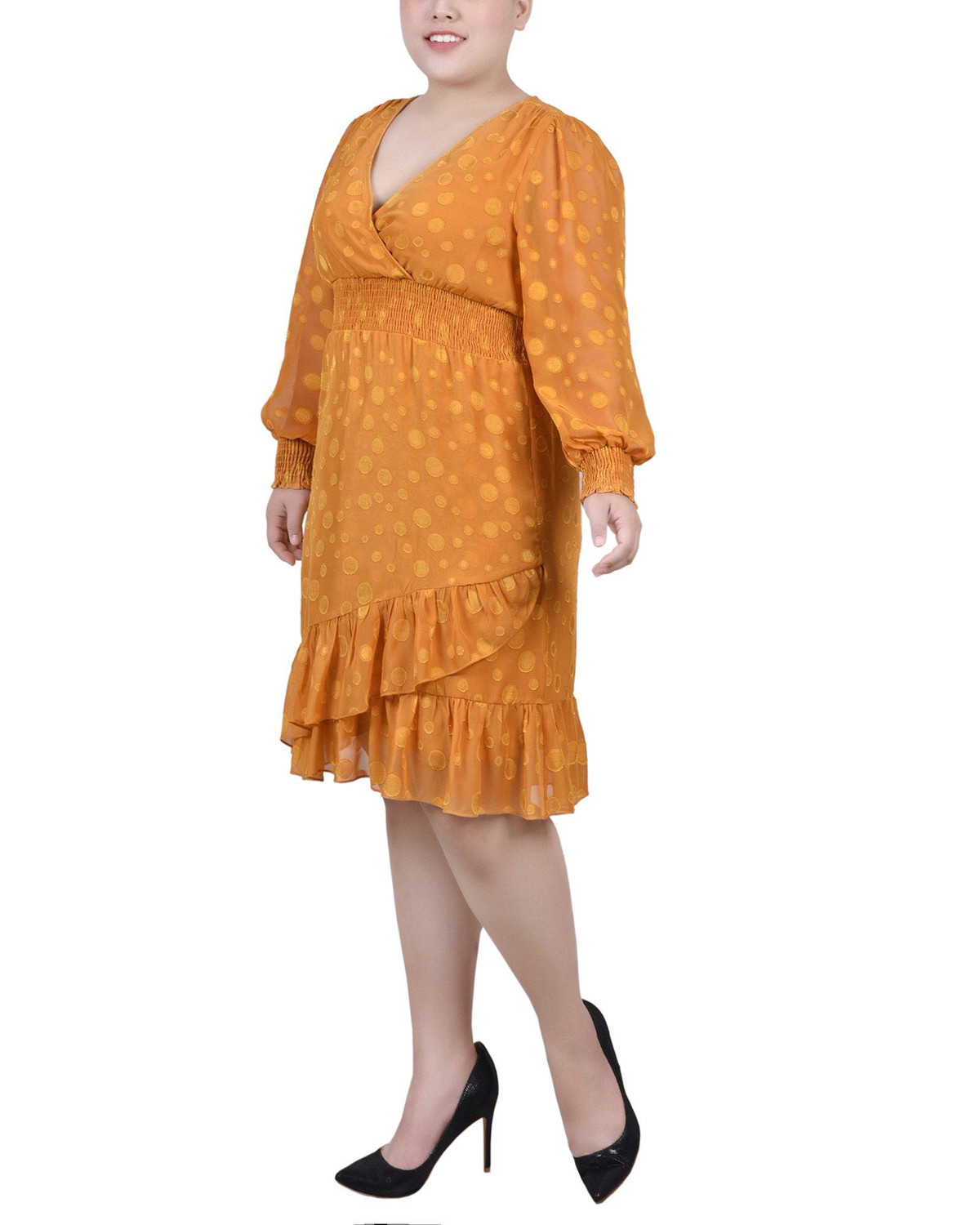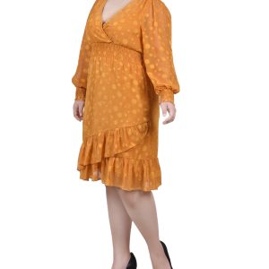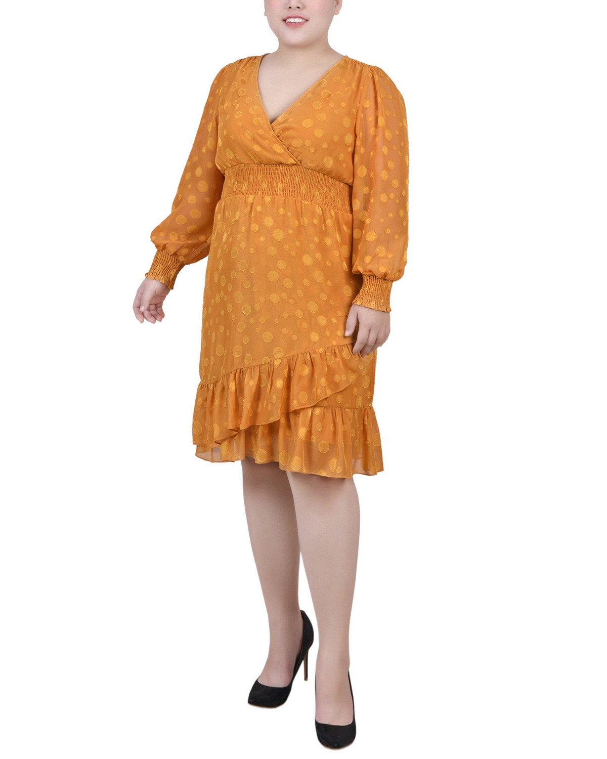 You’ll be ready for any special occasion in this dotted chiffon dress from NY Collection. The smocking cuff and waist make this a comfortable choice.