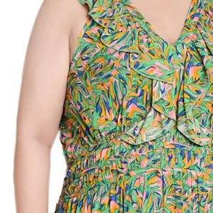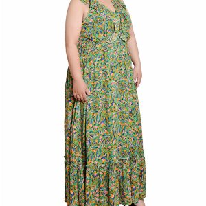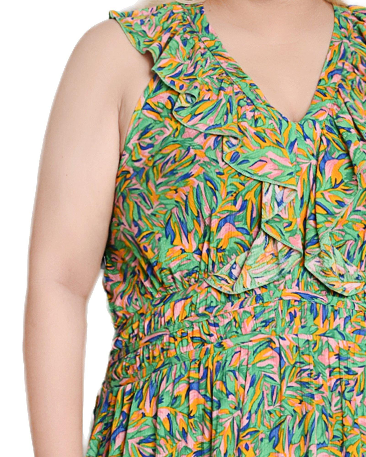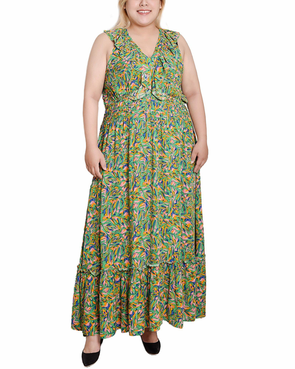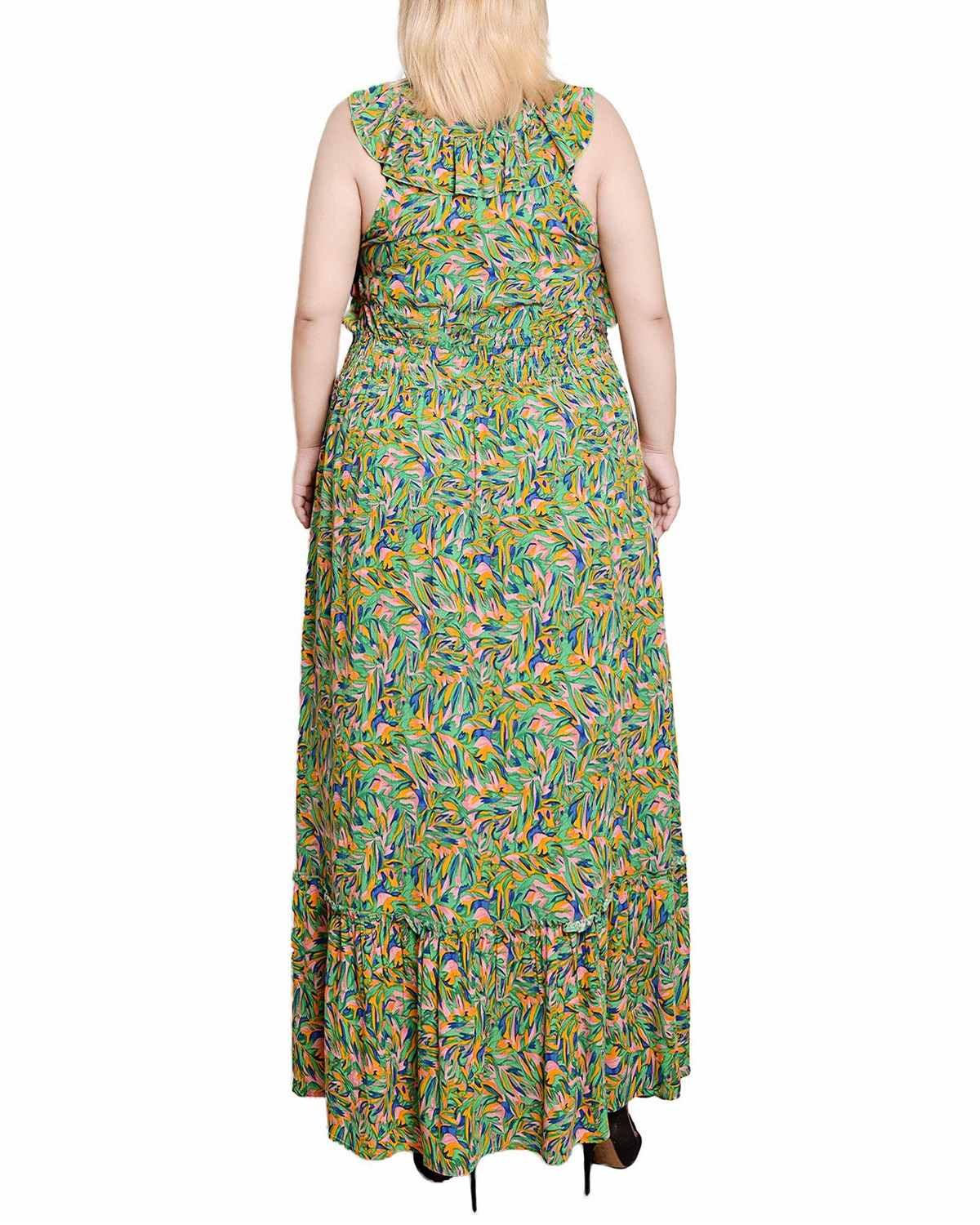 Elevate your wardrobe with this stunning chiffon maxi dress. It features a deep v-neckline with delicate ruffle details, a smocked waist that accentuates your figure, and a tiered hem for a playful touch. Perfect for a fun, flirty, and fashion-forward look, this versatile dress is ideal for both work and casual outings with friends and family. Embrace effortless elegance and make a statement wherever you go! Length 54 in. Fabrication 100% rayon.