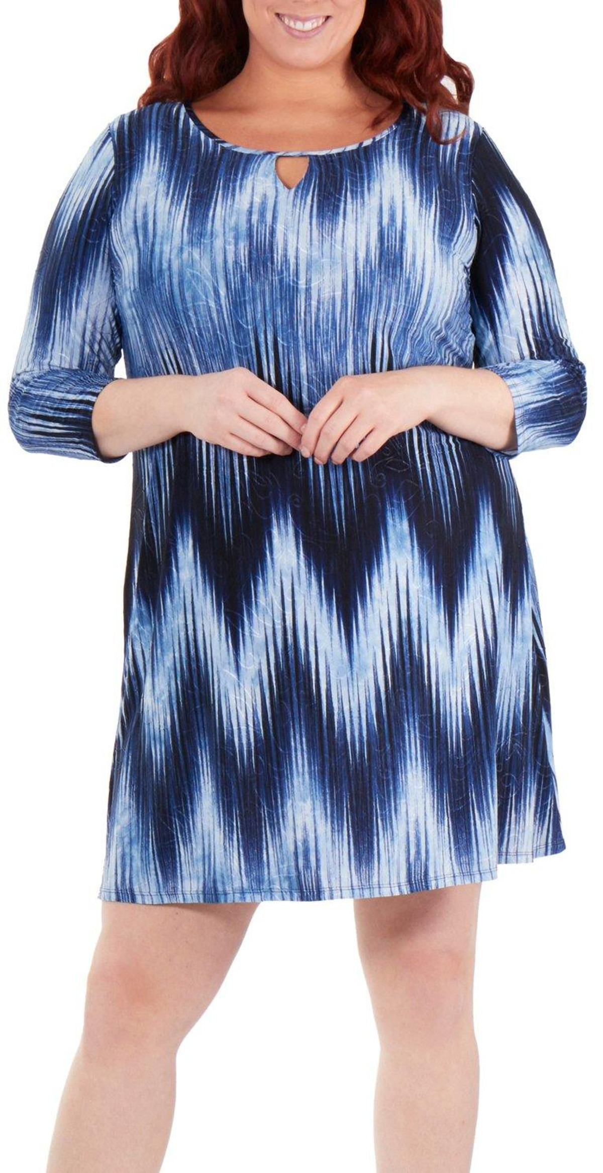 With an abstract chevron print, this plus size shift dress from NY Collection offers a decorative keyhole and 3/4 sleeves. Measures approximately 36“ in length.