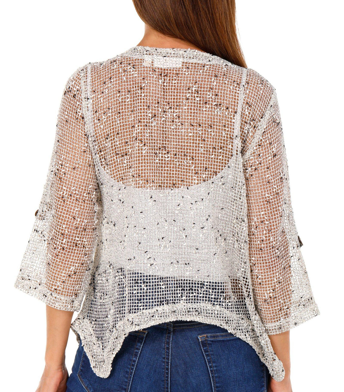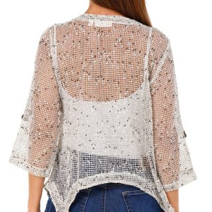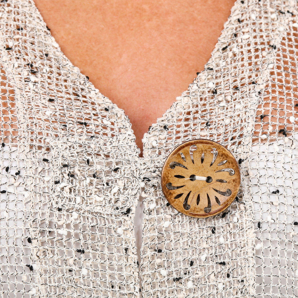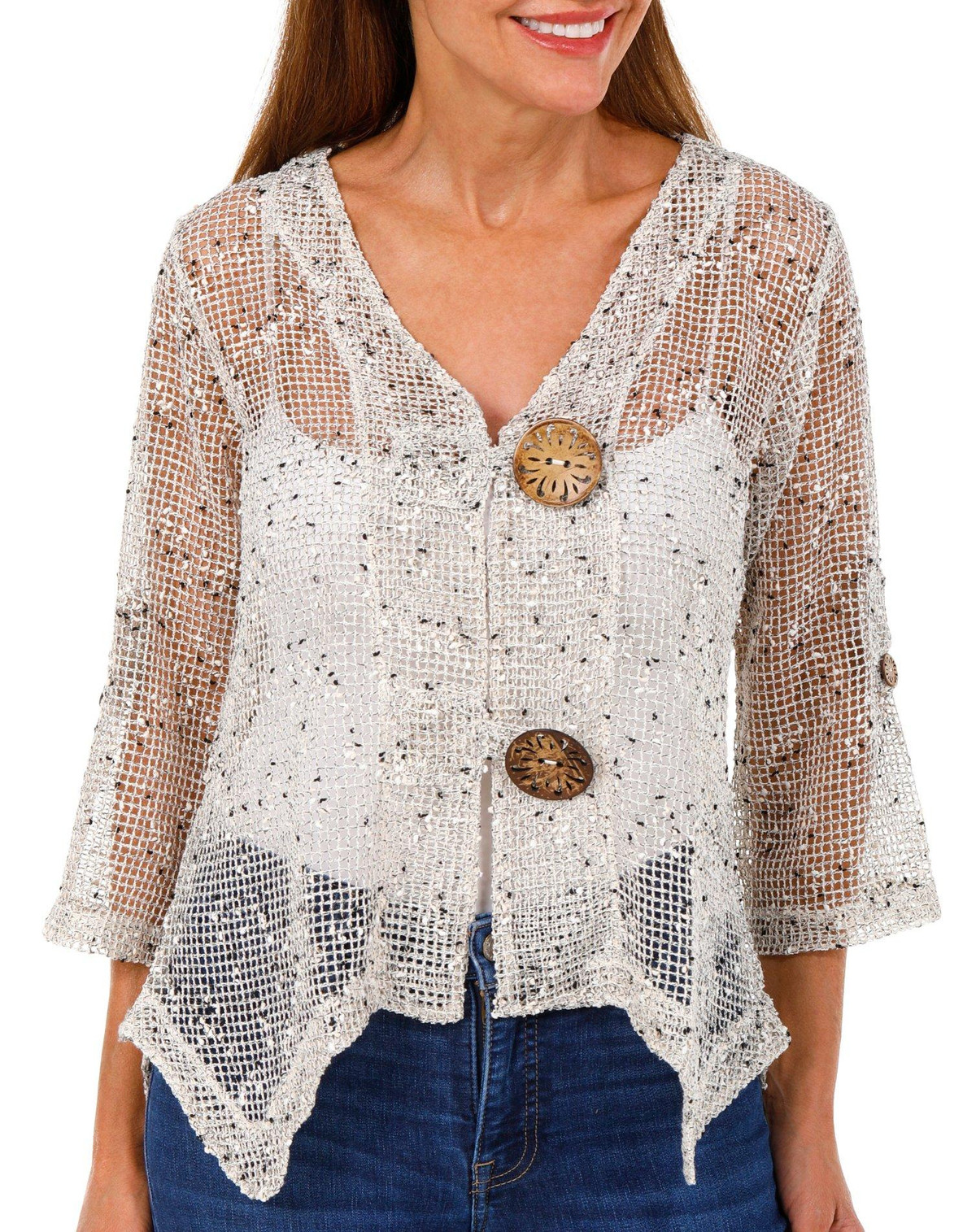This women’s knit top features 3/4 sleeves, a double coconut button front closure, and an open knit design. Light and textured, it offers a relaxed yet stylish look perfect for layering in any season.